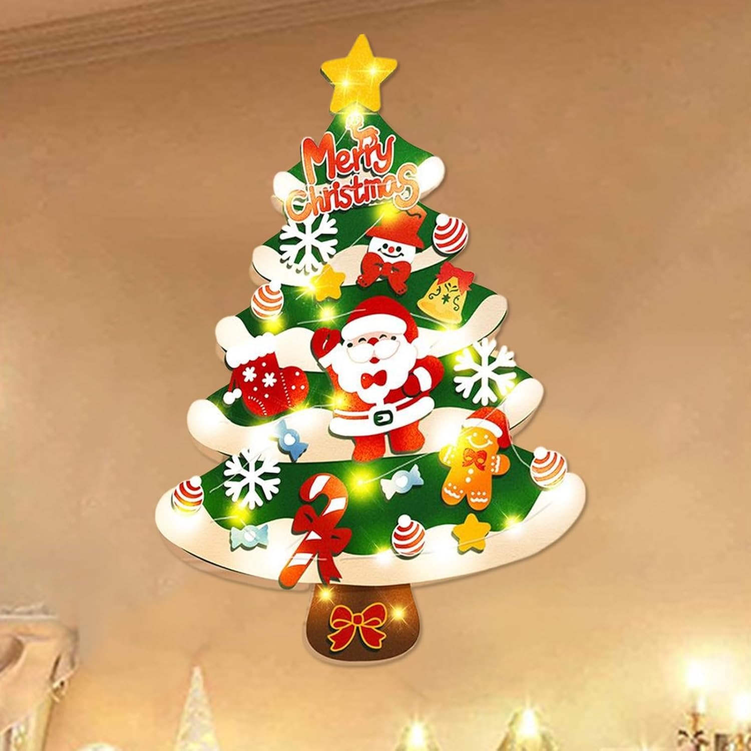 Gioco Regolabile e Creativo: Progettato per il gioco creativo manuale, l'albero di Natale in feltro consente di esplorare l'immaginazione e affinare le capacità motorie fini sistemando 23 incantevoli e integrando un display di luci a filo da 5 metri. Crea esperienze memorabili durante festività o attività invernali indoor, offrendo ore di divertimento educativo e decorativo per tutta la famiglia. Centrotavola Festivo Accattivante: L'albero di Natale per bambini piccoli presenta un display festivo 3D che crea un aspetto decorativo stratificato, rendendolo un centrotavola festivo attraente per qualsiasi ambiente; con un'altezza di 99 cm, esalta l'atmosfera stagionale e offre un modo sicuro e coinvolgente per i più piccoli di godere dello spirito natalizio in soggiorno o zone gioco durante le feste di Natale, aggiungendo un tocco magico alle decorazioni per le vacanze. Preparazione Veloce: L'albero di Natale per bambini è dotato di un kit pronto da montare che include componenti pre-ordinati e permette una decorazione con illuminazione immediata senza passaggi complicati, assicurando un divertimento senza stress durante eventi familiari o attività scolastiche per creare un'atmosfera natalizia in modo semplice e veloce, ideale per aggiungere gioia e spirito festivo senza sforzo. Costruzione : Progettato con feltro di alta qualità, questo albero di Natale per bambini mantiene la sua forma con l'uso prolungato, offrendo una decorazione duratura che favorisce il gioco creativo senza compromettere sicurezza o comfort in qualsiasi ambiente stagionale, per decorazioni ripetute durante le festività in casa o asili. Soluzione Montaggio : Questo albero di Natale in feltro per bambini fornisce un facile montaggio a muro con una cintura di fissaggio senza trapano sicura, assicurando una soluzione che mantiene la casa ordinata e adatta ai bambini per tutto il periodo festivo. L'installazione semplice e senza complicazioni promuove un ambiente nataliero sicuro e piacevole, ideale per famiglie che cercano praticità e divertimento senza occupare spazio a pavimento in aree vivibili o camerett