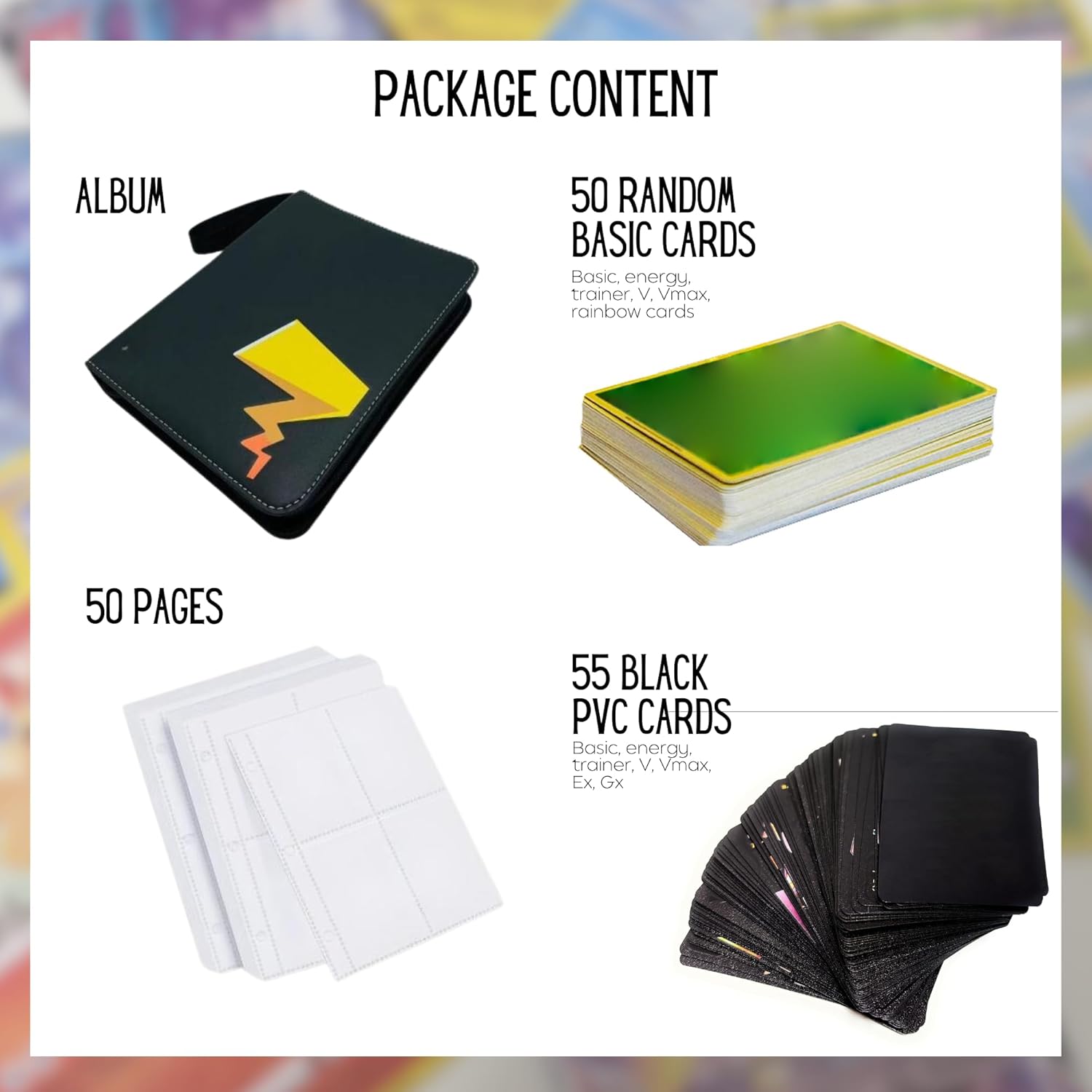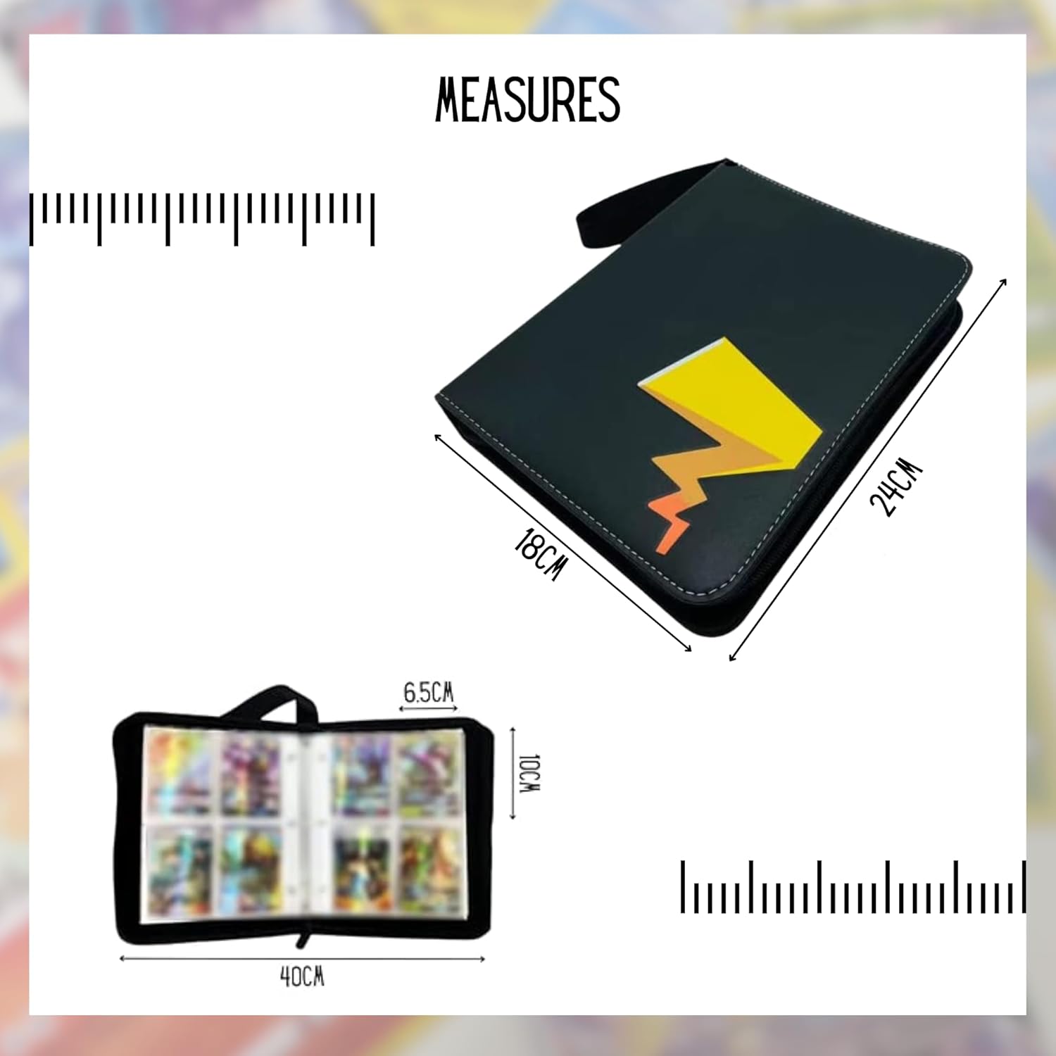 💼 ALBUM DELLE CARTE: album con cerniera che include 100 carte. Scatola da 55 carte in PVC nero e 5 buste da 10 carte in cartoncino casuali (Basic, Trainer, Energy, Vmax, V, EX, GX) per facilitare la compilazione del tuo album! 🃏 MATERIALI: Realizzati in ecopelle e dotati di una cerniera che ti assicura di non perdere le tue carte se fuoriescono o cadono accidentalmente dalle copertine degli album. 🎒 PORTATILE: Le dimensioni dell'album (24x18x4,3 cm), la sua tracolla e il suo moschettone ti permettono di trasportare facilmente il tuo album a scuola, a casa dei tuoi amici o in qualsiasi altro posto dove vuoi giocare a carte, appendendolo agli zaini, ai vestiti o portandolo in mano. 🎒 SCOMPARTI IMPERMEABILI: Le buste porta carte sono realizzate in plastica impermeabile, quindi questo album sarà molto utile per proteggere le tue preziose carte collezionabili da fuoriuscite accidentali di liquidi. 🃏 400 CARTE IN 50 PAGINE: L'album è composto da 50 pagine, nelle quali puoi riporre 8 carte di dimensioni standard (6,5x10 cm) fronte-retro, per un totale di 400 carte o carte collezionabili.