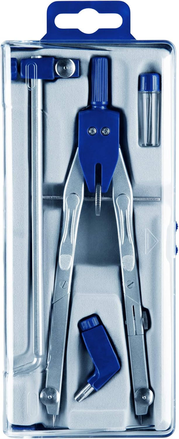 Chi cerca un compasso con molti campi di applicazione, sarà sicuramente entusiasta del compasso d'argento dell'azienda Alco Questo compasso viene fornito in una custodia trasparente in plastica rigida con foratura europea Con questo fantastico compasso si può disegnare al massimo un cerchio con diametro di 38 cm Grazie al suo pratico mandrino centrale, è possibile effettuare anche regolazioni di precisione Per un campo di applicazione ancora maggiore, questo compasso è dotato anche di una pinza di prolunga