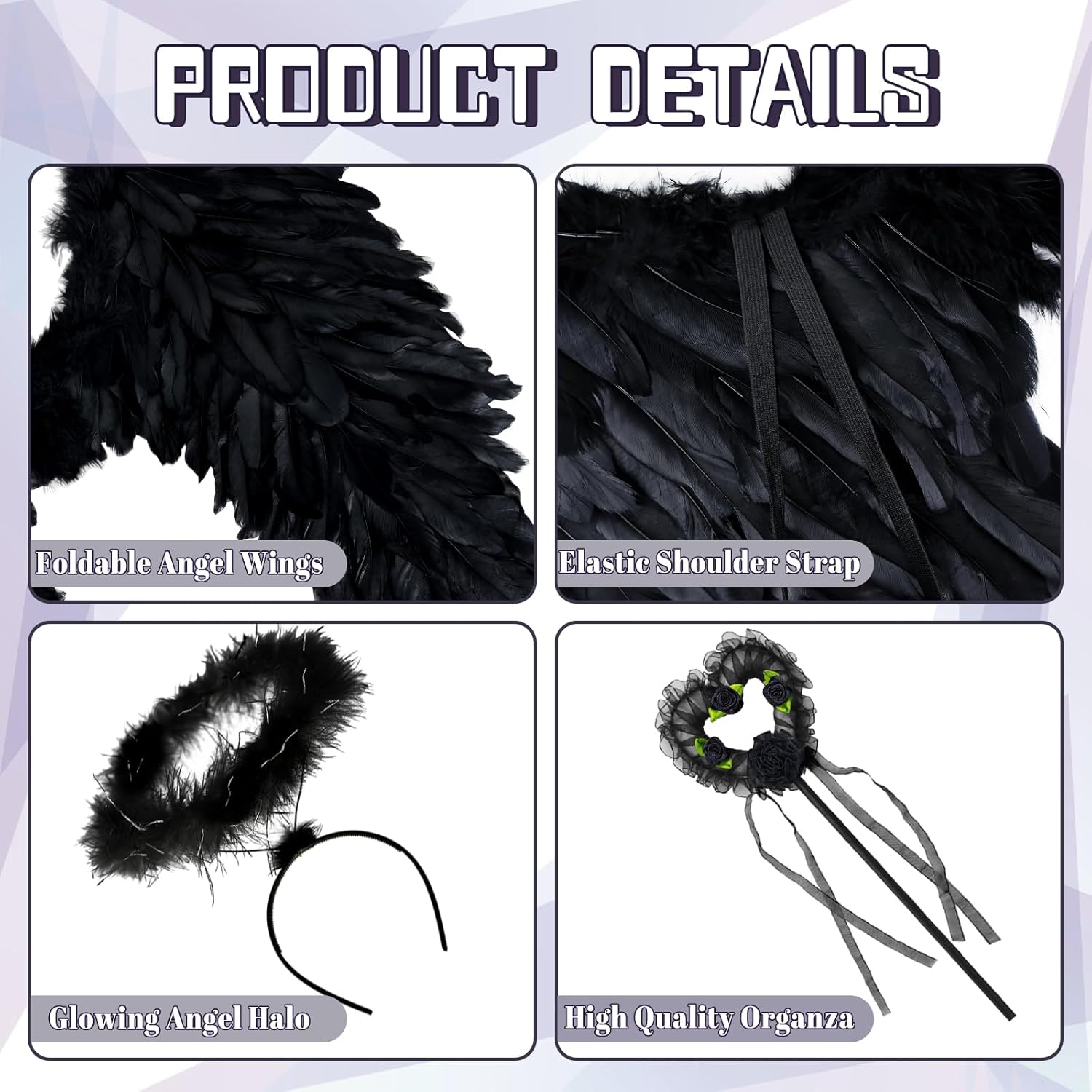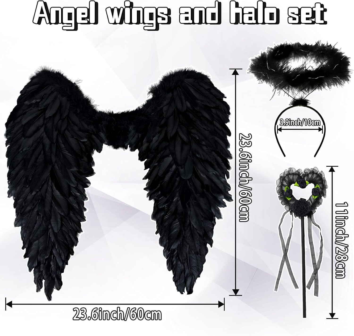 SET ALI D'ANGELO E AUREOLA - Le ali d'angelo e gli accessori d'angelo sono perfetti per il cosplay della festa di Halloween, per essere un bellissimo angelo e per partecipare a vari eventi. Il set ali d'angelo e aureola comprende ali d'angelo, aureola d'angelo e bacchetta magica. Ali d'angelo nere e ali d'angelo bianche da scegliere, il costume da angelo è adatto per adulti, donne e bambini. MATERIA DI ALTA QUALITÀ - Le ali d'angelo sono realizzate a mano con piume bianche originali di alta qualità, leggere e senza alcuna sensazione di peso quando indossate. Il set di ali d'angelo e aureola è perfetto per ragazze, bambini e donne. Le ali d'angelo nere e le ali d'angelo bianche non sbiadiscono, sono morbide e confortevoli, l'interno delle ali d'angelo è fissato con un filo, resistente e non facilmente deformabile. COMODO DA INDOSSARE - Le ali d'angelo con elastico, le ali d'angelo e l'aureola possono essere regolate liberamente, l'ala d'angelo è regolabile al centro e può essere indossata in due modi diversi, comoda da indossare per adulti e bambini, leggera, non cade. Gli spallacci elasticizzati del costume da angelo permettono di indossare le ali del costume da angelo più facilmente. ACCESSORIO PERFETTO PER IL VESTITO DA PARTY - Ideale come costume da angelo per una festa di Halloween o per travestirsi, come costume da angelo caduto per un saggio di danza o una recita scolastica, o come accessorio da angelo per le ragazze dei fiori al tuo matrimonio. MIGLIOR REGALO - Le nostre ali d'angelo e l'aureola sono il regalo perfetto per i vostri amici, familiari, moglie o fidanzata. I bellissimi accessori da angelo sono adatti per le rappresentazioni in costume di Halloween, le feste di compleanno, il Natale, il ballo di fine anno, i servizi fotografici e altre occasioni. È possibile cambiare il colore preferito con il fai-da-te.