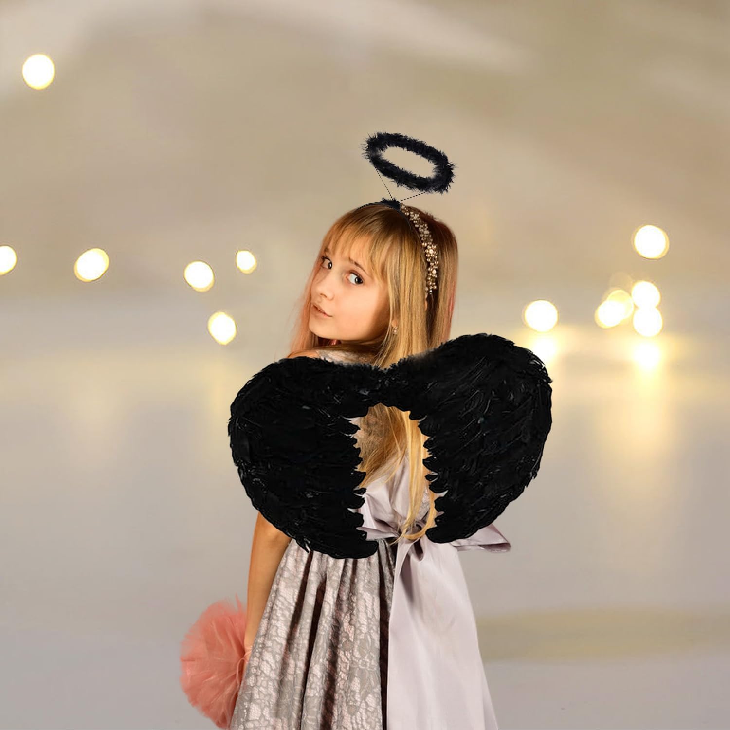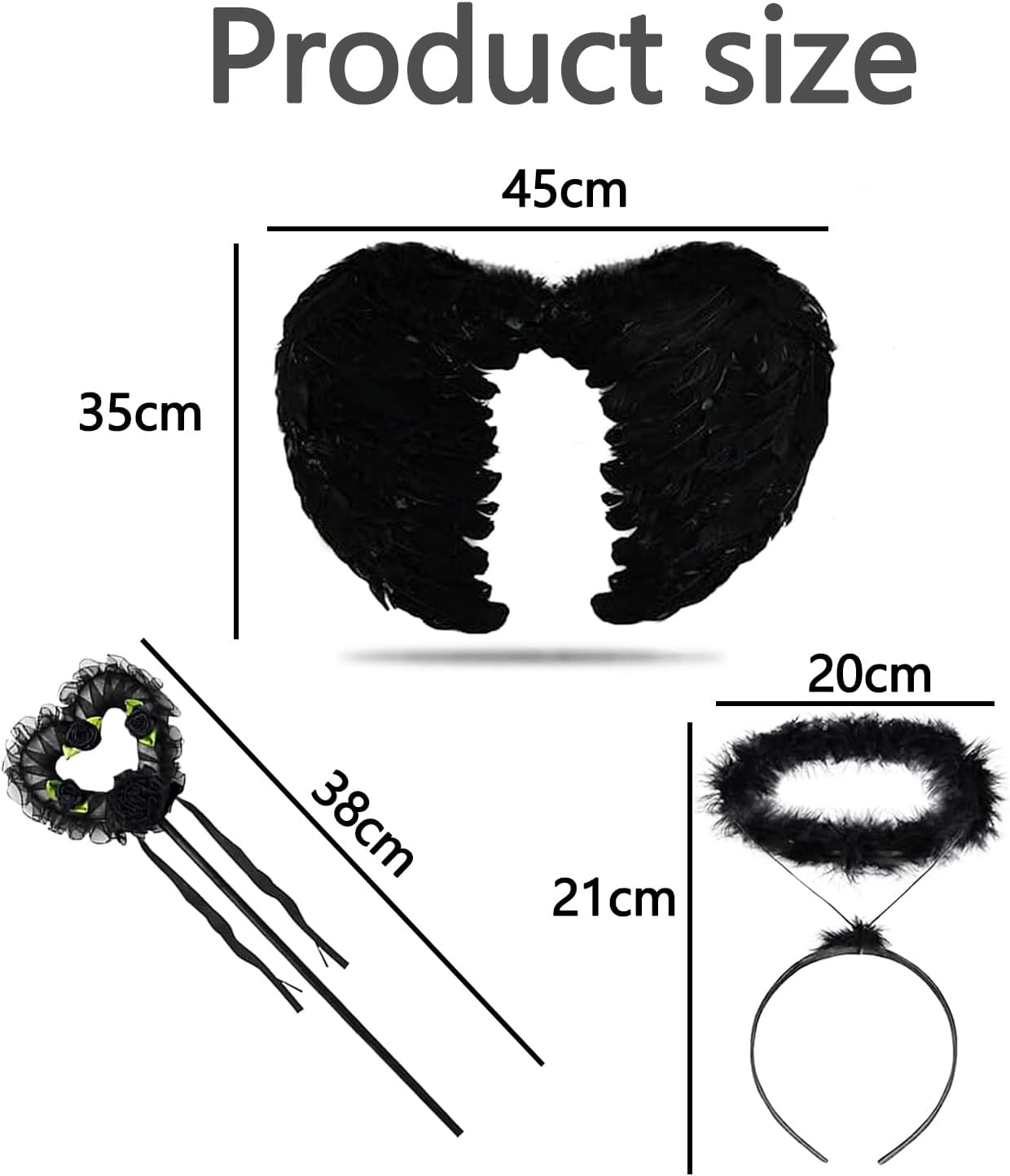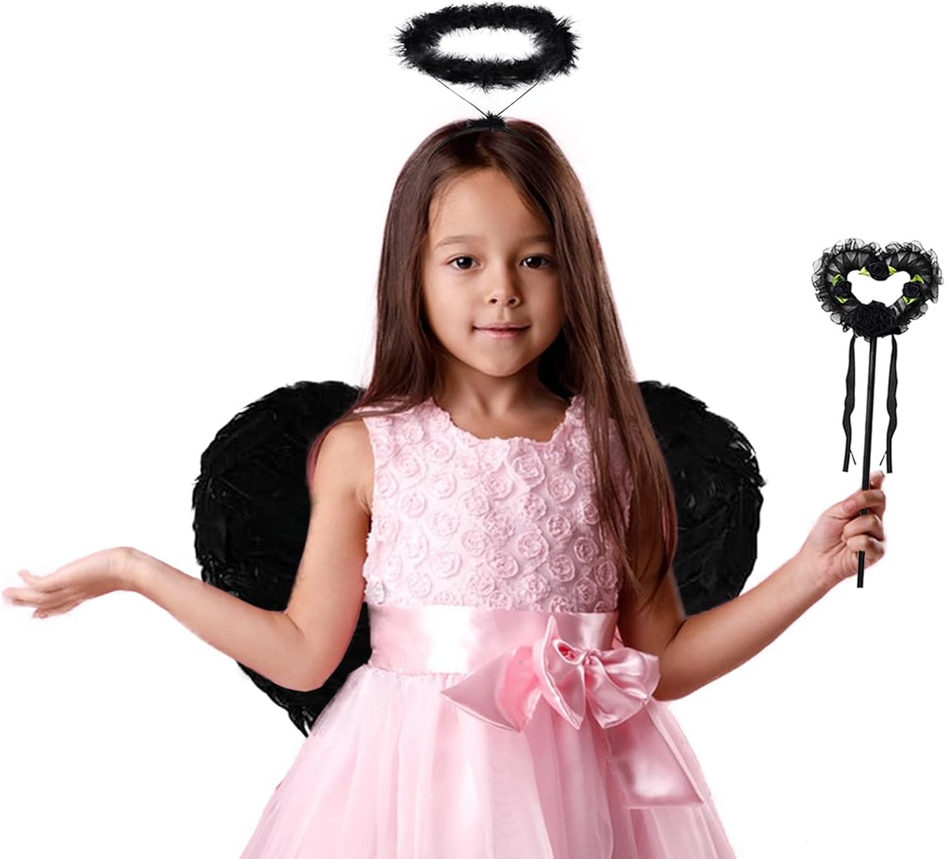 Ali d'Angelo, Bianco Nero Ali d'Angelo con Aureola e Bacchetta Magica, Ali d'Angelo per Donne Ragazze, Angelo Diavolo Fate, Costume Accessorio per Halloween, Carnevale, Cosplay
