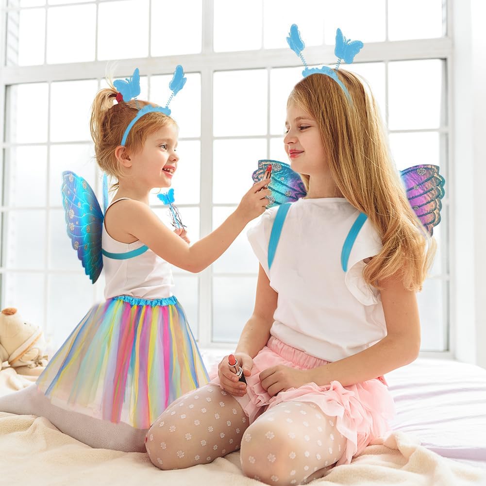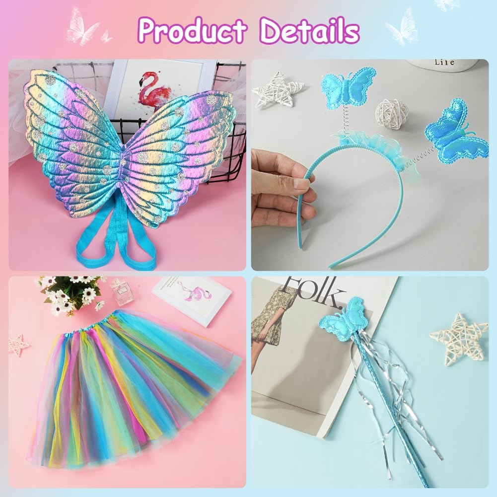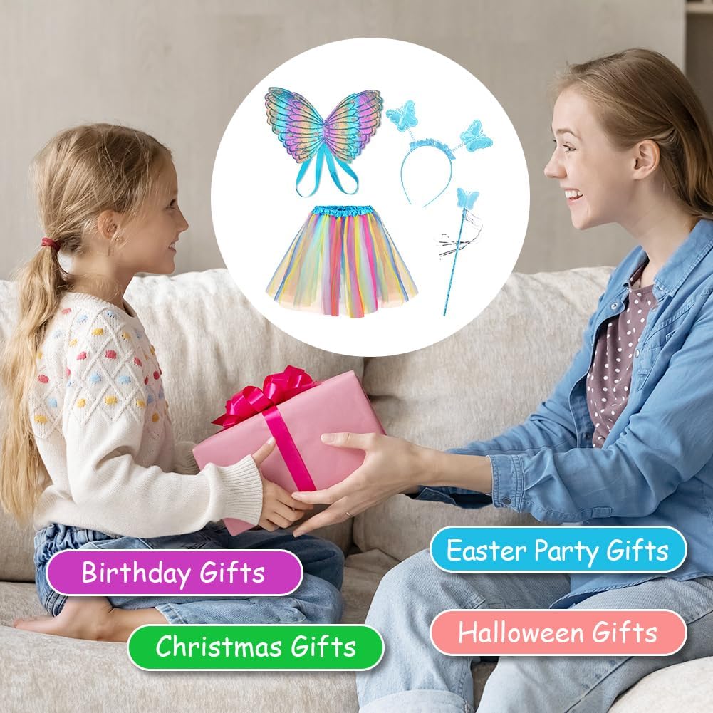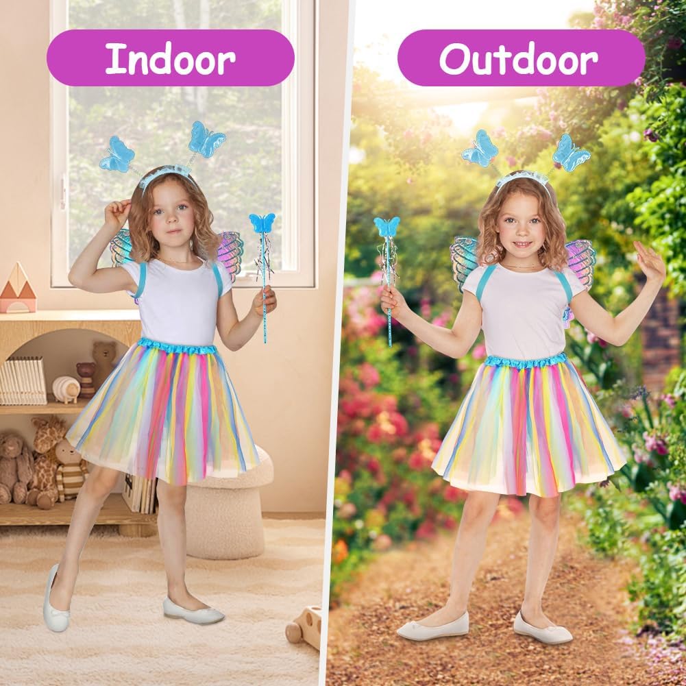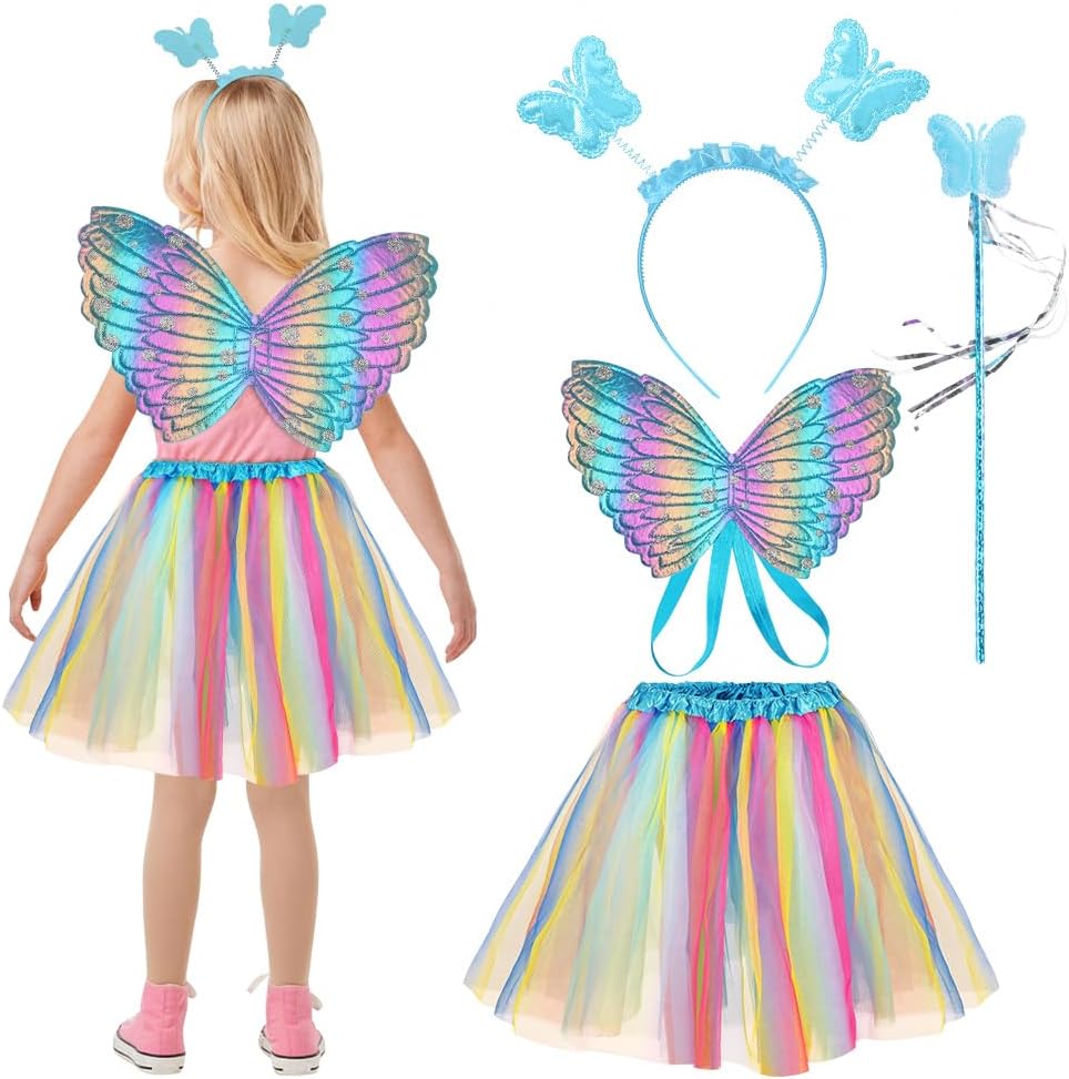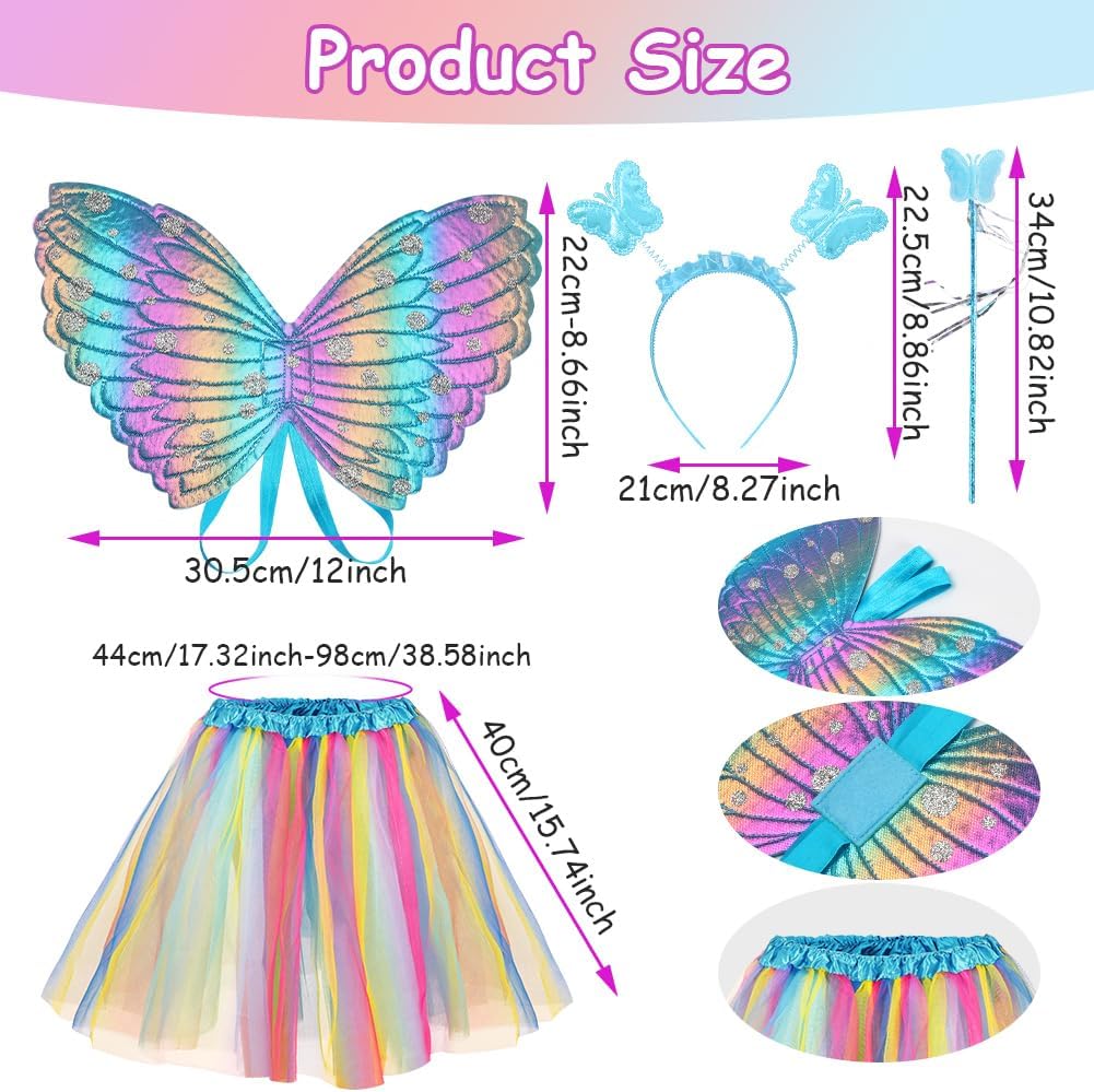 SET DI ALI DI FARFALLA SUPER CONVENIENTI: 1 ala di farfalla, 1 bacchetta magica, 1 tiara di farfalla, 1 gonna, dai colori vivaci e piena di vitalità, molto apprezzata dalle bambine ALTA QUALITÀ: Ali da farfalla per bambini realizzate in materiale 100% poliestere di alta qualità, colori brillanti, morbide al tatto, leggere da indossare, cinghie elastiche sulle spalle, che ti permettono di muoverti facilmente, squisite la lavorazione artigianale garantisce la durabilità del capo. Resistente e rimane in buone condizioni anche dopo molteplici usi e lavaggi ACCESSORI PER FESTE: l'abito della ragazza adotta uno stile di design a tema farfalla, con un copricapo, un bastone e ali che si abbinano al tema, rendendo il sogno della principessa della ragazza realtà, apparendo vivace e carino e distinguendosi dalla massa DIVERTIMENTO SENZA FINE: il design elegante e i colori vivaci delle ali di farfalla faranno sembrare tua figlia una fata delle farfalle estiva, ballando e volando in giro alla festa, scintillando tra la folla, aggiungendo un'atmosfera divertente con un tatuaggio a farfalla, rendila abbagliante AMPIA APPLICAZIONE: Set di ali di farfalla per bambini, perfetto per balletto, costumi da tea party da principessa, servizi fotografici, travestimenti quotidiani, giochi di ruolo, giochi di finzione, giochi di ruolo di Halloween, festival all'aperto, balli studenteschi, recite scolastiche, Pasqua, Natale, ecc