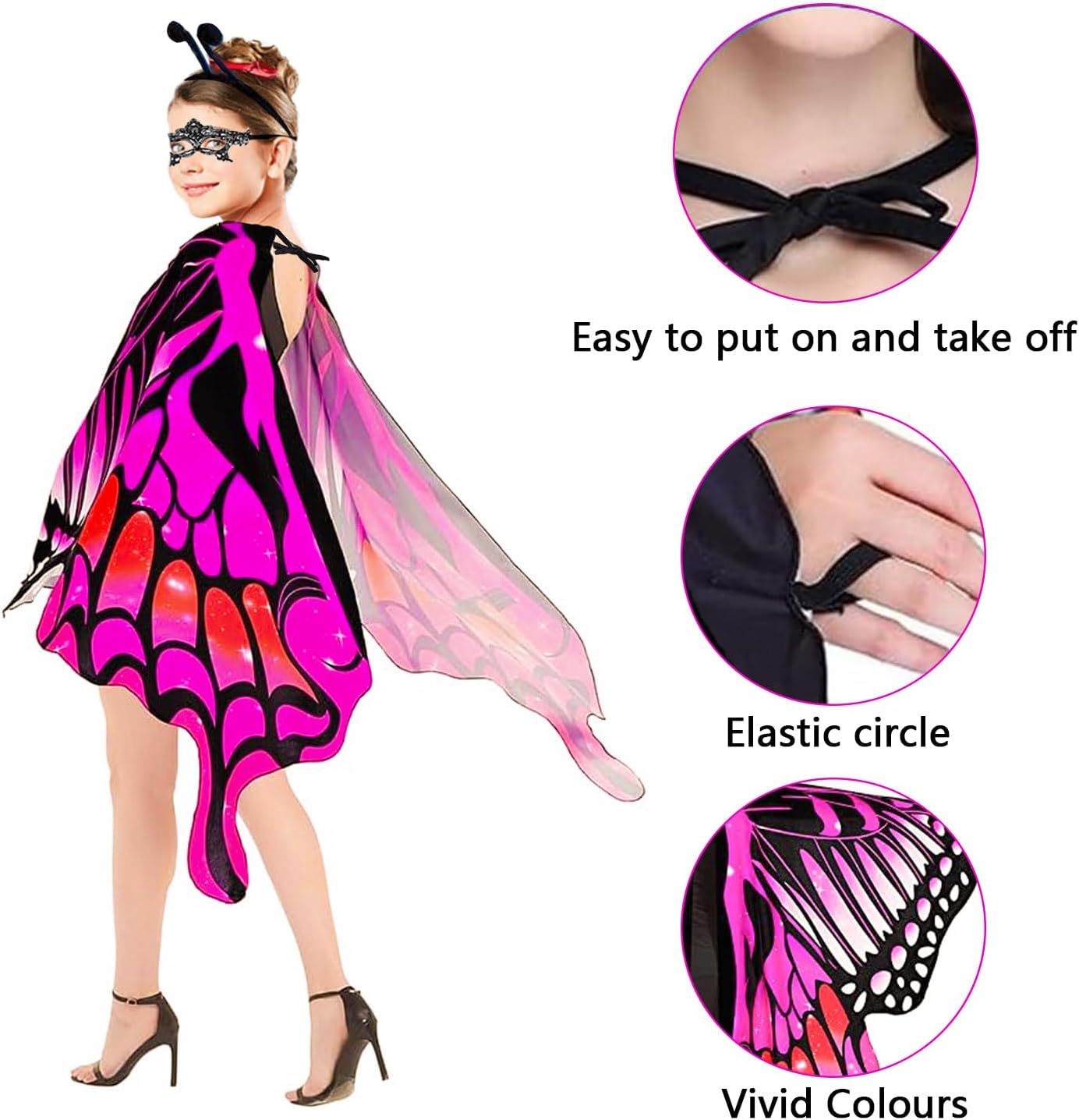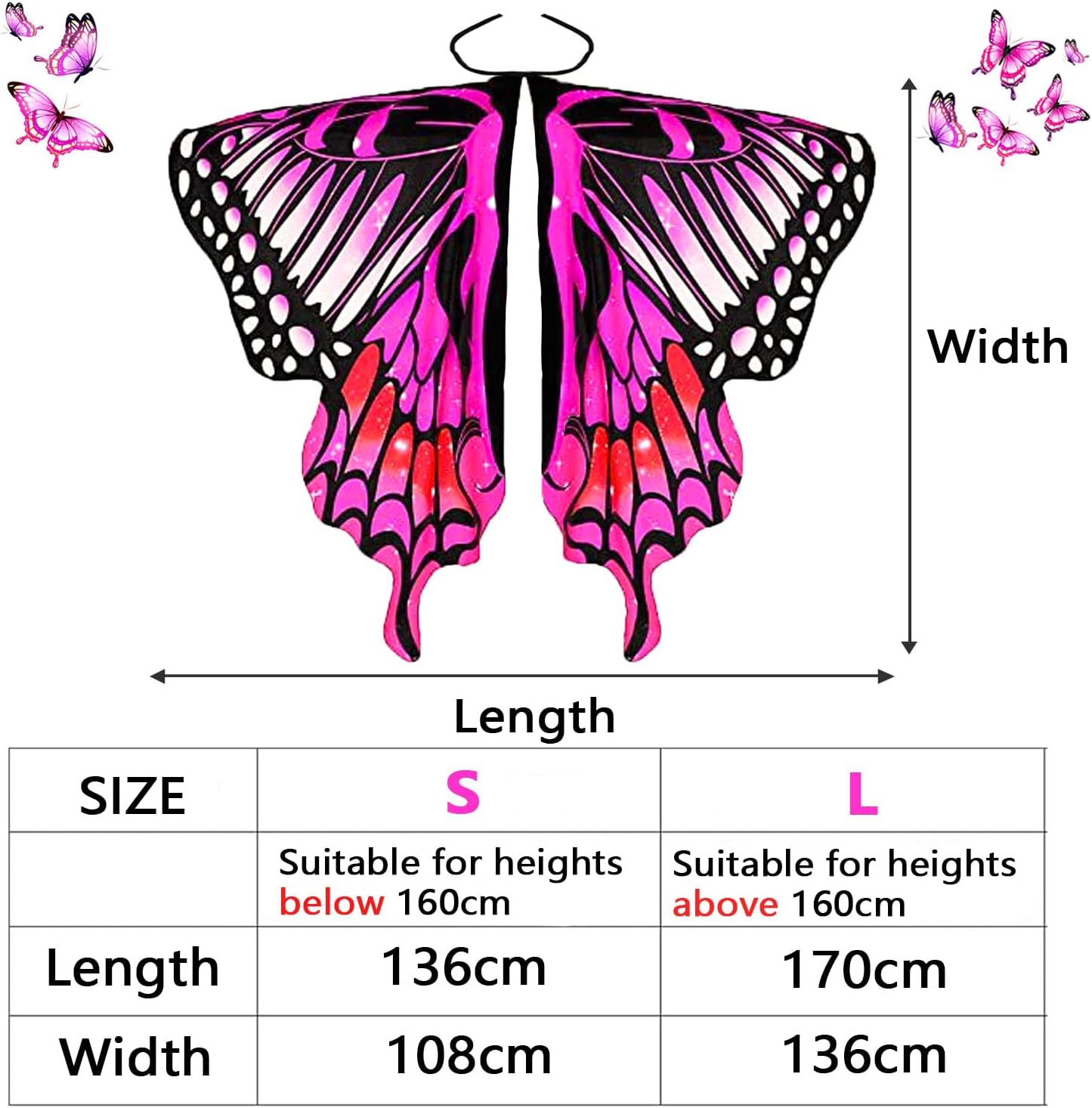 Sehr einfach, aber wirkungsvolle Verkleidung zum Fasching oder einfach für die Verkleidungskiste zum spielen. Mein Kind ist 10 Jahre ca. 135cm groß und ihre passt.der Umgang sowie der Haarreifen sehr gut. Prinzessin Kostüme werden auch langsam un cool, deshalb ist der Schmetterling für uns ideal.