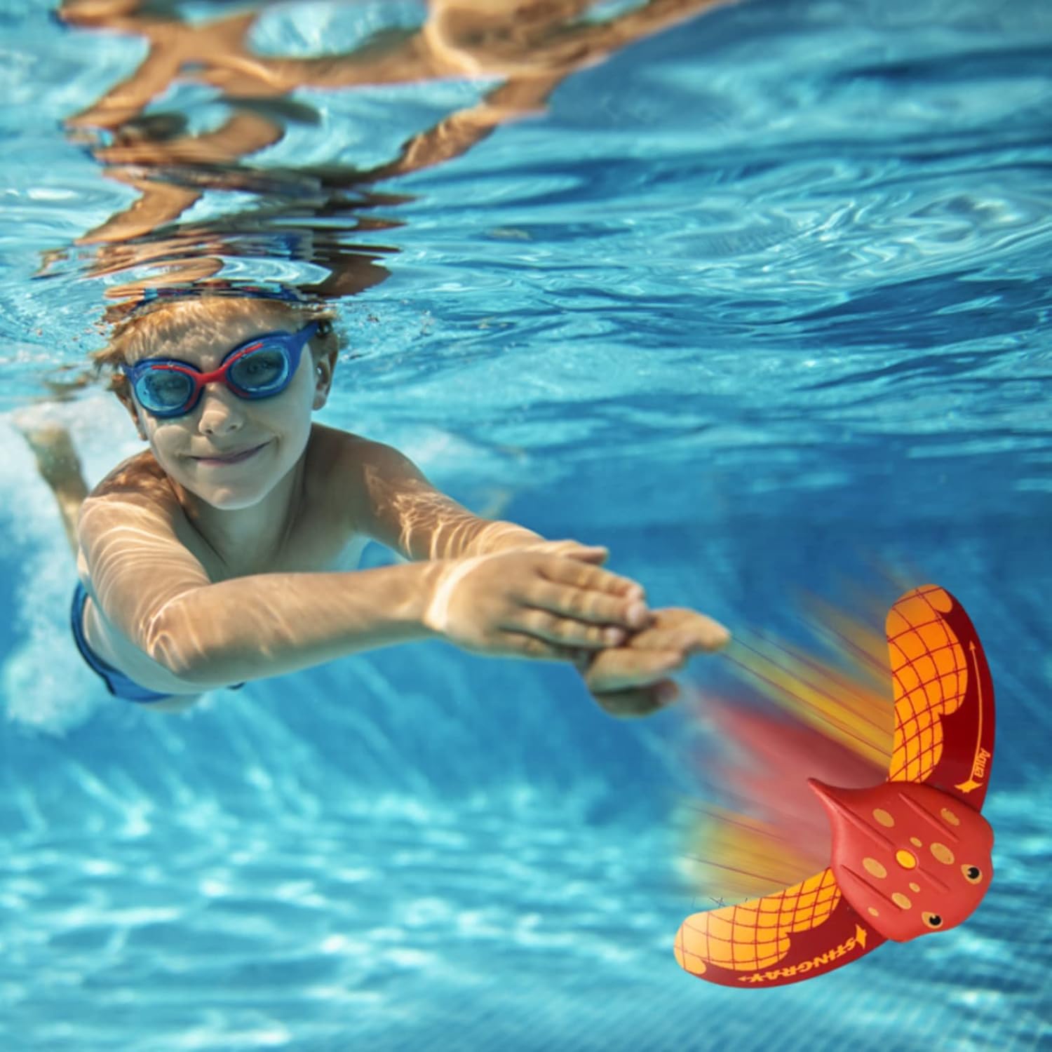 Scivola attraverso l'acqua: il nostro aliante subacqueo Stingray muove con la pressione dell'acqua, spingendosi fino a 50 piedi!.Perfetto per un divertimento estivo senza fine in piscina o in spiaggia. Crea i tuoi schemi di volo: con le pinne regolabili, puoi progettare i tuoi schemi di volo e trasformare una noiosa piscina in una divertente avventura subacquea!.Ottimo sia per bambini che per adulti. Sviluppa abilità di nuoto: il corpo dai colori vivaci e la forma vivida del nostro giocattolo per il nuoto subacqueo attira i più piccoli e può aiutarli a sviluppare abilità di immersione e nuoto. Sicuro e: realizzato con materiale EVA per la flessibilità e una pinna di squalo in materiale PC con una superficie liscia, il nostro giocattolo da piscina per tuffi è sicuro e affidabile per i più piccoli da afferrare e con cui giocare. Divertimento versatile: il nostro giocattolo subacqueo è perfetto per piscine, feste in piscina, piscine gonfiabili, spiagge, parchi acquatici ed è ideale per i bambini di età superiore ai 12 anni..Preparatevi per un'estate piena di divertimento e giochi!