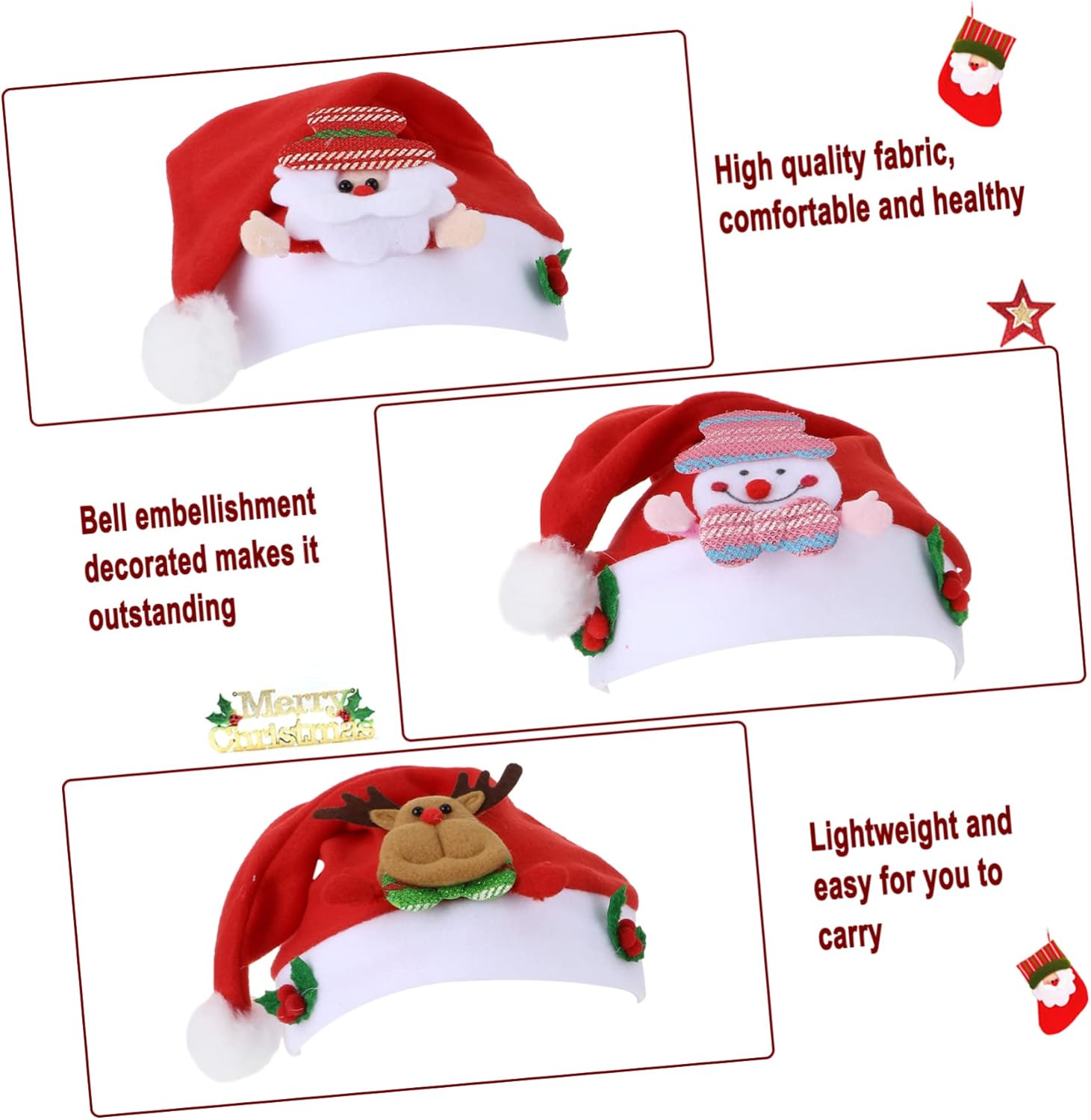 Descrizione prodotto include 3 cappelli Natale Caratteristiche - Dimensioni: circa 30,00X24,50X1,00 cm/11,79X9,63X0,39 pollici Cappellini natalizi per . - Colore: Articoli natalizi assortiti. - Materiale: Cappello da festa Natale in stoffa. -Informazioni sul prodotto: Cappello natalizio per - Decora i tuoi in adorabile e accattivante durante gli natalizi all'aperto con il cappello per la festa Natale per . - fattura, curata in ogni dettaglio per conferire al cappello natalizio per un aspetto meraviglioso. - Questo cappello ha una consistenza ed è da indossare, puoi acquistarlo in tranquillità da Festival Supplies. - Realizzato con materiali qualità, fattura e non facilmente danneggiabile. Cappellini natalizi per . - Possono essere utilizzati per feste Natale, addii al celibato, spettacoli teatrali, ecc. Cappellini per . Informazioni sulle merci Cappello invernale per È un accessorio per feste in maschera, , feste Natale, vacanze invernali, feste Capodanno, cosplay, feste a tema, ecc. Accessorio per I tuoi possono indossarlo festa Natale o semplicemente per intrattenimento. Cappello per festa Natale Questo cappello Natale per è fatto e adorabile Avviso di sicurezza 1