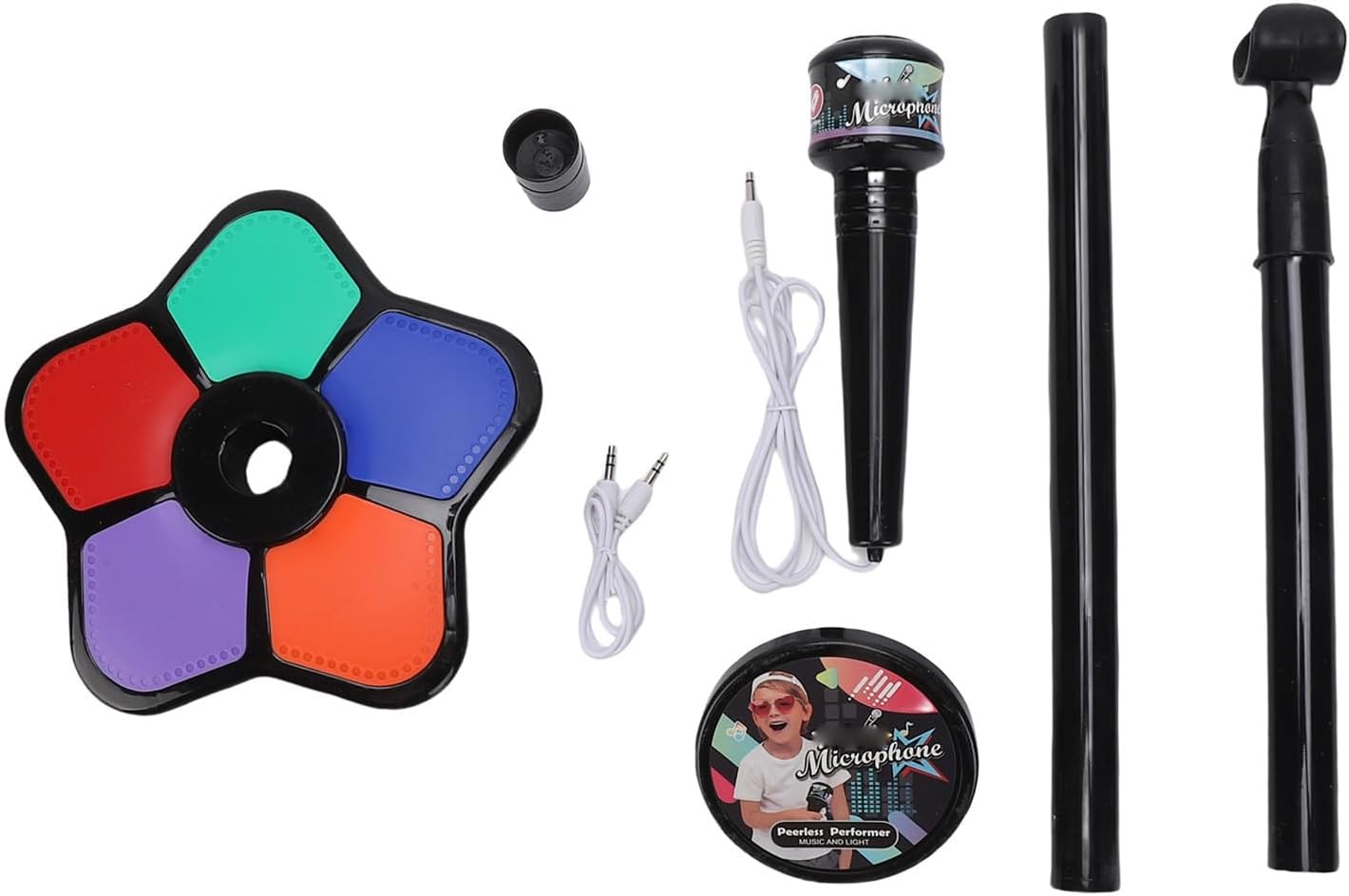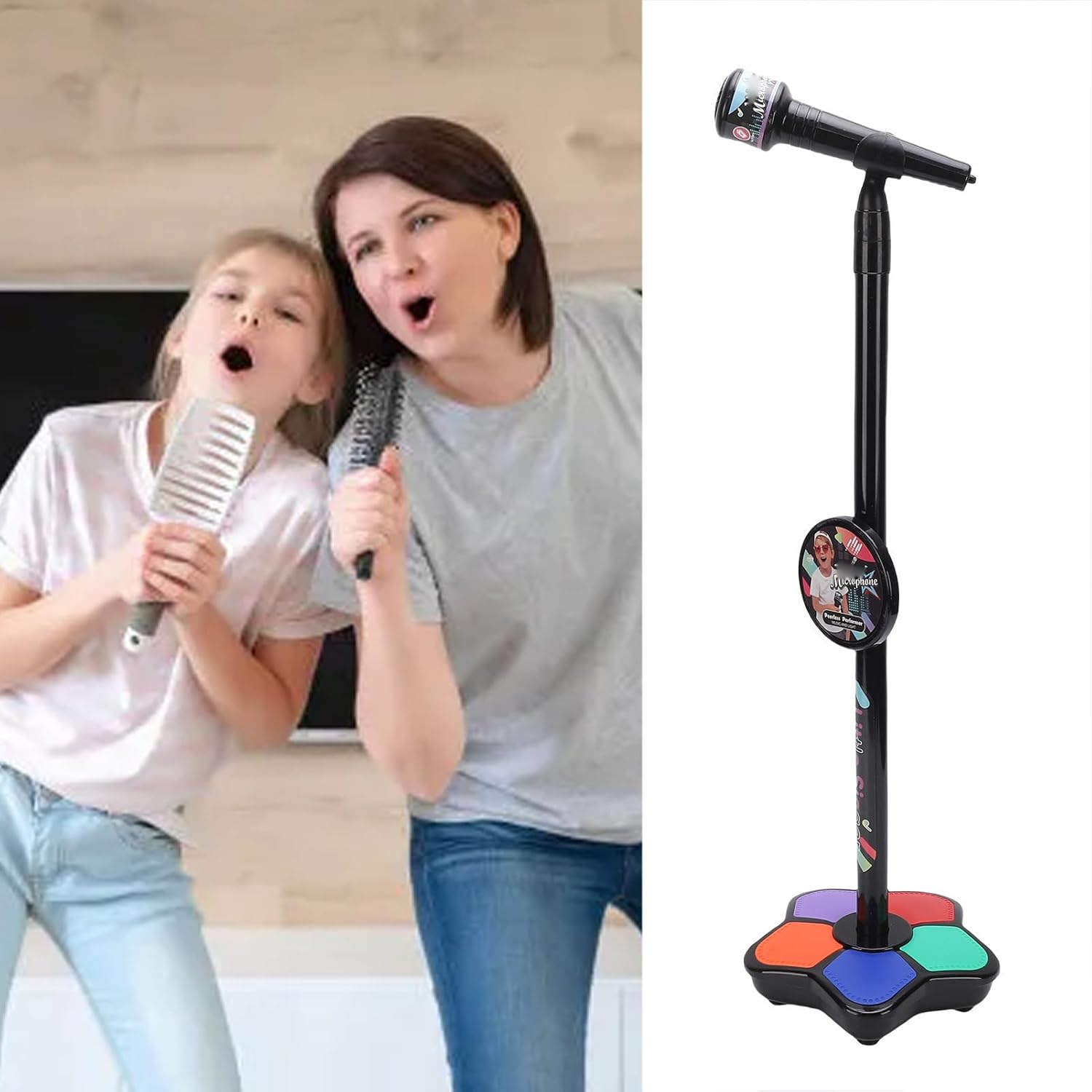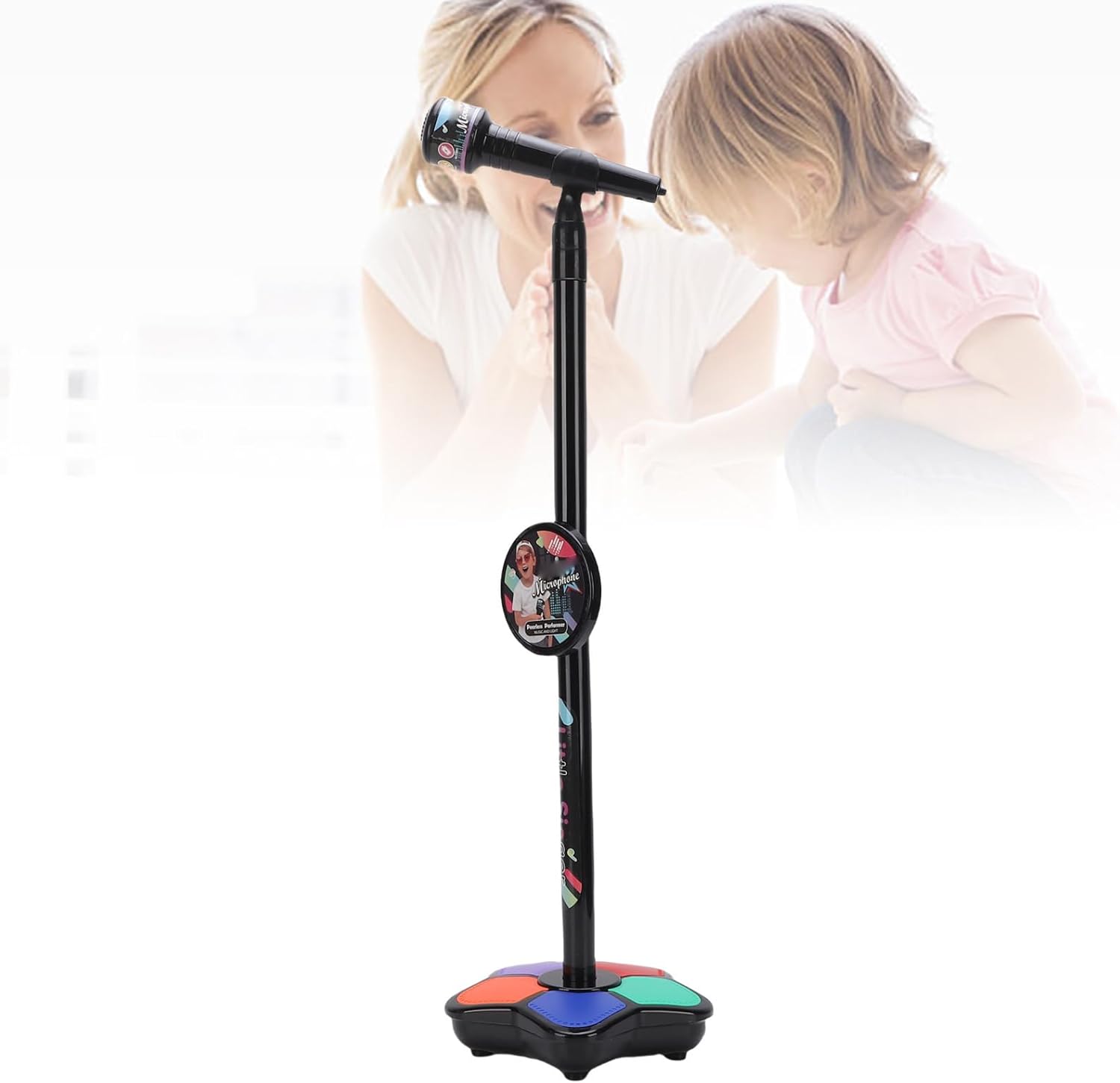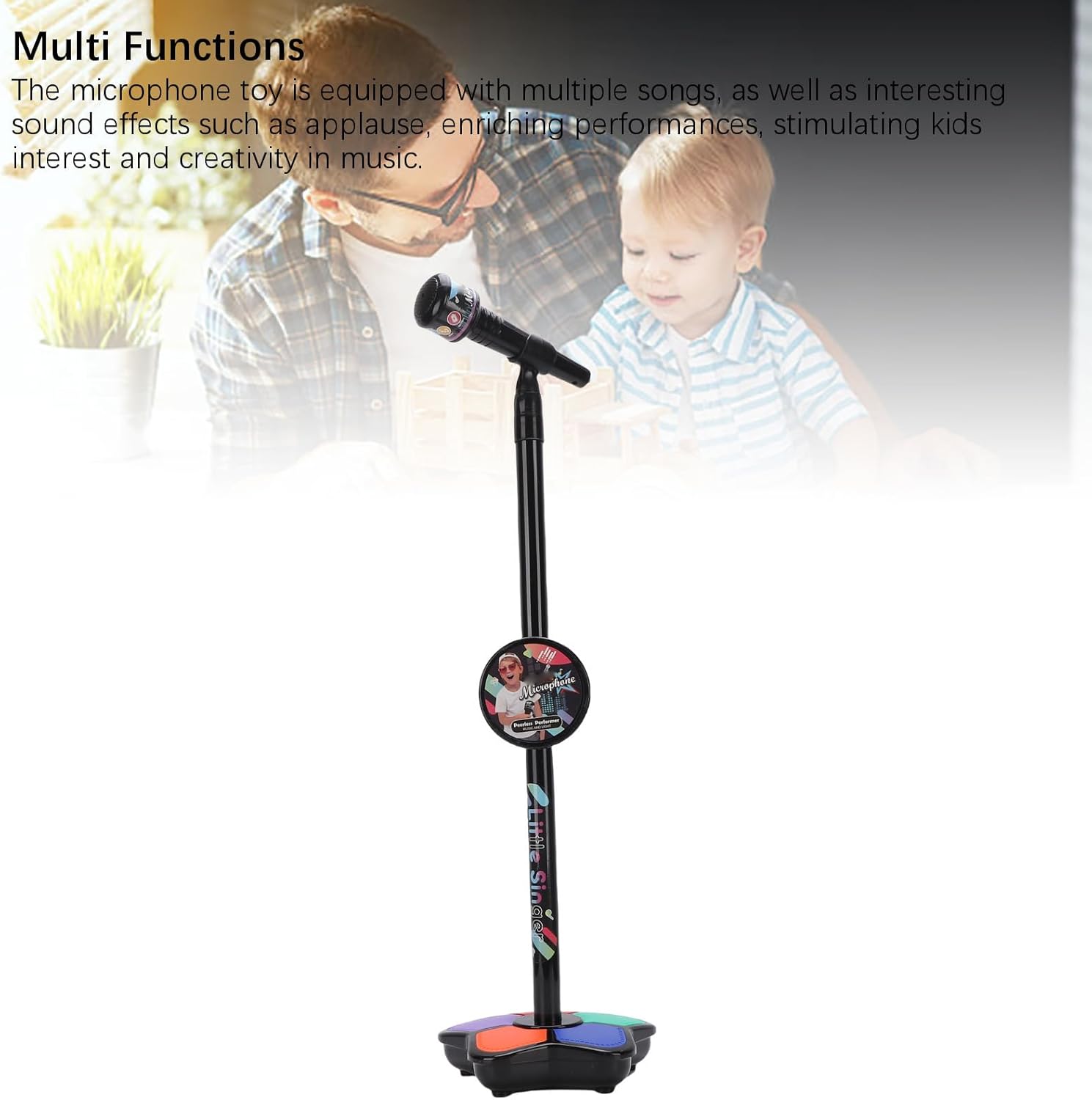 Luci colorate: questo giocattolo per microfoni per bambini presenta diverse luci colorate che lampeggiano con il ritmo quando suonano musica o cantano, aggiungendo divertimento alla performance. La luce è morbida e non abbagliante, adatta a vari ambienti di illuminazione. Funzioni multiple: il giocattolo del microfono è dotato di più brani, nonché interessanti effetti sonori come applausi, arricchi di esibizioni, stimolando l'interesse dei bambini e la creatività nella musica. Altoparlanti chiari: il giocattolo per microfono in piedi ha integrato altoparlanti premium, fornendo un'uscita audio chiara e senza distorsioni, migliorando l'esperienza di . Design ergonomico: progettato con una forma ergonomica su misura per le mani dei bambini, il microfono è facile da afferrare e comodo da usare. L'involucro è realizzato in materiale ABS, robusto e anti -goccia, senza intoppi senza bara. Funzionamento comodo: il microfono in piedi è semplice da funzionare, basta premere il pulsante per cambiare brani, regolare gli effetti della luce del volume o di controllo.