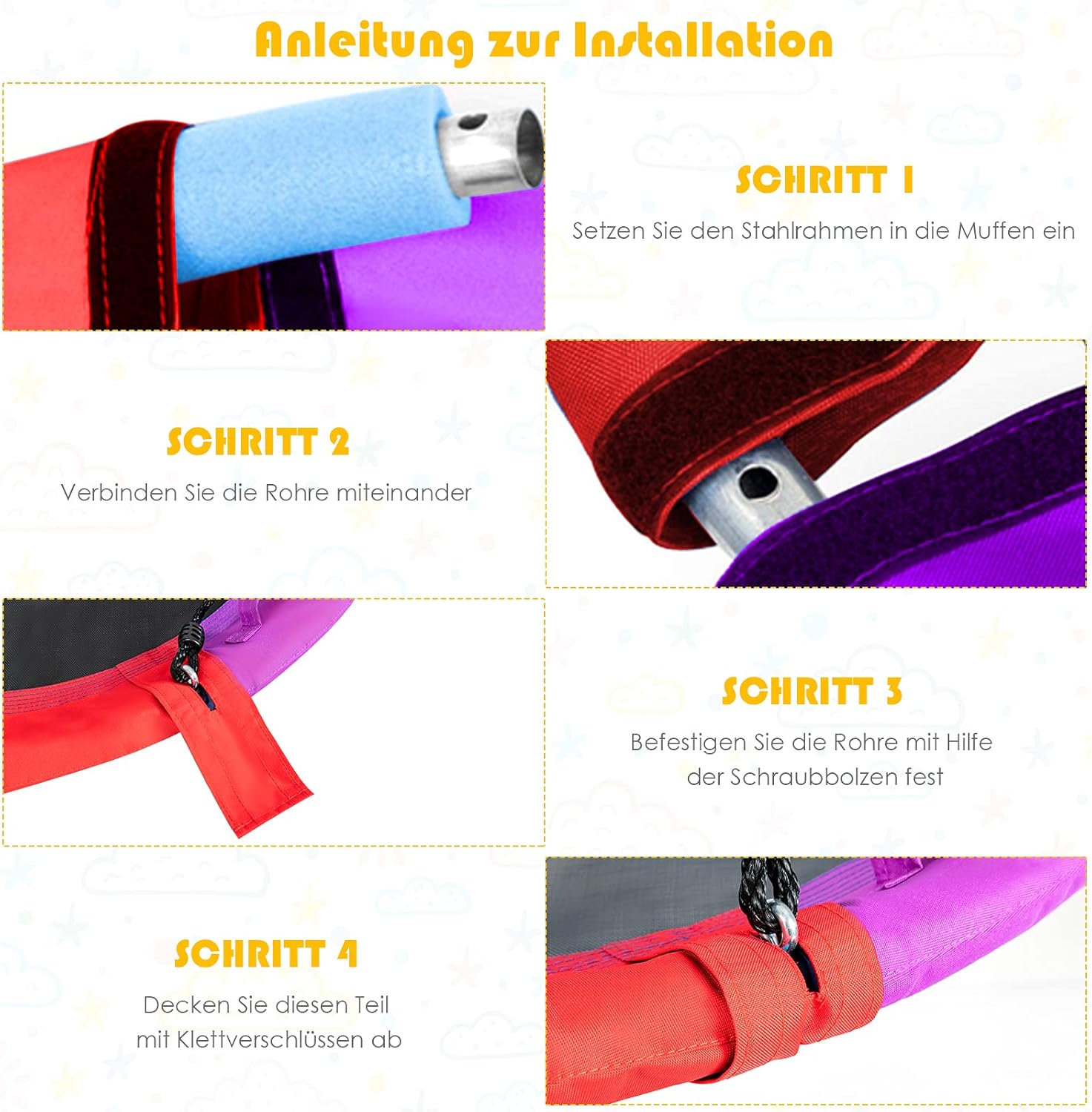 【Altalena a nido da 100 cm】 Il diametro di questa colorata altalena a nido è di 100 cm, il che significa che può ospitare da due a tre bambini. A seconda delle tue esigenze, puoi sdraiarti, sederti sopra o giocare con la famiglia e gli amici. 【Cuscini e maniglie extra】Rispetto a prodotti simili, la nostra altalena a nido è dotata anche di cuscini e 4 maniglie. Anche i cuscini possono essere facilmente sfoderati e lavati. Le maniglie garantiscono una maggiore sicurezza durante l'oscillazione. 【Corde regolabili in altezza】 Le corde di alta qualità sono durevoli e resistenti agli agenti atmosferici e vengono utilizzate per regolare l'altezza dell'altalena da 100 cm a 180 cm. È quindi adatto a tutti i tipi di luoghi e può essere appeso, ad esempio, agli alberi o alle altalene. 【Design sicuro】 Il telaio in acciaio zincato è ricoperto di schiuma per prevenire lesioni. Realizzate in PE, le corde sono anche durevoli e resistenti alle intemperie, proprio come il sedile in tessuto Oxford e PP. L'altalena a nido può essere fissata con moschettoni. 【Regalo perfetto per i bambini】 Se stai ancora cercando un regalo fantastico per tuo figlio, la nostra altalena a nido è una buona scelta. Grazie ad esso i bambini trascorreranno meno tempo davanti allo schermo e più tempo fuori.