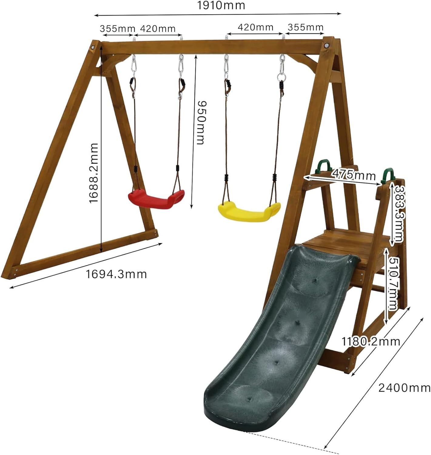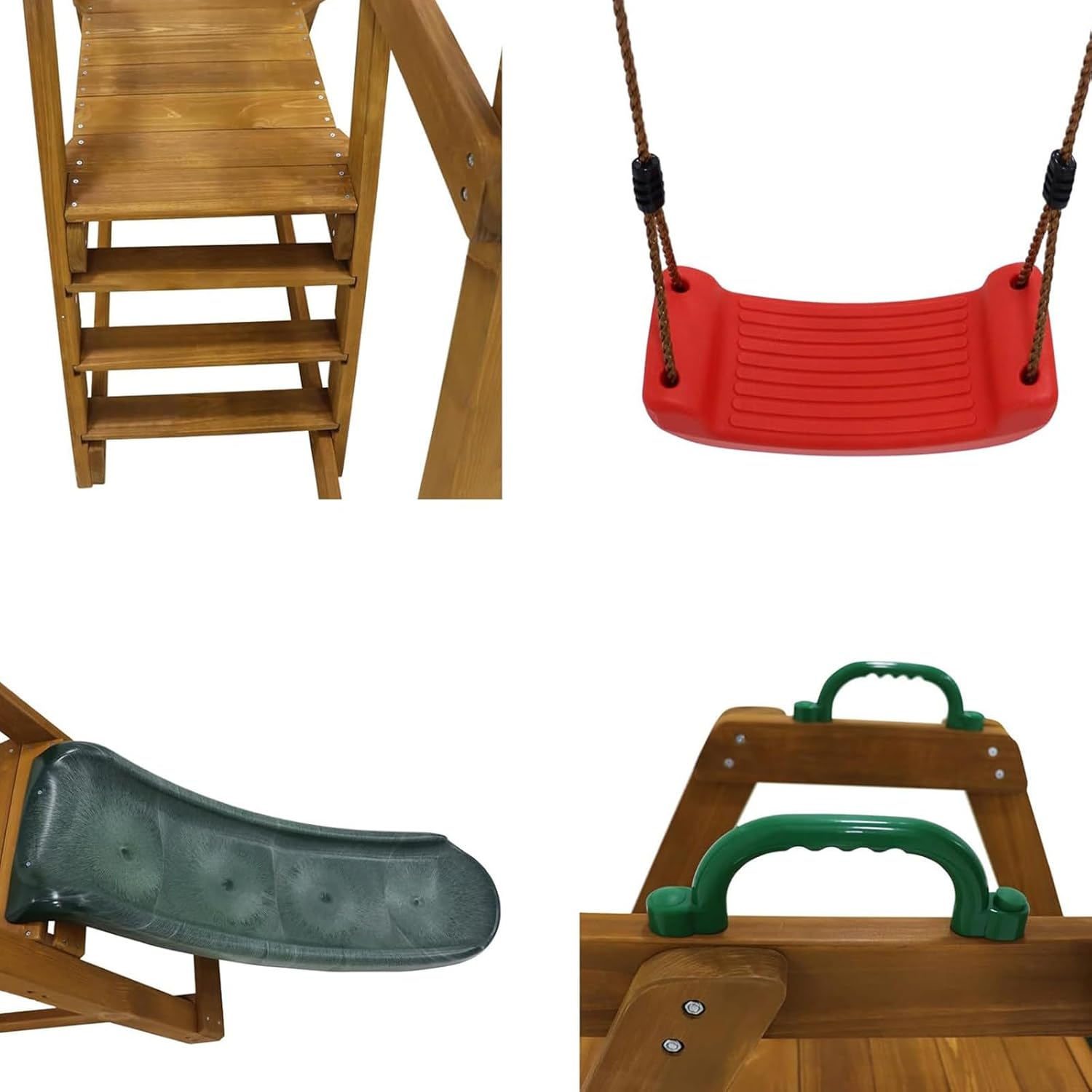 ■【Torre da gioco multifunzionale】Con scivolo integrato, struttura per arrampicata e due altalene, il nostro prodotto trasforma qualsiasi spazio esterno in un emozionante paradiso di gioco. I tuoi bambini possono sviluppare le loro capacità motorie divertendosi. Trasforma il cortile in un luogo pieno di avventure e ricordi indimenticabili! ■【Altalena in legno di alta qualità con telaio resistente】La nostra so lida struttura in legno per altalena, con uno spessore di 9 cm e robuste maniglie verdi, offre la massima protezione per i bambini dai 3 anni in su. Con una capacità di carico fino a 50 kg, puoi essere certo che i tuoi piccoli si divertiranno per ore dondolandosi in sicurezza. Investi nella sicurezza e nel benessere dei tuoi bambini! ■【Design resistente alle intemperie per l'uso tutto l'anno】Che ci sia sole, pioggia o neve, la nostra altalena è adatta a tutte le condizioni atmosferiche. È perfetta per il giardino, il patio o il patio, permettendo ai tuoi bambini di dondolarsi, scivolare e arrampicarsi in qualsiasi momento. Crea un luogo dove i tuoi bambini possano divertirsi all'aria aperta, indipendentemente dalle condizioni meteorologiche! ■【Montaggio facile e veloce senza attrezzi】Grazie alle istruzioni chiare, ai componenti numerati e all'ingegnoso sis tema di aggancio, montare l'altalena è un gioco da ragazzi. Due adulti possono montare l'altalena in poco tempo e i tuoi bambini possono iniziare a giocare subito. Goditi il tempo con la tua famiglia senza doverti preoccupare di un montaggio complicato! ■【Ambiente di gioco sicuro e antiscivolo】La nostra altalena è dotata di gradini antiscivolo e sospensioni a fune ammortizzanti, garantendo un gioco sicuro. I tuoi bambini possono arrampicarsi e dondolarsi senza preoccupazioni mentre tu ti rilassi. Crea un ambiente di gioco sicuro dove i tuoi bambini possono esplorare i loro limiti!