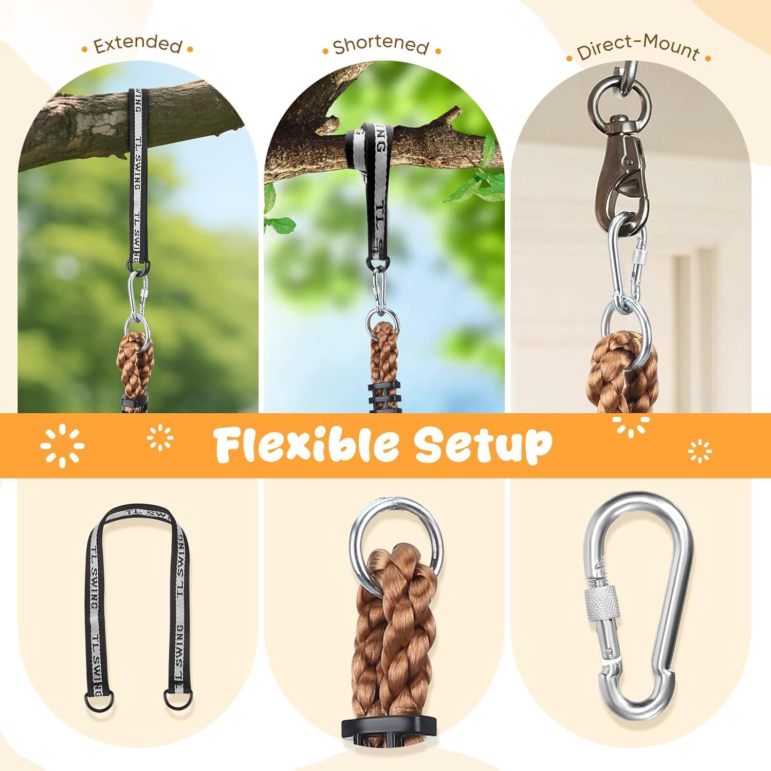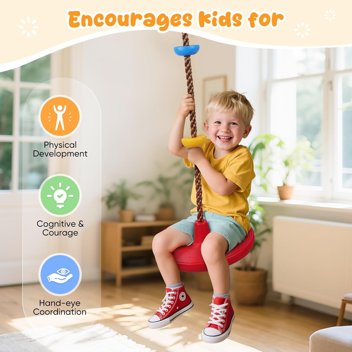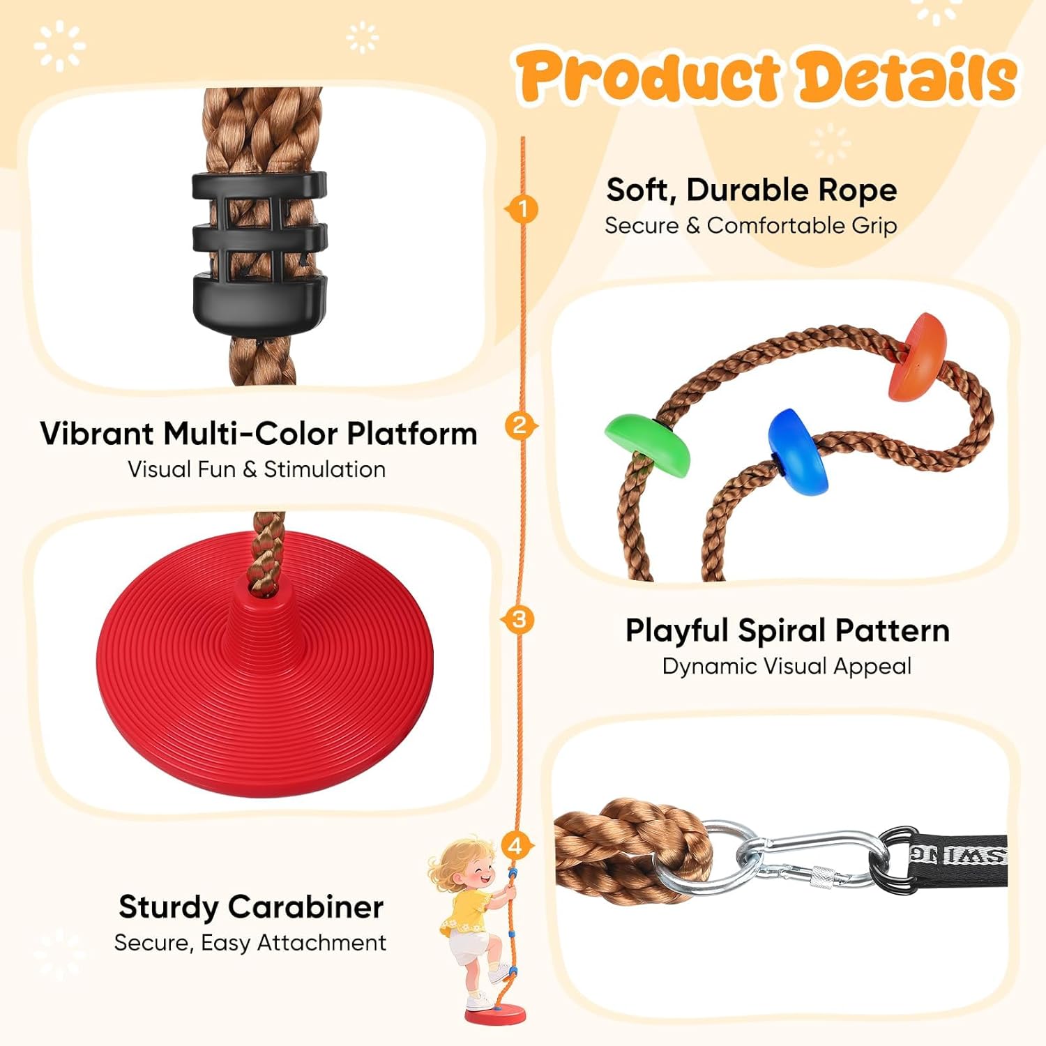 Divertimento attivo con Tree Climbing Swing per bambini: questa altalena da arrampicata per bambini combina una superficie di seduta antiscivolo e piattaforme colorate per arrampicarsi, ideale per far salire i bambini, dondolare e allenare l'equilibrio. Come un pratico dondolo con corda da arrampicata, aiuta a costruire la fiducia in se stessi e migliorare la coordinazione occhio-mano attraverso il gioco attivo, divertimento perfetto per i giovani avventurieri. 【Montaggio rapido e sicuro】 Incluso nella confezione: una cinghia di collegamento stabile e un robusto moschettone che garantiscono un'installazione rapida e sicura. Basta appenderlo a un albero, un altalena o una barra fitness per trasformare qualsiasi stanza, giardino o cortile in un'area giochi immediatamente utilizzabile. Perfetto per l'uso con questa seduta a dondolo esterna! 【Adattabile per i bambini in crescita】Regolare l'altezza in pochi secondi: avvolgere la cinghia di collegamento per accorciare i bambini più grandi o appenderla completamente per allungarla per i bambini più piccoli. Questa altalena per arrampicata per bambini è il giocattolo ideale per arrampicata e altalena che cresce insieme al tuo bambino: una corda flessibile per tutte le età. 【Costruito per durare】 Realizzato in corda spessa e resistente e piattaforme antiscivolo, questa altalena con corda da arrampicata può sostenere in modo sicuro fino a 150 kg. Le piattaforme impermeabili resistono anno dopo anno al sole e alla pioggia, permettendo ai bambini di godere di un gioco attivo in tutta sicurezza, un dondolo per bambini durevole per esterni. Un regalo premuroso per i bambini: perfetto per compleanni o festività: questa altalena colorata stimola il gioco all'aperto e il movimento. Come altalena da arrampicata per bambini, è un modo divertente per aiutare i bambini a staccarsi dagli schermi e godersi l'attività fisica, un regalo che unisce divertimento e salute!