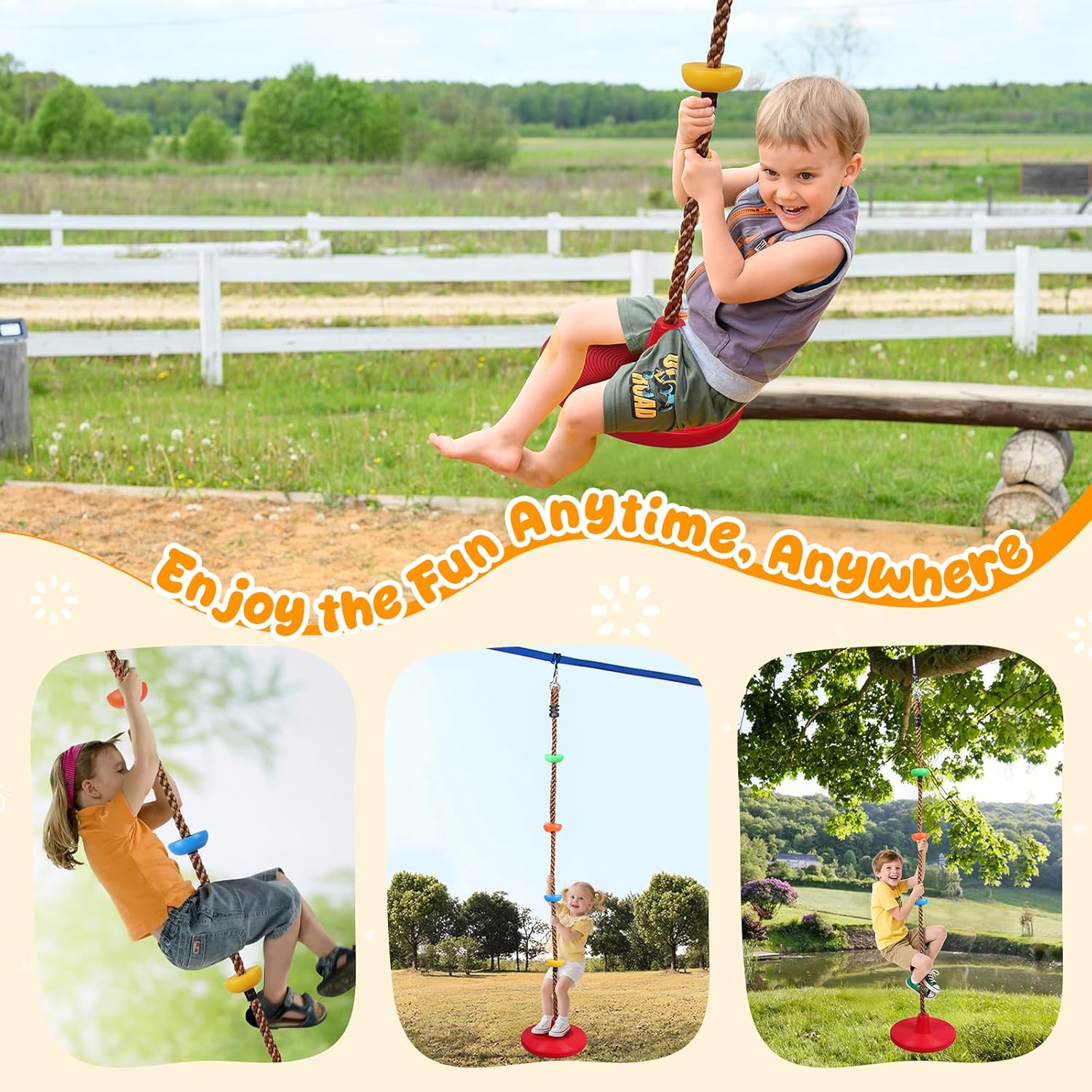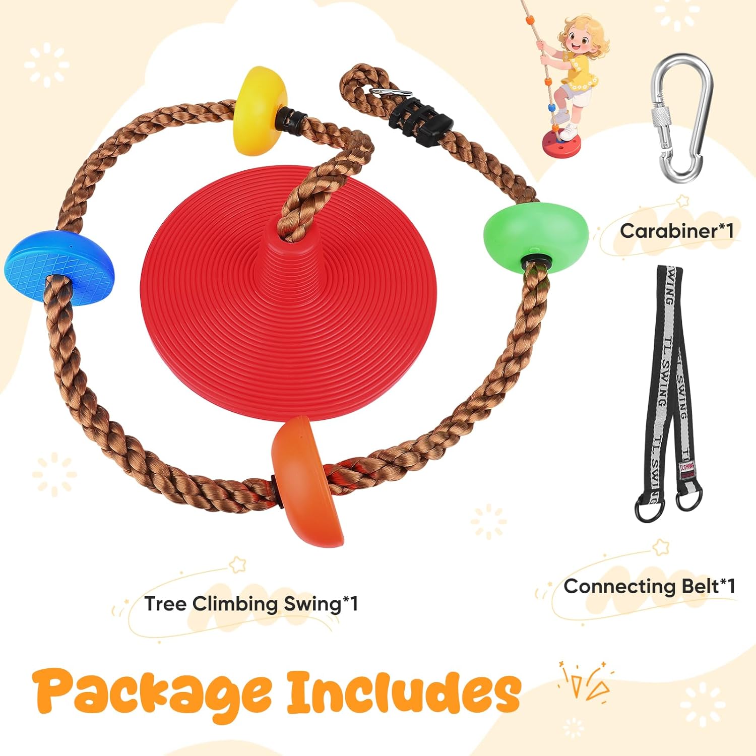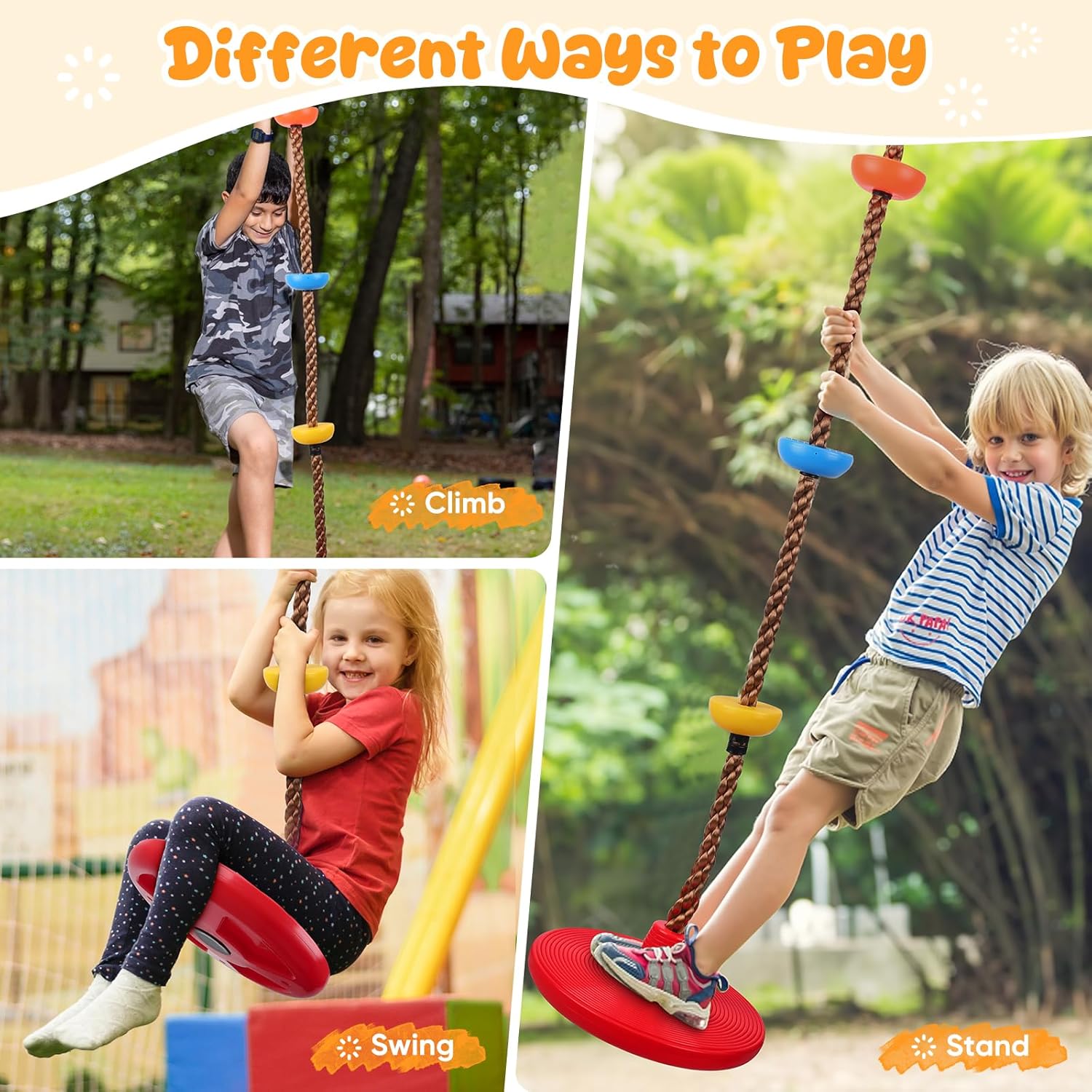 Divertimento attivo con Tree Climbing Swing per bambini: questa altalena da arrampicata per bambini combina una superficie di seduta antiscivolo e piattaforme colorate per arrampicarsi, ideale per far salire i bambini, dondolare e allenare l'equilibrio. Come un pratico dondolo con corda da arrampicata, aiuta a costruire la fiducia in se stessi e migliorare la coordinazione occhio-mano attraverso il gioco attivo, divertimento perfetto per i giovani avventurieri. 【Montaggio rapido e sicuro】 Incluso nella confezione: una cinghia di collegamento stabile e un robusto moschettone che garantiscono un'installazione rapida e sicura. Basta appenderlo a un albero, un altalena o una barra fitness per trasformare qualsiasi stanza, giardino o cortile in un'area giochi immediatamente utilizzabile. Perfetto per l'uso con questa seduta a dondolo esterna! 【Adattabile per i bambini in crescita】Regolare l'altezza in pochi secondi: avvolgere la cinghia di collegamento per accorciare i bambini più grandi o appenderla completamente per allungarla per i bambini più piccoli. Questa altalena per arrampicata per bambini è il giocattolo ideale per arrampicata e altalena che cresce insieme al tuo bambino: una corda flessibile per tutte le età. 【Costruito per durare】 Realizzato in corda spessa e resistente e piattaforme antiscivolo, questa altalena con corda da arrampicata può sostenere in modo sicuro fino a 150 kg. Le piattaforme impermeabili resistono anno dopo anno al sole e alla pioggia, permettendo ai bambini di godere di un gioco attivo in tutta sicurezza, un dondolo per bambini durevole per esterni. Un regalo premuroso per i bambini: perfetto per compleanni o festività: questa altalena colorata stimola il gioco all'aperto e il movimento. Come altalena da arrampicata per bambini, è un modo divertente per aiutare i bambini a staccarsi dagli schermi e godersi l'attività fisica, un regalo che unisce divertimento e salute!