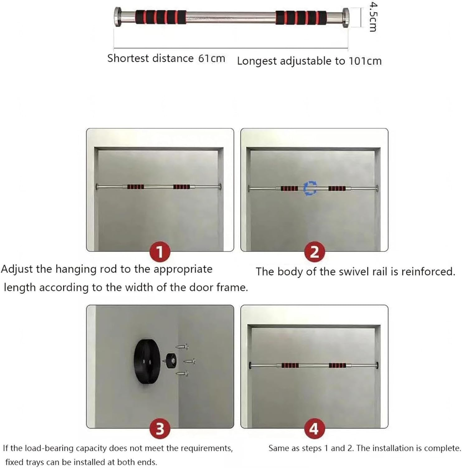 1. Materiale: fettuccia in nylon 2. Agganciare le due cinghie di fissaggio al telaio della porta e chiudere la porta. 3. Regolabile a qualsiasi altezza o angolazione. 4. Se hai domande, non esitare a contattarci, ti forniremo la migliore soluzione.