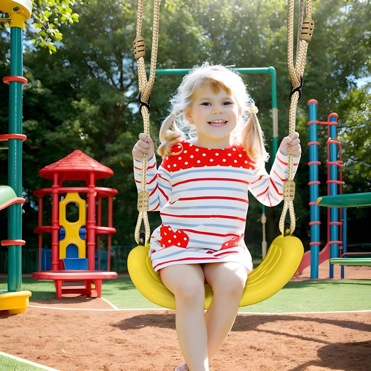 Maggiore sicurezza e stabilità: il dondolo resistente combina un'ampia vestibilità ergonomica e una seduta antiscivolo per garantire sicurezza e supporto mentre si svolgono attività di gioco dinamiche con questa altalena per bambini Lunghezza flessibile: set di altalene da cortile Progettato per bambini di tutte le età, questa altalena fornisce una lunghezza regolabile della corda e una regolazione dell'altezza unica, fornendo comodità e flessibilità in qualsiasi luogo di installazione Materiale sicuro: progettato con una struttura resistente, questa altalena per bambini garantisce una struttura portante progettata per un uso esterno di lunga durata, pur rimanendo robusta e resistente all'usura contro l'usura quotidiana Veloce da installare: sedile portatile e resistente. Questa altalena per bambini è progettata per un'installazione rapida e facile senza attrezzi, fornendo una soluzione pronta all'uso che si adatta sia ad alberi che a porte Versatile nell'uso: kit di ricambio per dondolo ideale per cortili, parchi o spazi interni, l'altalena per bambini offre prestazioni versatili, mantenendo i bambini intrattenuti in tutte le stagioni mantenendo una presenza in diversi ambienti