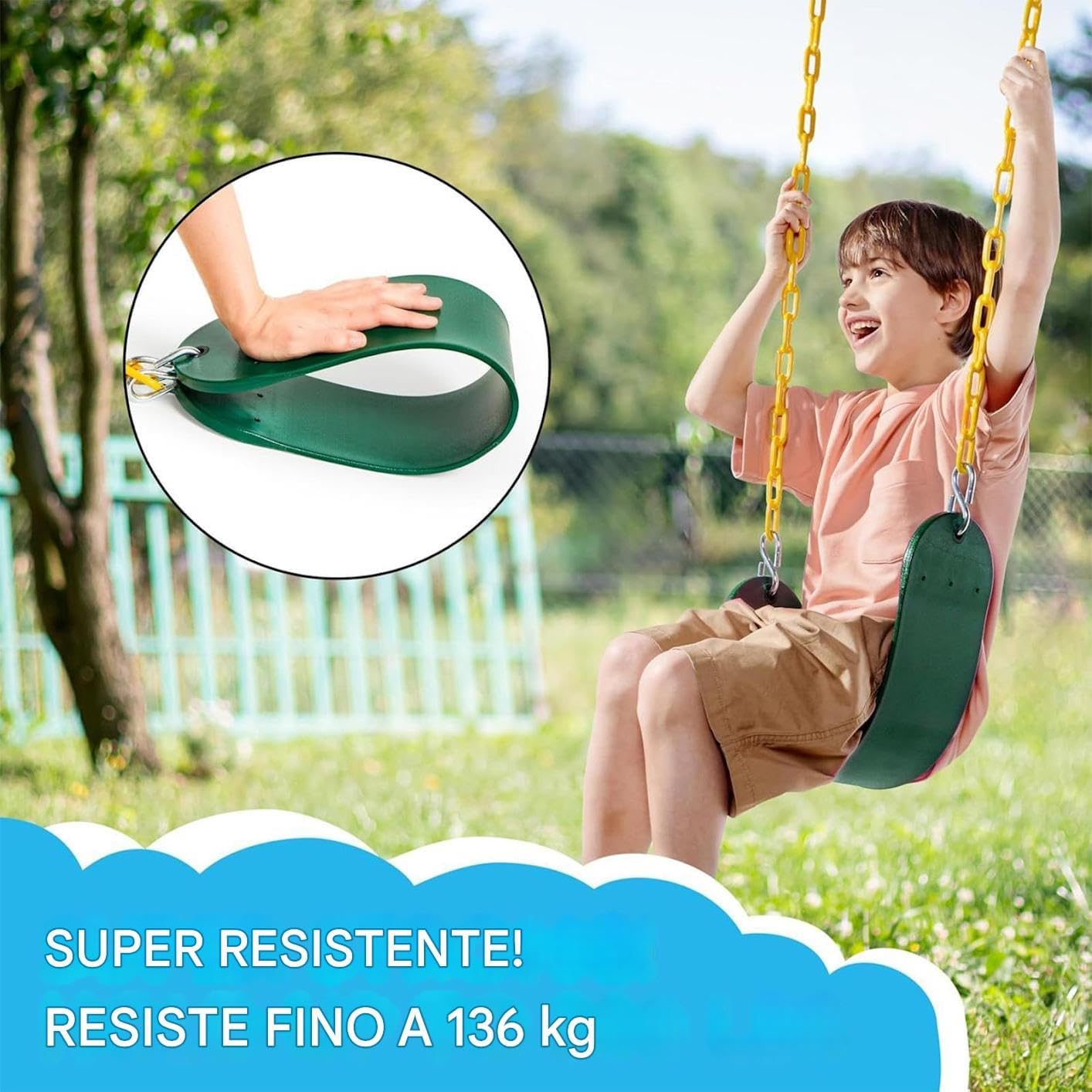 Design Rimbalzante Unico: Questo design innovativo incoraggia il gioco dinamico migliorando l equilibrio e la coordinazione fisica attraverso un movimento oscillante rimbalzante che trasforma il divertimento all aperto in un esperienza interattiva e avvincente per i bambini Altalena Durevole per Esterni: Offre prestazioni costanti durante oscillazioni dinamiche grazie a una catena robusta e antiruggine che supporta un uso prolungato e una maggiore capacità di carico, ideale per ambienti interni ed esterni con funzionalità affidabile Soluzione elegante per esterni: Unisce durabilità e finitura verde, resistente allo sporco e alle intemperie, ideale per spazi family-friendly e si fonde armoniosamente con il paesaggio del giardino, diventando un elemento distintivo 'outdoor. Comfort Avanzato: Progettato per un dondolio confortevole con proprietà ammortizzanti e flessibilità di rimbalzo, unito a superfici antiscivolo per una stabilità aggiuntiva e una seduta piacevole senza vibrazioni Gioco Interattivo Familiare: Incentiva l'familiare attraverso il gioco con l'altalena montata sull'albero, favorendo esperienze condivise e maggiore divertimento per i bambini, comodamente nel proprio spazio verde
