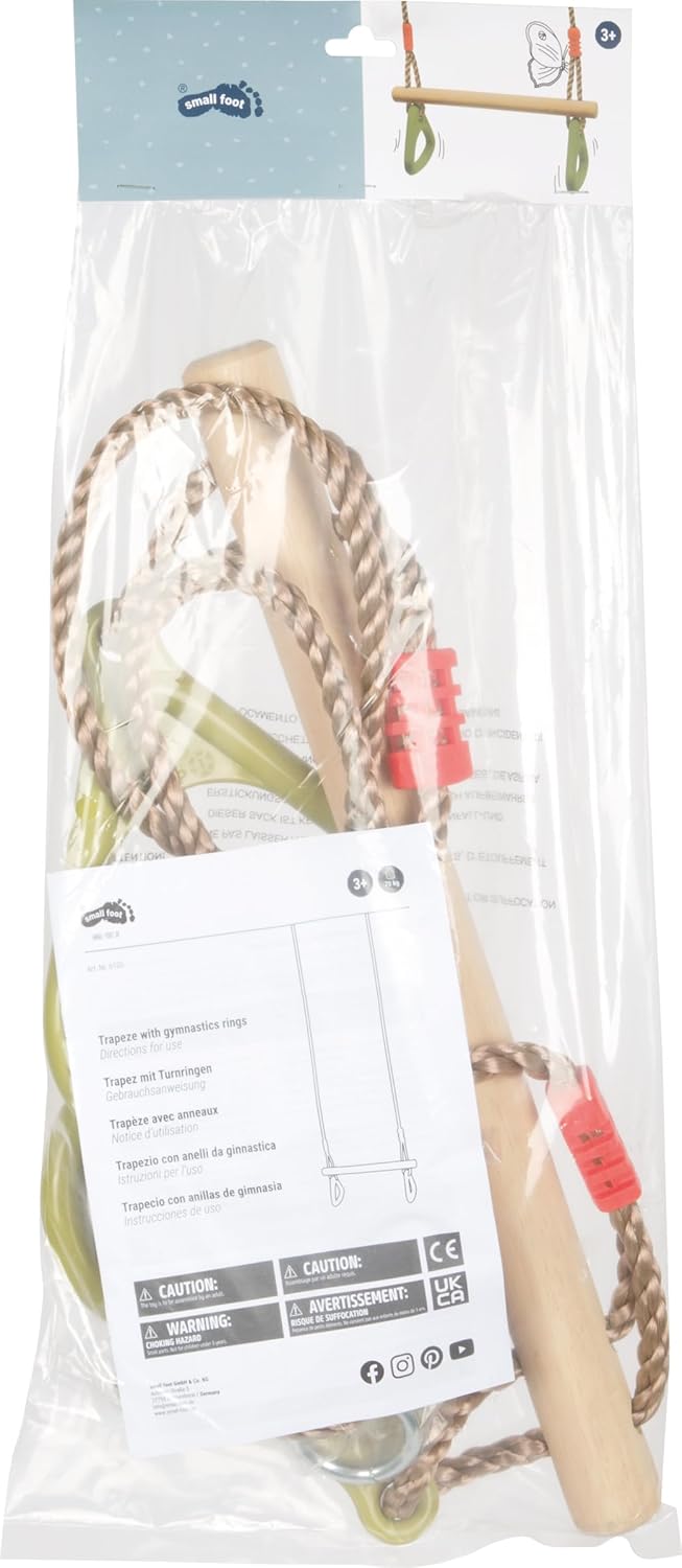 Triplo divertimento: altalena, sbarra e anelli da ginnastica in uno Gli anelli da ginnastica in plastica offrono ai bambini una presa salda durante gli esercizi di ginnastica Legno robusto con corda robusta e anelli in metallo che possono sostenere fino a 70 kg Realizzato in legno robusto, metallo e tessuto Dimensioni: 180 cm (corda); 45 x 4,5 cm (altalena)