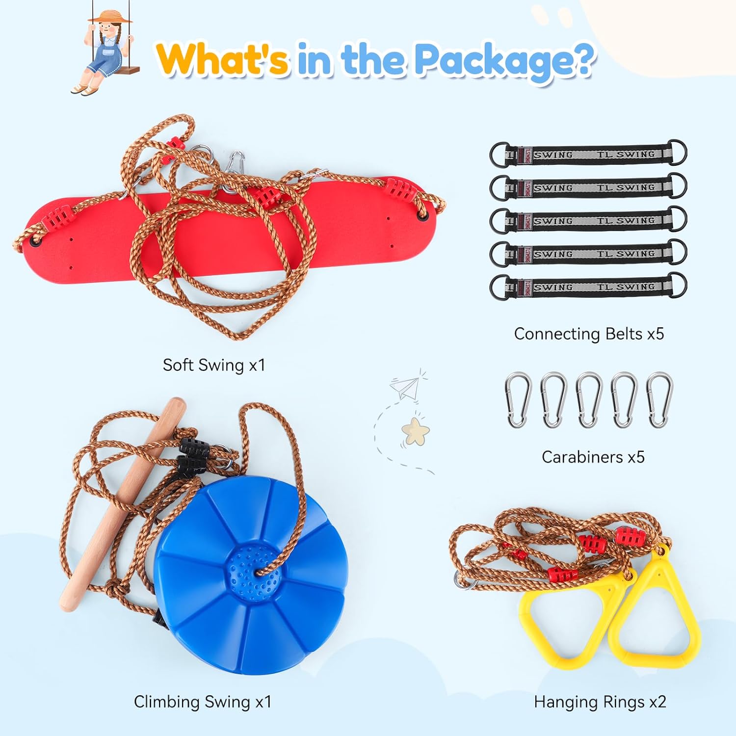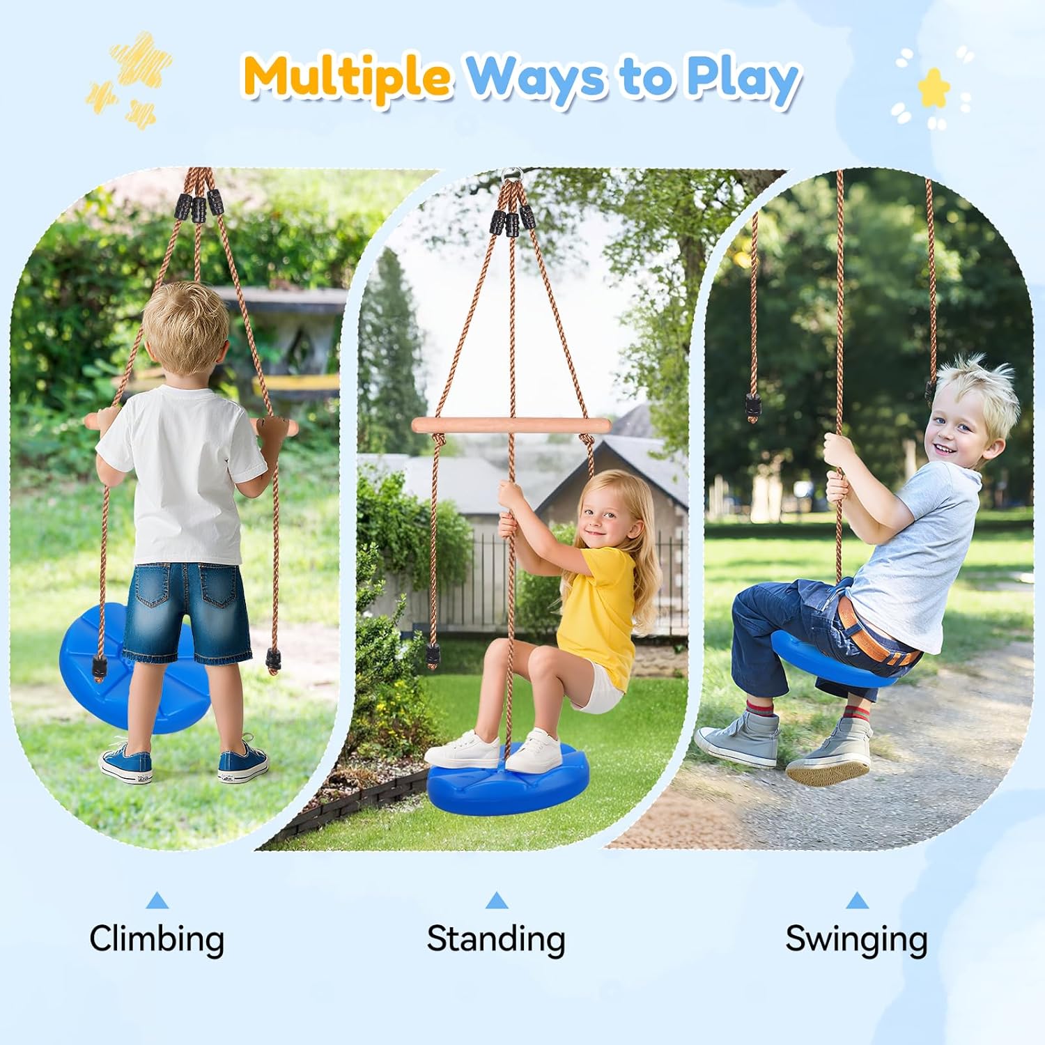 Set Altalena Multifunzionale Combo - Combiniamo l'altalena da arrampicata, l'altalena morbida e gli anelli sospesi in un unico entusiasmante set da esterno, permettendo ai bambini di divertirsi arrampicandosi, dondolandosi ed esercitandosi sugli anelli, tutto in un unico pacchetto. Materiale Resistente e Lunghezza Regolabile - Gli anelli sospesi e l'altalena morbida sono dotati di corde facili da impugnare, anelli resistenti e un fissaggio a morsetto sicuro, entrambi in grado di supportare fino a 200 kg. Le lunghezze regolabili (anelli: 140-220 cm; altalena: 110-190 cm) si adattano a bambini di tutte le altezze. Altalena da arrampicata regolabile con barra di sicurezza - Progettata con resistenti corde a 3 trefoli e una solida barra di sicurezza in legno, questa altalena da arrampicata supporta in sicurezza fino a 200 kg. La sua piattaforma antiscivolo offre maggiore sicurezza ai bambini per arrampicarsi, stare in piedi e dondolarsi facilmente. Basta fare un nodo alla corda per ottenere una lunghezza personalizzata. Installazione flessibile: questo set di altalene da esterno per bambini include 5 cinghie di collegamento e 5 moschettoni per una facile installazione. Perfetto per barre fitness da interno, supporti a soffitto o installazioni all'aperto come cortili, parchi giochi e strutture per l'arrampicata. Il regalo perfetto per i bambini: questo set di altalene da 3 pezzi aiuta i bambini ad aumentare la forza fisica, a sviluppare la resilienza mentale e a sviluppare agilità e coordinazione: un regalo entusiasmante che offre divertimento senza fine e molteplici sfide.