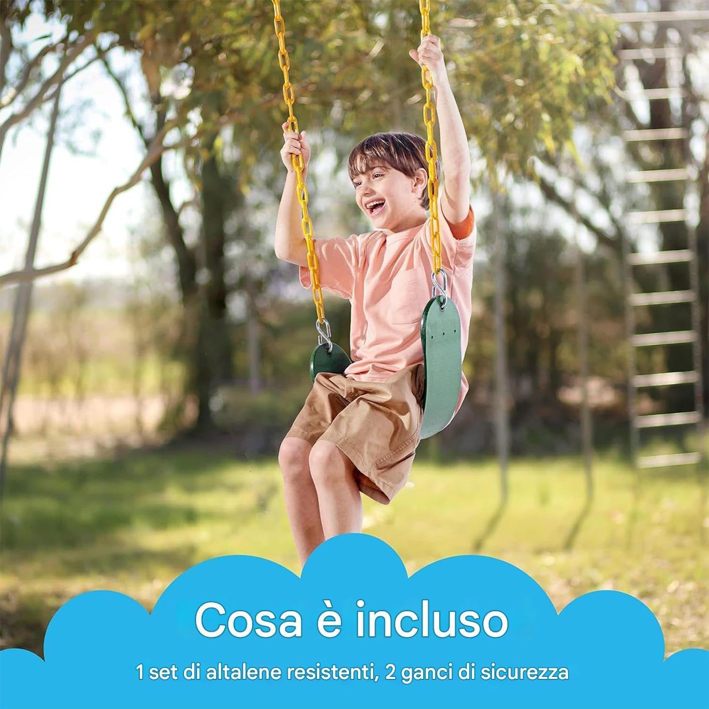 Sviluppo Abilità Motorie: L azione di dondolo studiata favorisce il miglioramento delcapacità motorie il coordinamento e l equilibrio offrendo un attività all aperto interattiva che stimola lo sviluppo fisico in modo divertente e coinvolgente Stabilità durante il Movimento: Garantisce stabilità durante oscillazioni dinamiche con una catena resistente e antiruggine progettata per durabilità nel e miglior supporto di carico, adatta per uso interno ed esterno con sicurezza e affidabilità Resistenza alintemperie: Costruzione resistente agli agenti atmosferici in tonalità verde, si adatta a temi decorativi sicuri per bambini e si integra naturalmente in ambienti esterni, diventando un punto focain spazi gioco o giardini. Conforto Migliorato: Offre un'esperienza di dondolio sicura grazie all'imbottitura in EVA e all'ammortizzazione, combinata con una superficie texturata antiscivolo per massima stabilità e fiducia durante l'uso con un supporto fssibie confortevoche minimizza gli impatti sul corpo Gioco Montato su Albero: Migliora il all'aperto con un'altana da giardino appesa all'albero, pensata per creare gioia condivisa e risate tra i bambini durante sessioni di gioco interattivo e movimento