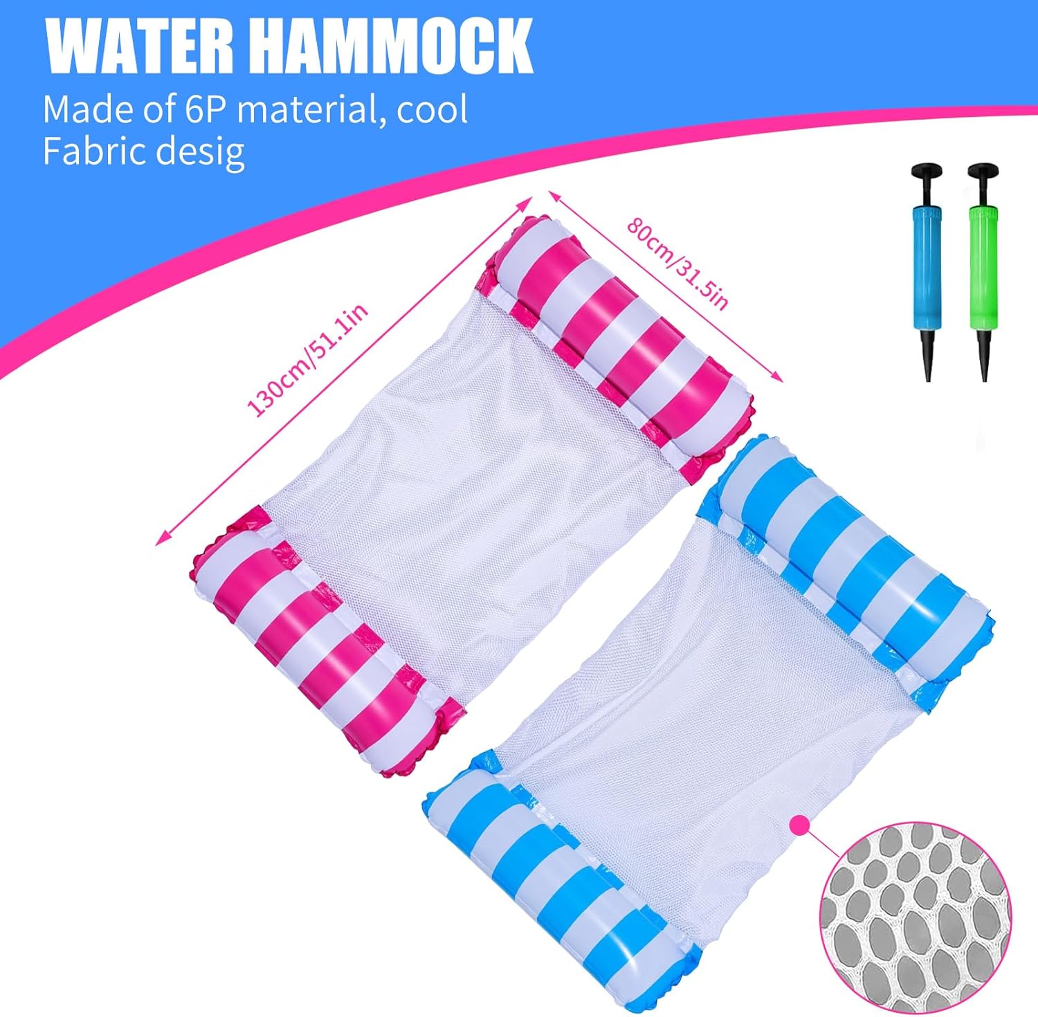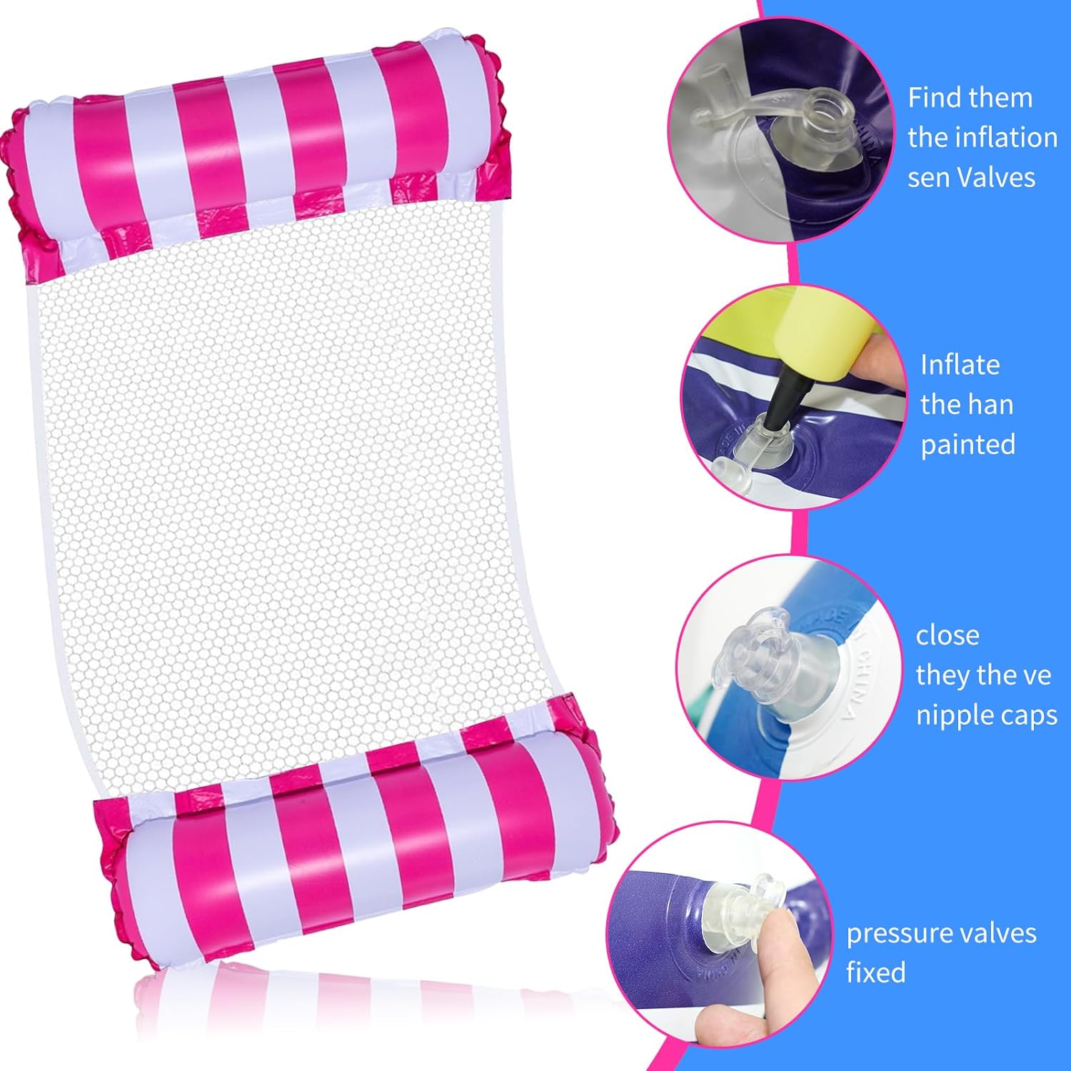 Galleggiante per piscina per adulti 4 in 1: il materasso per piscina può essere utilizzato come amaca, poltrona, gommone e sella sportiva per un'esperienza diversa. Le amache gonfiabili galleggianti sono disponibili per tutte le tue esigenze di intrattenimento, goditi il sole, senti il fresco dell'estate. Lettini gonfiabili per piscina galleggianti con amaca gonfiabile. Materiale sicuro ed ecologico: amaca gonfiabile galleggiante Questa amaca galleggiante è realizzata in materiale PVC di alta qualità, sicuro, ecologico e non tossico. Amaca da piscina robusta e spessa, rivestita in rete morbida e confortevole per maggiore supporto e comfort. Materasso gonfiabile per piscina può essere utilizzato ripetutamente per lungo tempo e non è facile da deformare senza preoccuparsi di perdite dell'amaca gonfiabile. Comoda e resistente - Amaca in rete morbida e confortevole con cuscini d'aria su entrambe le estremità, a differenza di una normale poltrona lounge, puoi mettere le mani sui cuscini d'aria su entrambi i lati e galleggiare quanto vuoi. Il materasso gonfiabile per piscina ha un'eccellente galleggiabilità ed elevata sicurezza e durata per consentirti di galleggiare comodamente in acqua. Amaca gonfiabile per piscina con sedia da piscina. Portatile e durevole - Rete per piscina Il galleggiante gonfiabile per piscina può essere gonfiato e sgonfiato facilmente e rapidamente in pochi minuti, accessorio per piscina leggero e facile da piegare, riporre e trasportare, asciugare rapidamente. Amaca gonfiabile galleggiante pieghevole e compatta, non occupa spazio, quindi puoi arrotolarla facilmente per riporla facilmente in borse da spiaggia e bagagli. Materasso gonfiabile per piscina. Regalo estivo perfetto: materasso gonfiabile per piscina. Questa amaca ad acqua con rete è un divertente giocattolo per amaca galleggiante, perfetto per l'estate, feste in piscina, feste di compleanno per bambini e altro ancora. Nota: a causa dei lunghi tempi di spedizione, è normale che ci sia un leggero odore quando lo ricevi, puoi prima lavarlo e l'odore scomparirà lentamente dopo alcuni giorni di ventilazione. Amaca gonfiabile galleggiante.