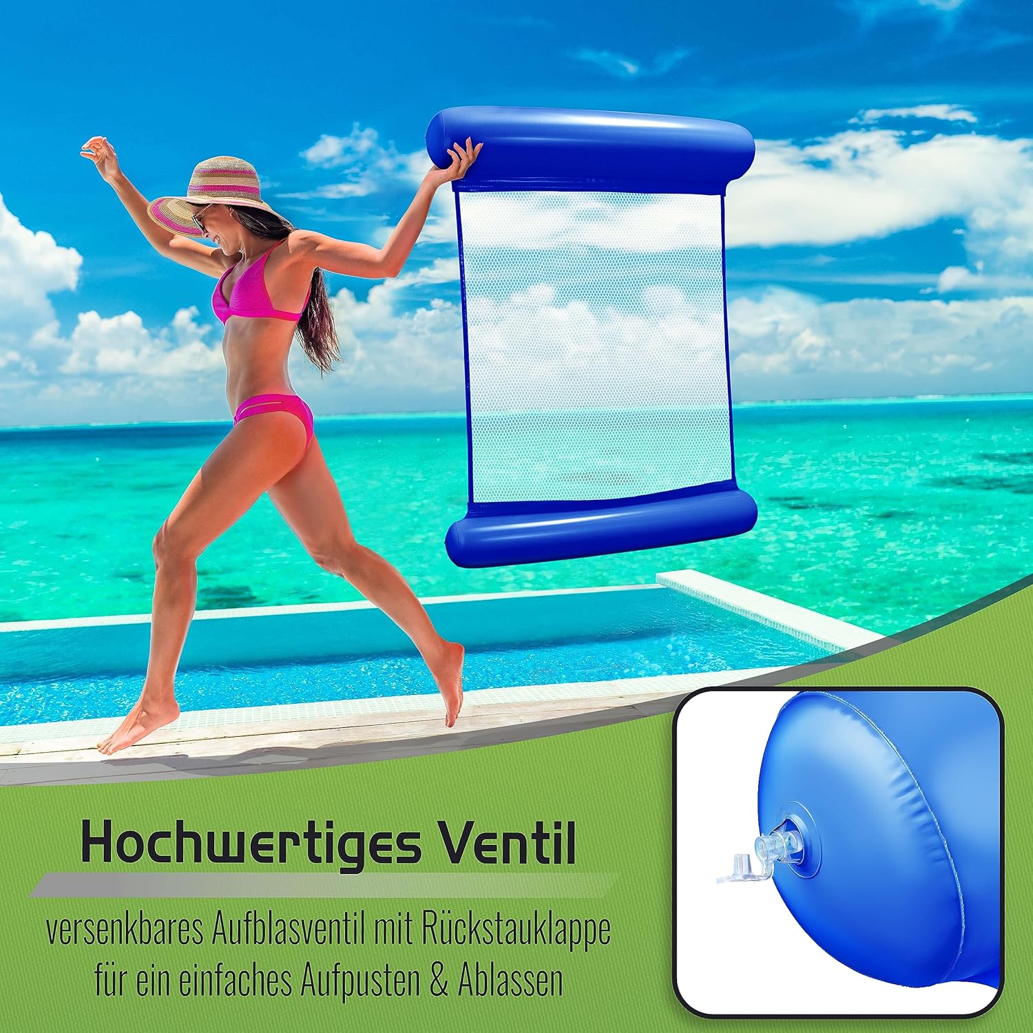 Puro relax: sedetevi e lasciatevi trasportare dal dolce ondeggiare dell'acqua. Con l'amaca ad acqua Balinco proverai una nuova sensazione di leggerezza. Grazie al posizionamento ottimale del corpo in acqua e alla forma ergonomica delle camere riempite d'aria, la testa e le gambe sono supportate, consentendoti di assumere automaticamente una posizione sdraiata naturale e rilassata. Questa combinazione crea la base ottimale per un relax assoluto. Multiuso: il materasso gonfiabile Balinco seduce con il suo variegato design 4 in 1. Non solo ti offre la possibilità di sdraiarti e sederti comodamente con i braccioli, ma consente anche una posizione di sella unica nell'acqua. Inoltre, funge da pratica boa da nuoto che offre maggiore sicurezza e supporto in acqua. Divertimento acquatico per adulti e bambini: che si tratti di rilassarsi, giocare o sfogarsi nell'acqua, il gioco acquatico Balinco è il compagno ideale per ore di divertimento per tutta la famiglia. Con la sua superficie generosa e la comoda struttura a rete, offre spazio e comfort sufficienti per persone di diverse dimensioni. Leggero e compatto: il materasso ad aria Balinco è leggero e compatto, rendendolo ideale per viaggiare. Che sia nella propria piscina, al lago, in piscina o anche in vacanza, si adatta a qualsiasi borsa e si gonfia velocemente e facilmente. Alta qualità e robustezza: l'amaca Balinco convince grazie alle sue proprietà del materiale di alta qualità e allo stesso tempo robusto. Ti offre un piacevole comfort e mantiene la sua forma grazie alla sua impressionante capacità di carico massima di 200 kg, anche con un uso intensivo. Ecco perché il nostro tappetino ad acqua offre una combinazione ideale di comfort, stabilità e durata.