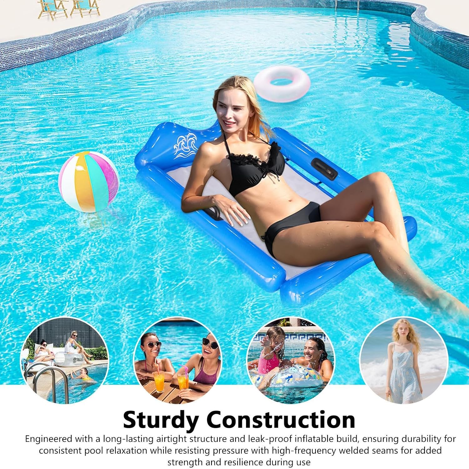 Compagno portatile per la piscina: combina portabilità e praticità, questo galleggiante per piscina è un accessorio facile da trasportare con struttura gonfiabile ermetica, che consente di riporlo facilmente quando piegato per la tua prossima avventura Galleggiante gonfiabile per carichi pesanti: goditi il relax ideale con un'amaca acquatica caratterizzata da un design galleggiante equilibrato, galleggiante gonfiabile robusto e galleggiabilità stabile per una distribuzione uniforme del peso e un comfort di supporto Applicazione versatile: questo galleggiante multifunzionale è perfetto per prendere il sole o rilassarsi, fornendo una colorata soluzione esterna per il relax in qualsiasi ambiente acquatico Solida durevolezza: Prodotto utilizzando tecniche avanzate di saldatura ad alta frequenza e materiali robusti, questo galleggiante è progettato per resistere alle perdite d'aria fornendo allo stesso tempo un'opzione robusta e affidabile per galleggiare in piscine o acque ferme in sicurezza Comodo supporto galleggiante: le superfici testurizzate antiscivolo si combinano con una posizione galleggiante regolabile e un supporto ergonomico per la schiena per creare un design galleggiante incentrato sul comfort, ideale per i lettini relax della piscina