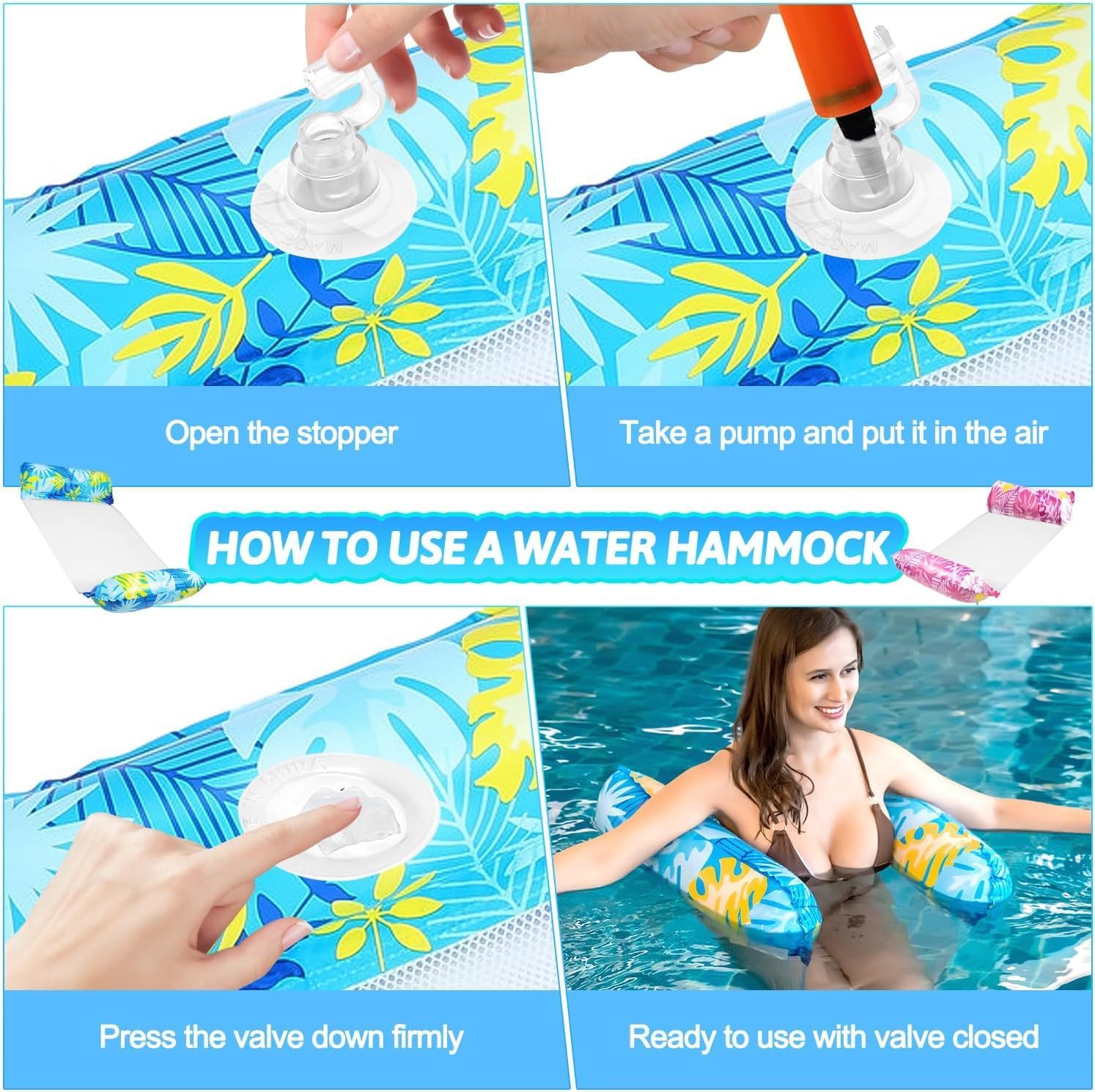 Set completo: la confezione include 3 amache ad acqua e 2 pompe ad aria in colori casuali per un facile gonfiaggio e sgonfiaggio in piscina o in spiaggia Design versatile: la funzionalità 4 in 1 consente l'uso come lettino, sedia, sedile o amaca per il massimo comfort e flessibilità Costruzione a rete: il materiale a rete garantisce comfort e asciugatura rapida fornendo allo stesso tempo un eccellente supporto per l'acqua e ventilazione.