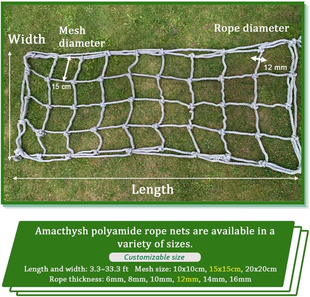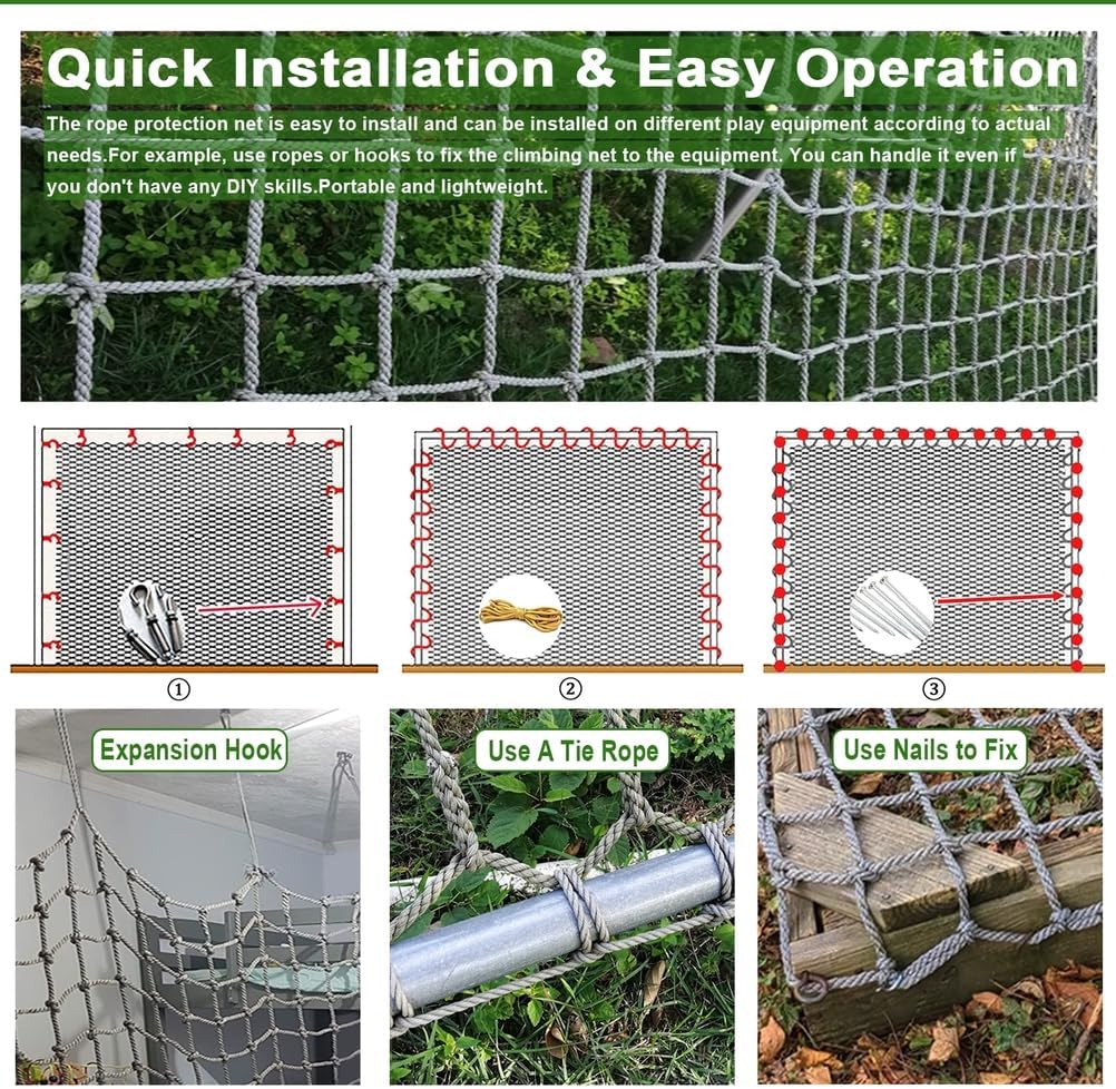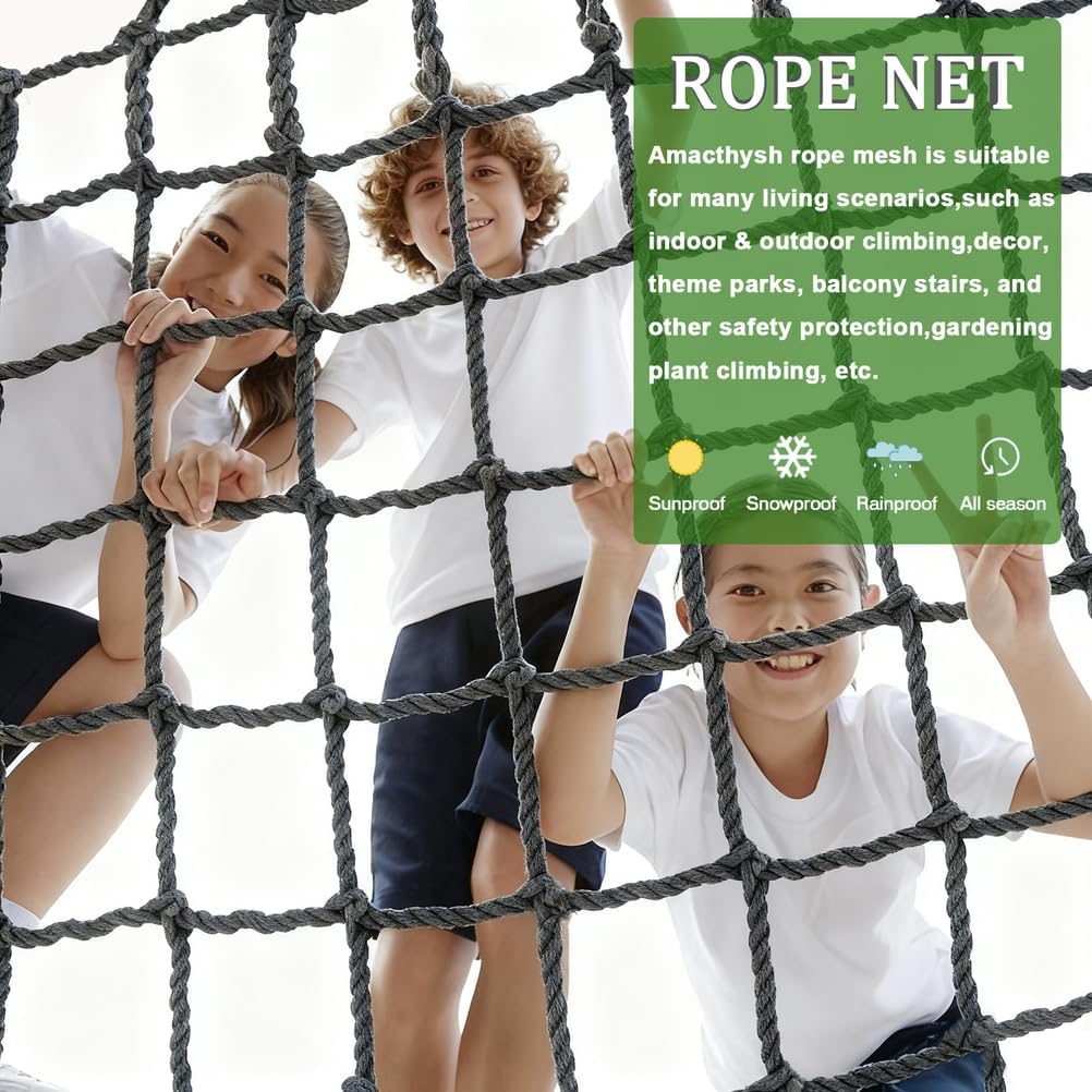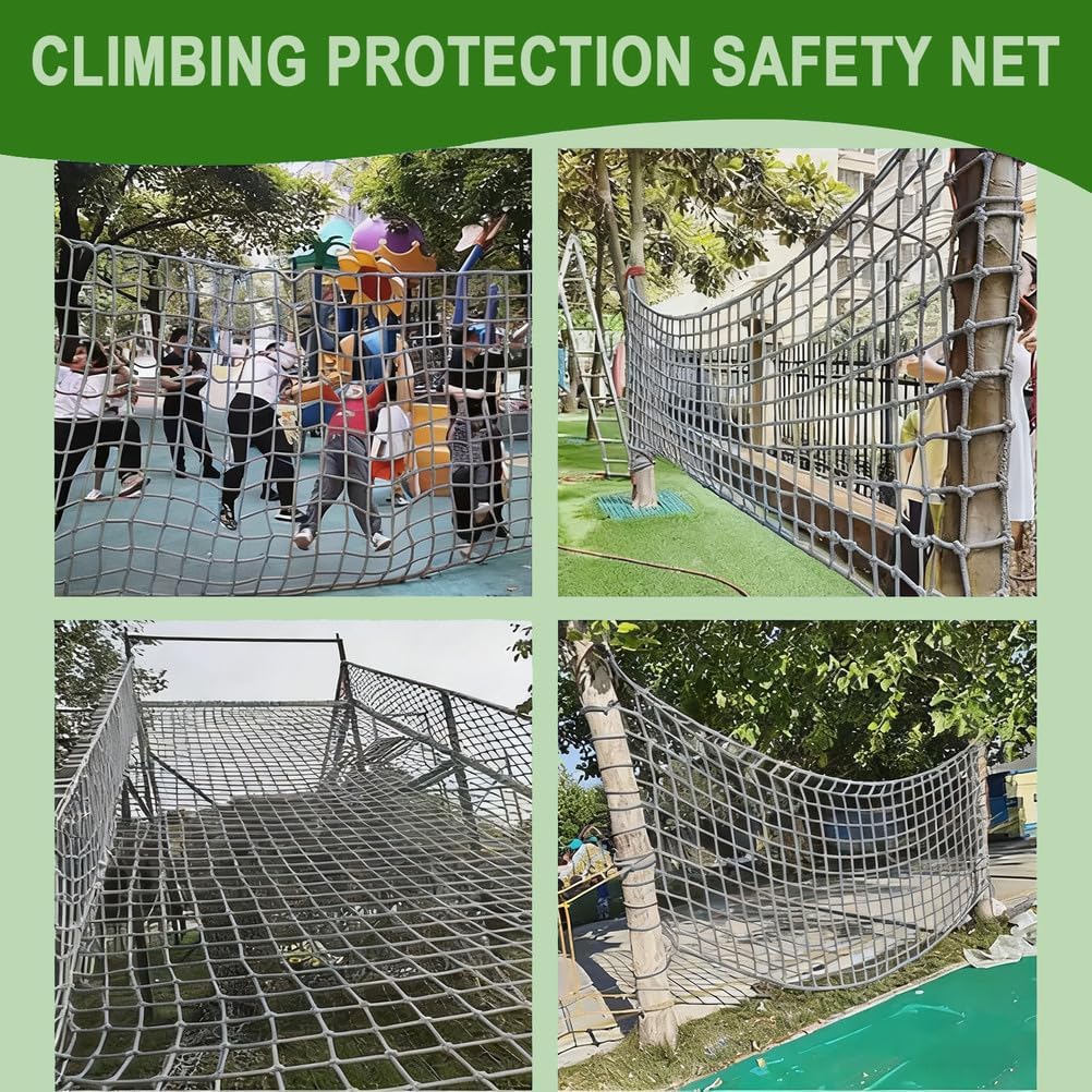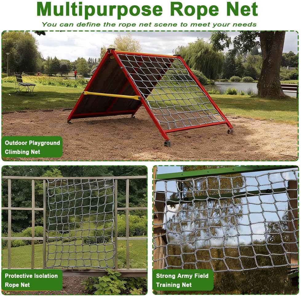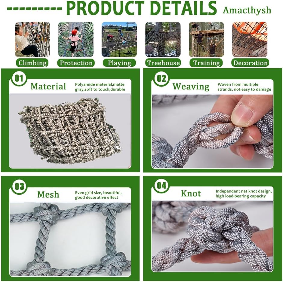Rete in corda multiuso: la rete da arrampicata per bambini all'aperto è progettata principalmente per l'arrampicata e offre sicurezza e protezione a bambini e adulti. La scala in corda per bambini può essere utilizzata anche come rete di sicurezza, rete protettiva, rete anticaduta e rete decorativa. È perfetta per le attività domestiche e all'aperto. Dimensioni e personalizzazione: la rete da arrampicata presenta una spaziatura delle maglie di 15 cm; il diametro della corda è di 12 mm e la lunghezza e la larghezza possono essere selezionate da 100 cm a 1000 cm. Qualsiasi altra dimensione della rete in corda, come spessore della corda, diametro della maglia e lunghezza/larghezza, può essere personalizzata in base alle vostre esigenze. Caratteristiche della rete da arrampicata per bambini: il colore grigio opaco ne esalta l'estetica e la consistenza; la rete multifilo intrecciata a mano è annodata alle giunzioni per maggiore resistenza e sicurezza; i bordi sono privi di sbavature, rendendola più liscia e confortevole al tatto rispetto alla corda di canapa, e più leggera e resistente del poliestere. I bambini possono arrampicarsi in sicurezza senza scivolare o cadere, sia che si tengano o calpestino la rete di corda. Materiale della rete di sicurezza per bambini: la rete da carico per arrampicata è realizzata in fibra di poliammide ad alta resistenza con elasticità minima ed eccellente resistenza agli agenti atmosferici, in grado di resistere a tutte le condizioni atmosferiche e di vento. La rete di sicurezza in corda è durevole, antistrappo e di lunga durata e può supportare oltre 300 kg. Versatile: questa rete di sicurezza in corda è facile da installare e riporre e può essere facilmente appesa e fissata. È ampiamente utilizzata per altalene da arrampicata per bambini, casette da gioco all'aperto, strutture di gioco, strutture per arrampicata, case sugli alberi, ponti di corda e parchi giochi in giardino. Può anche essere utilizzata come ponte pedonale, accessorio per case sull'albero, struttura per arrampicata, parapetto di sicurezza per scale, soppalco, parapetto per patio, scala di corda, recinzione esterna e rete da carico.