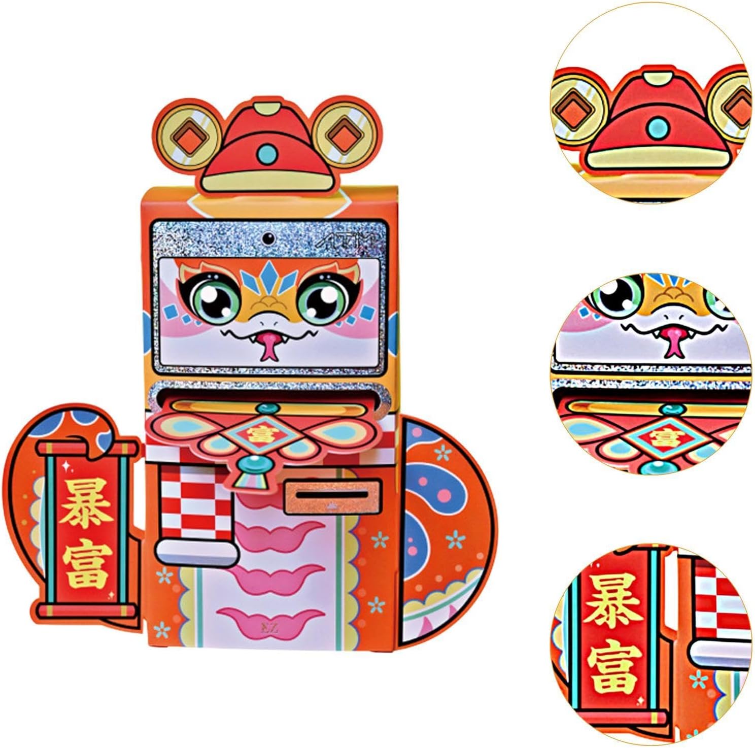 【Materiale di qualità】: realizzata in carta con pregiata fattura, questa busta rossa per il capodanno cinese è inodore, garantendo un'esperienza piacevole per gli utenti di tutte le età 【Design creativo】: prova l'emozione del prelievo allo sportello bancomat con questo distributore di denaro dal design unico. Aggiunge un tocco di divertimento e alla tradizionale busta rossa, rendendolo un regalo delizioso per ogni occasione 【Utilizzo versatile】: oltre al suo ruolo di innovativa busta rossa, questo prodotto funge anche da decorazione festiva per le celebrazioni del capodanno, esaltando l'atmosfera natalizia della tua casa con i suoi colori vivaci ed elementi tradizionali 【Regalo】: distanziati dai regali convenzionali con questo nuovo di busta rossa che sicuramente stupirà amici, familiari o bambini. La sua presentazione unica lo rende un'ottima scelta per compleanni o sorprese di Capodanno 【Significato simbolico】: abbraccia la prosperità e la buona sorte dell'anno del serpente con questo design a Il motivo "Gold Snake Brings Prosperity" trasmette auguri di ricchezza e successo, rendendolo un regalo significativo