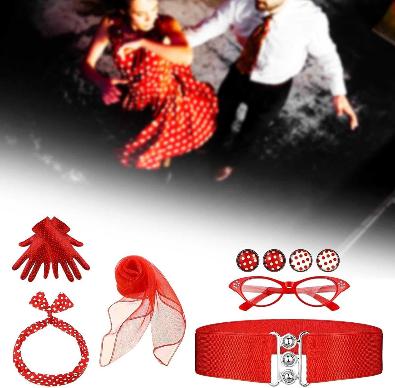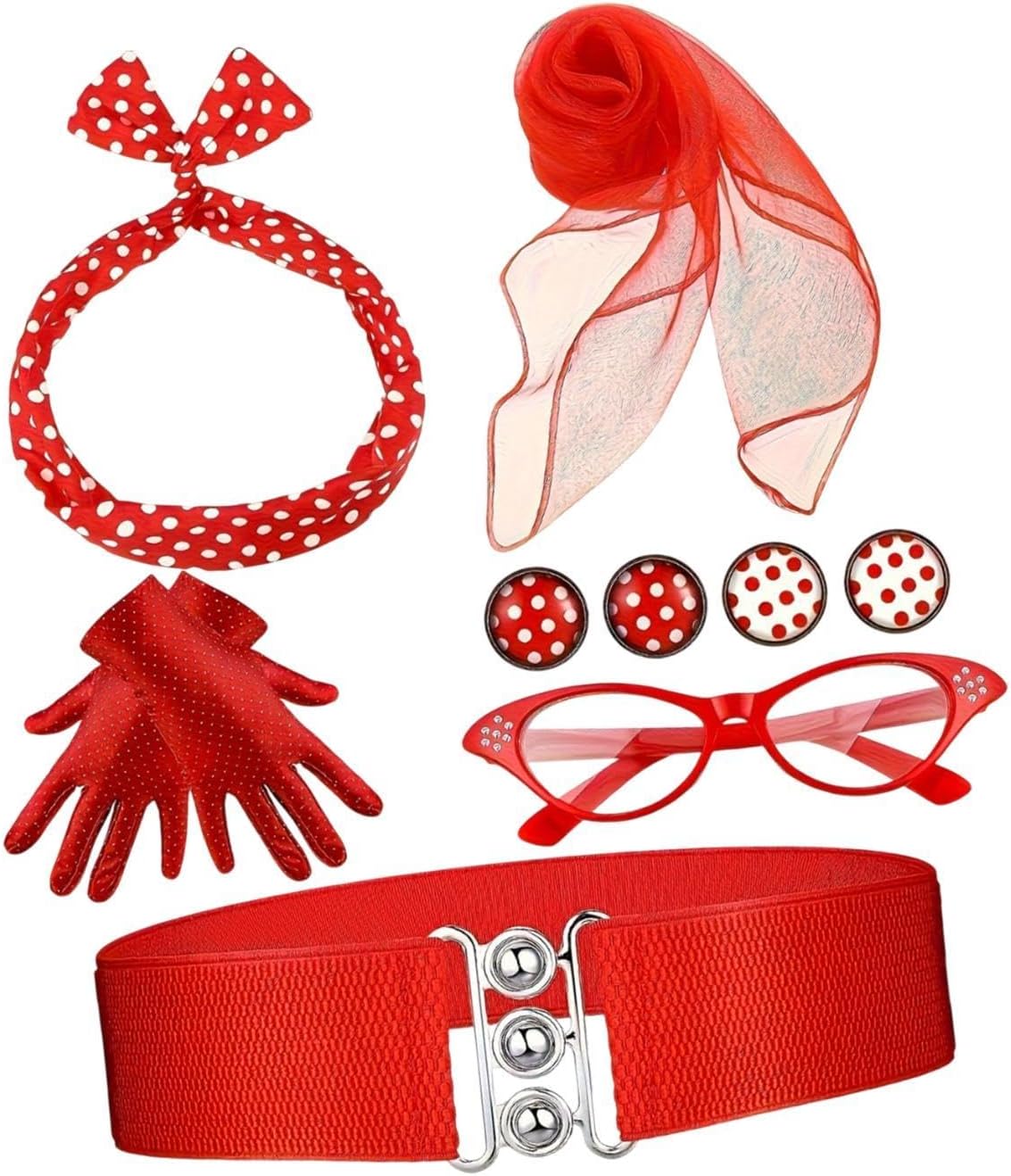 【Uso versatile】: ideale per feste di Halloween, eventi a tema anni '50, balli di fine anno, matrimoni e occasioni in maschera. Questi accessori per costumi da donna anni '50 sono ideali anche per celebrazioni speciali come compleanni o qualsiasi in cui si desidera distinguersi con un classico 【Materiali di qualità】: la sciarpa è realizzata in tessuto di alta qualità, morbido sulla pelle e comodo da indossare durante l'. Garantisce durata mantenendo un aspetto vintage 【Set di accessori per costumi】: questo set di accessori per costumi dal design retrò include sciarpa, guanti, orecchini, occhiali, pezzi essenziali per un look anni '50 【 regalo】: caratterizzato da orecchini a pois in vero stile anni '50, questo set è un ottimo regalo per chiunque ami lo stile vintage o voglia aggiungere un tocco di stile retrò al proprio guardaroba 【Adatto a tutte le età】: Progettati per adattarsi alle donne, questi accessori in stile retrò sono perfetti per chiunque desideri abbracciare il fascino degli anni '50 alle feste in maschera o agli incontri a tema