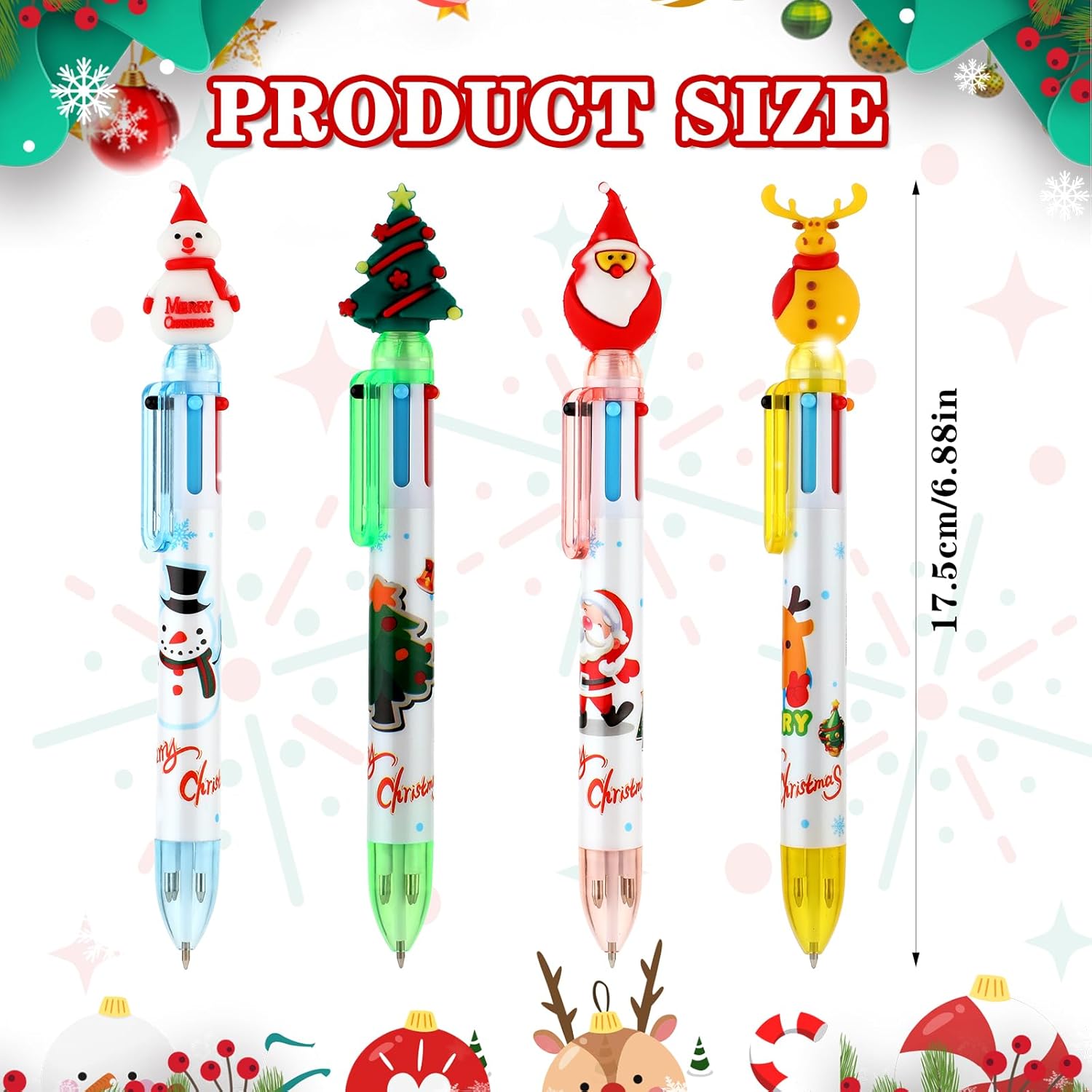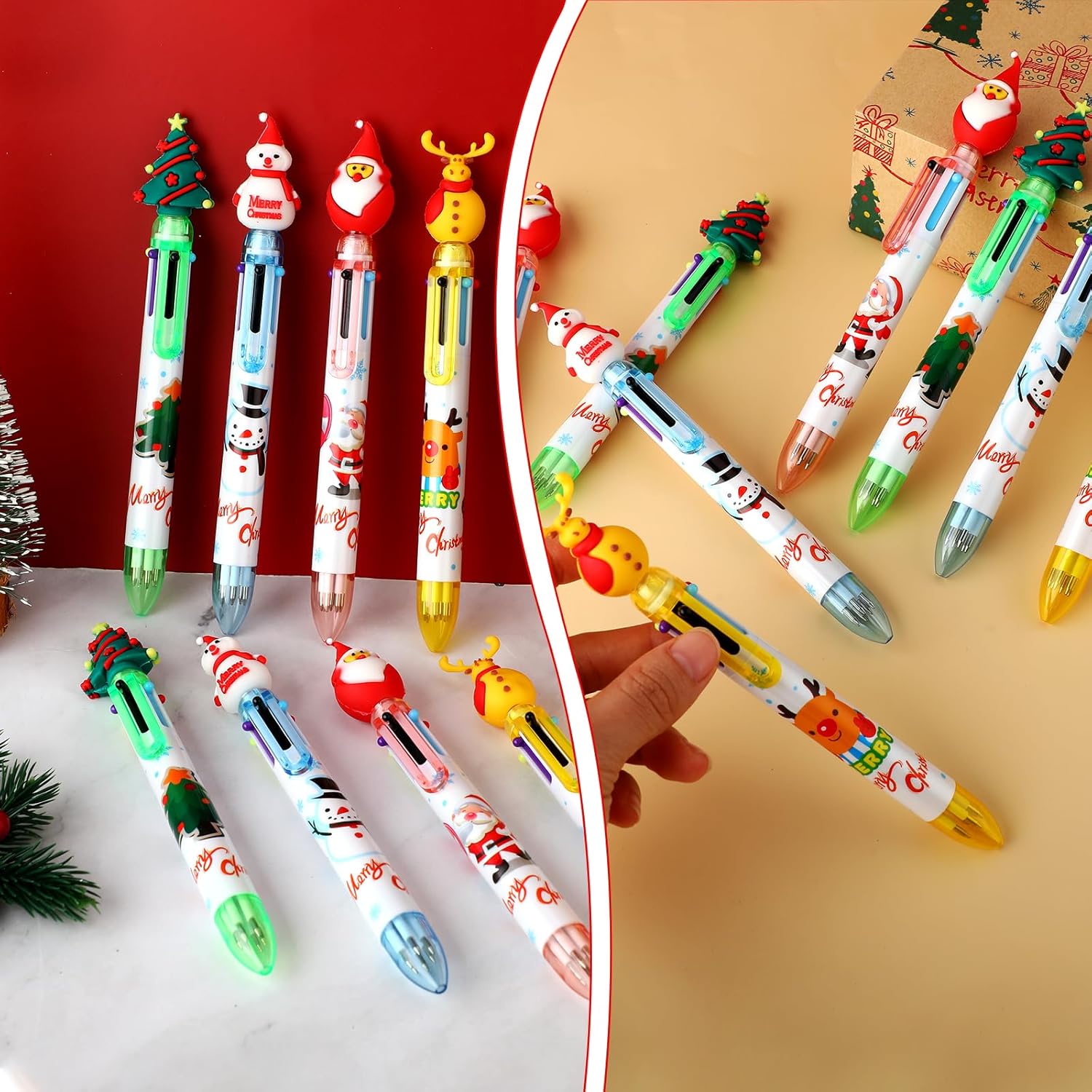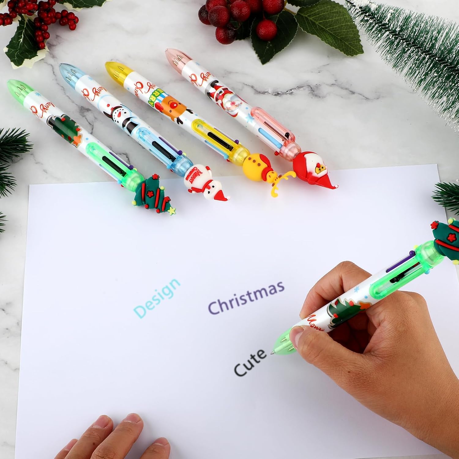 Bella penna in stile natalizio: queste penne a sfera natalizie sono progettate con classici elementi natalizi. Ogni penna ha una simpatica forma a tema natalizio, come un pupazzo di neve, una renna, un albero di Natale o Babbo Natale, che può creare una meravigliosa atmosfera natalizia. Si adattano bene al tema delle vacanze, i bambini adoreranno queste forme di cartoni animati che rendono divertente scrivere e disegnare. Penna a sfera multicolore 6 in 1: ogni penna a sfera multicolore viene fornita con 6 diversi colori vivaci di inchiostro, tra cui arancione, verde, viola, nero, blu e rosso. Queste penne da stampa retrattili 6 in 1 sono perfette per uffici e scuole, consentendo di aggiungere un tocco di colore durante la scrittura, il disegno o la marcatura di disegni e progetti. Sono ideali per evidenziare, enfatizzare e organizzare il tuo lavoro Commutazione facile e veloce: design telescopico a molla, facile da cambiare tra 6 colori. Basta premere il colore della penna a sfera a stampa natalizia a colori che è necessario utilizzare, e se si desidera cambiare il colore, basta fare clic sulla parte superiore della testa del fumetto per rimettere l'inchiostro originale in posizione, quindi selezionare il nuovo inchiostro per la vostra comodità. Materiale durevole: queste penne a sfera della serie natalizia sono realizzate con materiali di alta qualità. Il guscio della penna ha motivi squisiti e una forma natalizia carina e interessante. La struttura è robusta e durevole e può essere utilizzata a lungo senza essere facilmente danneggiata. La nostra penna a sfera è dotata di una punta fine da 0,5 mm per garantire una scrittura liscia e precisa ogni volta. È una cancelleria che non è solo pratica, ma ha anche valore ornamentale. Bel regalo: le nostre penne a rullo natalizie possono essere applicate come bel regalo di Natale per bambini e studenti, e saranno piacevolmente sorpresi quando la riceveranno; prendere una penna natalizia così carina aumenterà il loro interesse per la scrittura e li accompagnerà a trascorrere un felice Natale