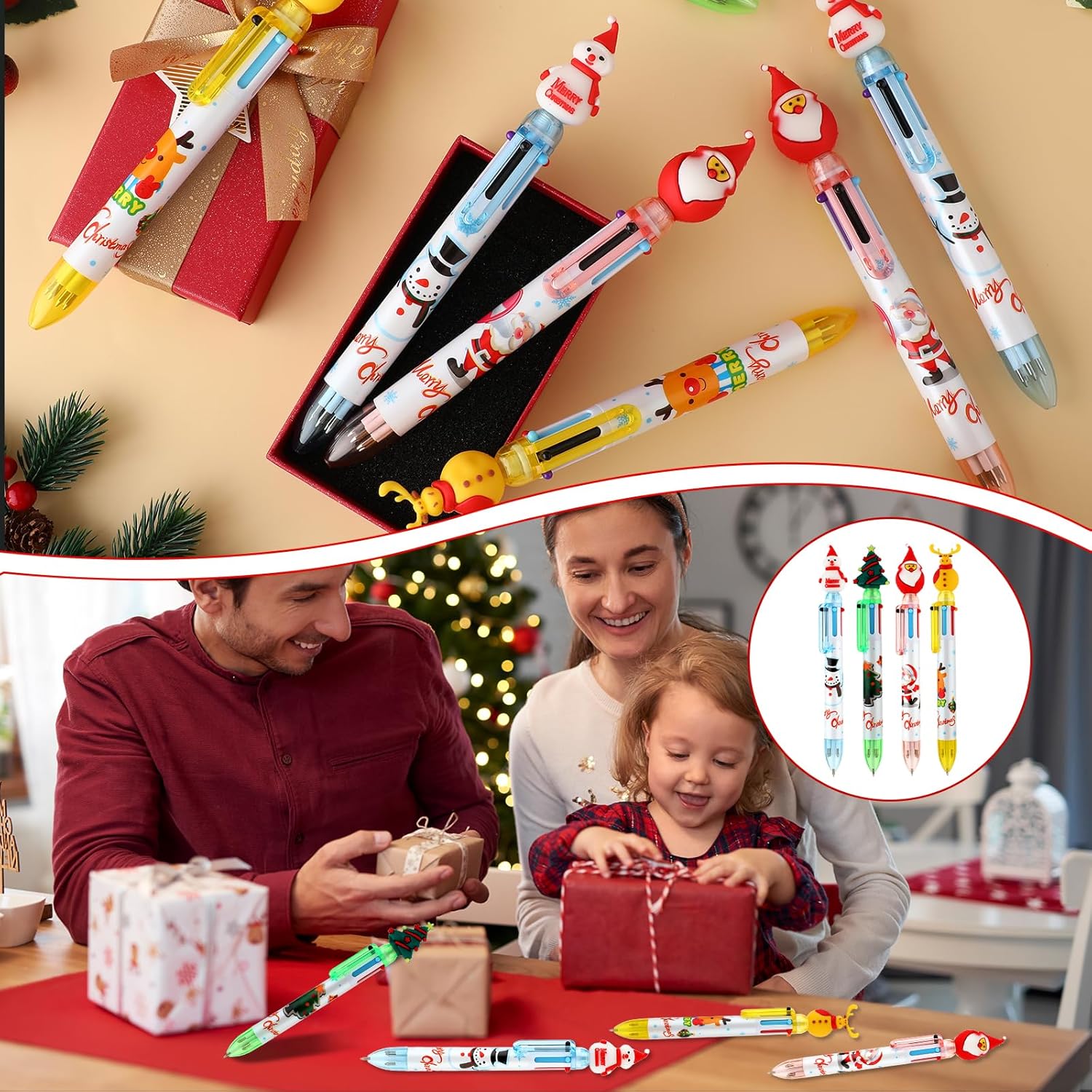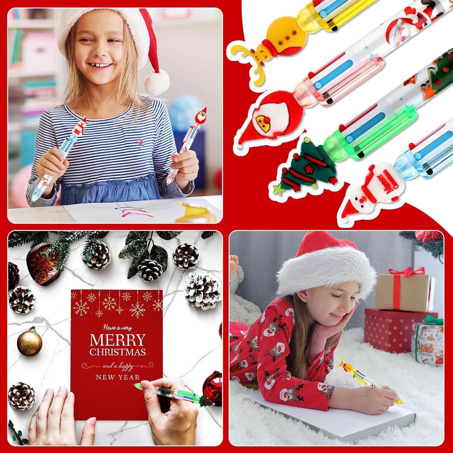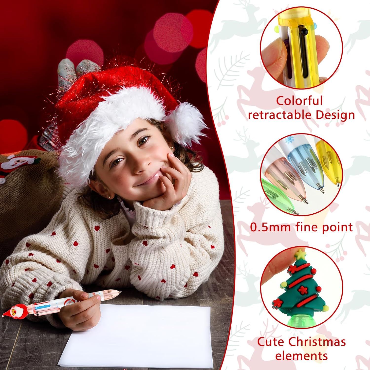 Bella penna in stile natalizio: queste penne a sfera natalizie sono progettate con classici elementi natalizi. Ogni penna ha una simpatica forma a tema natalizio, come un pupazzo di neve, una renna, un albero di Natale o Babbo Natale, che può creare una meravigliosa atmosfera natalizia. Si adattano bene al tema delle vacanze, i bambini adoreranno queste forme di cartoni animati che rendono divertente scrivere e disegnare. Penna a sfera multicolore 6 in 1: ogni penna a sfera multicolore viene fornita con 6 diversi colori vivaci di inchiostro, tra cui arancione, verde, viola, nero, blu e rosso. Queste penne da stampa retrattili 6 in 1 sono perfette per uffici e scuole, consentendo di aggiungere un tocco di colore durante la scrittura, il disegno o la marcatura di disegni e progetti. Sono ideali per evidenziare, enfatizzare e organizzare il tuo lavoro Commutazione facile e veloce: design telescopico a molla, facile da cambiare tra 6 colori. Basta premere il colore della penna a sfera a stampa natalizia a colori che è necessario utilizzare, e se si desidera cambiare il colore, basta fare clic sulla parte superiore della testa del fumetto per rimettere l'inchiostro originale in posizione, quindi selezionare il nuovo inchiostro per la vostra comodità. Materiale durevole: queste penne a sfera della serie natalizia sono realizzate con materiali di alta qualità. Il guscio della penna ha motivi squisiti e una forma natalizia carina e interessante. La struttura è robusta e durevole e può essere utilizzata a lungo senza essere facilmente danneggiata. La nostra penna a sfera è dotata di una punta fine da 0,5 mm per garantire una scrittura liscia e precisa ogni volta. È una cancelleria che non è solo pratica, ma ha anche valore ornamentale. Bel regalo: le nostre penne a rullo natalizie possono essere applicate come bel regalo di Natale per bambini e studenti, e saranno piacevolmente sorpresi quando la riceveranno; prendere una penna natalizia così carina aumenterà il loro interesse per la scrittura e li accompagnerà a trascorrere un felice Natale