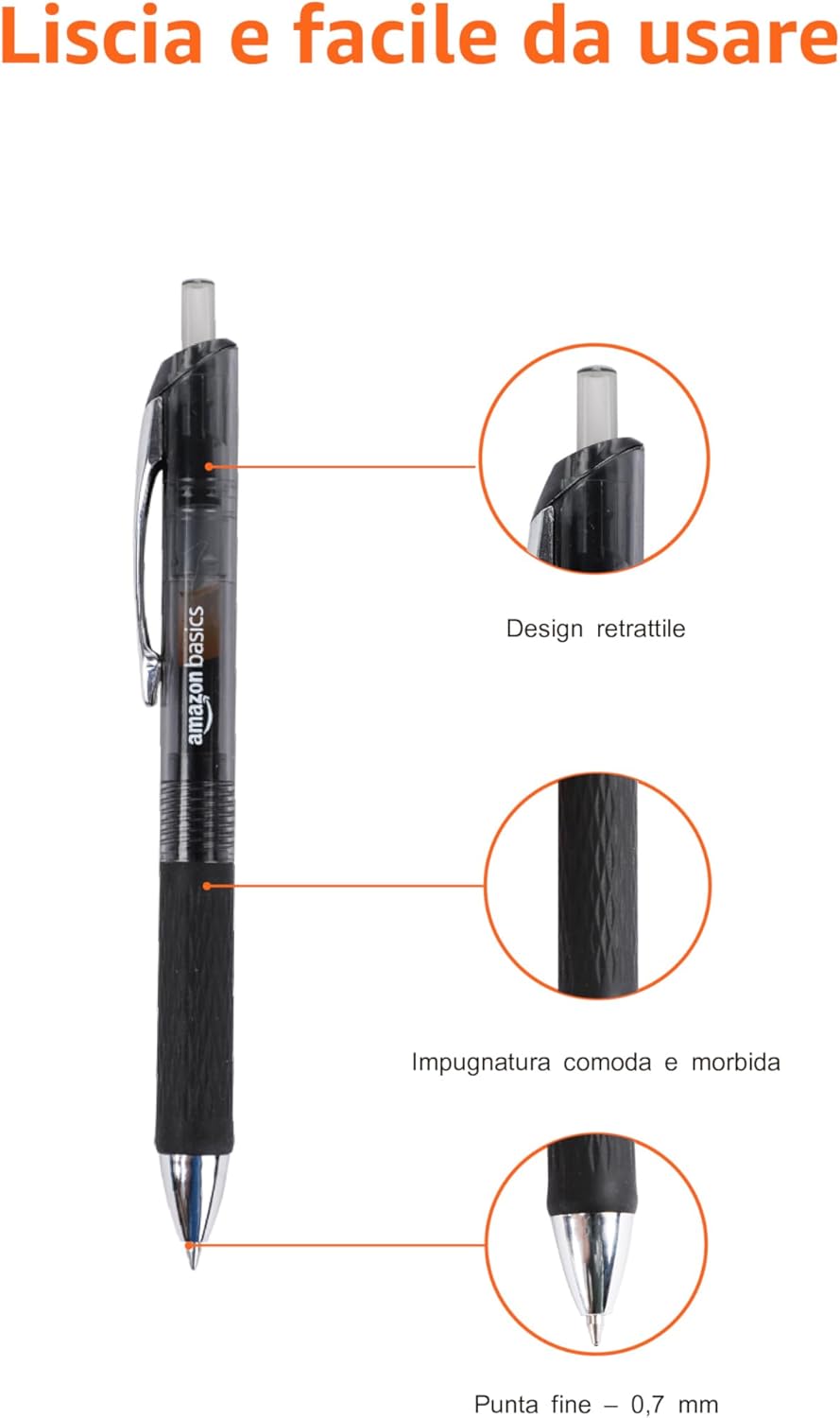 Penna gel retrattile con inchiostro senza sbavature, per una scrittura pulita e affidabile La confezione include 12 penne gel retrattili con inchiostro nero intenso La punta fine (0,7 mm) traccia linee marcate L'inchiostro uniforme, senza interruzioni fornisce risultati fluidi; non si secca né si ostruisce se la punta non viene retratta La penna a lunga durata continua a funzionare finché non si consuma tutto l'inchiostro La presa sicura e comoda offre maggiore controllo Dimensioni del prodotto: 14 x 1.5 x 1.1 cm (lunghezza x larghezza x altezza), Peso dell'articolo 11.8 g