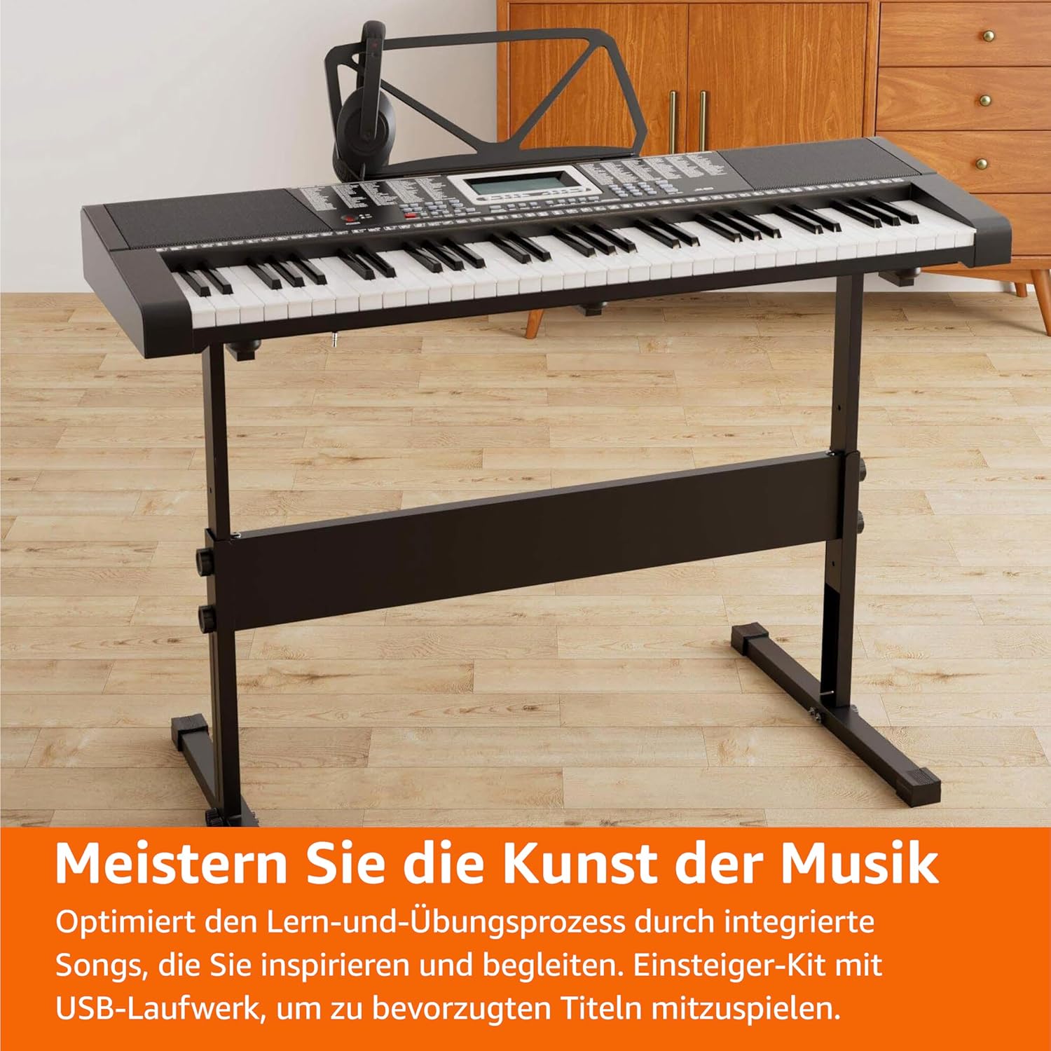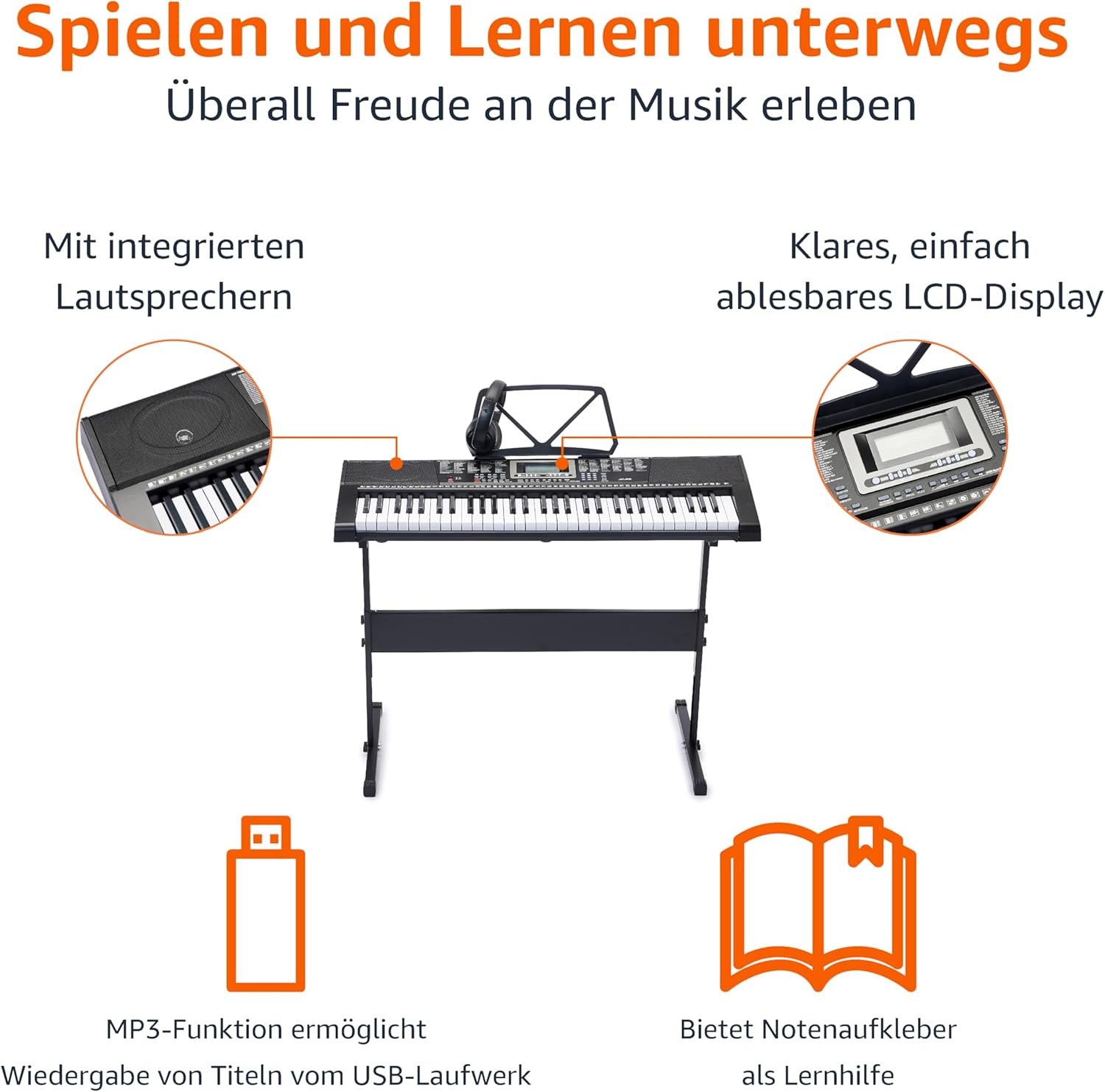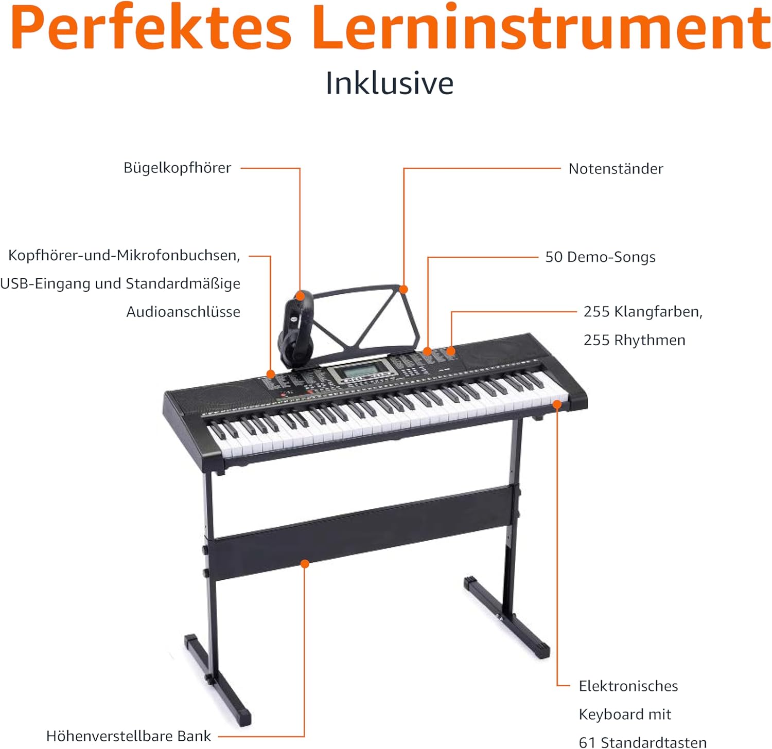 SET COMPLETO: include cuffie, leggio, alimentatore e adesivi didattici. TASTIERA VERSATILE: tastiera elettronica a 61 tasti con tasti standard, display LCD, 255 suoni, 255 ritmi e 50 brani demo. MODALITÀ DI APPRENDIMENTO: Offre 3 diverse modalità (One-Key, Follow ed Ensemble) per principianti, dilettanti ed esperti. FUNZIONALITÀ MP3: La funzione MP3 ti consente di riprodurre brani memorizzati su un'unità USB, aggiungendo melodie, ritmi e suoni di sottofondo. DIMENSIONI E PESO: compatto e leggero con dimensioni di 37" x 12" x 3,75" (L x P x A) e pesa 3,81 kg, facilitando il trasporto e lo stoccaggio.