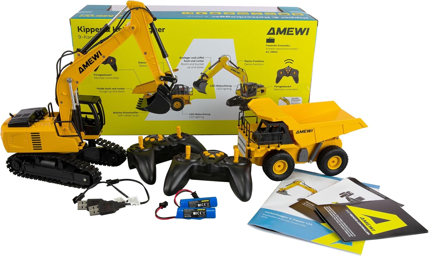 Set 2 in 1, composto da un escavatore a catena telecomandato e ribaltabile, porta un'azione realistica da cantiere nella cameretta dei bambini. Entrambi i veicoli hanno un design adatto ai bambini, ma ricco di dettagli in giallo e nero e offrono funzioni versatili per un divertimento emozionante L'escavatore a catena convince con catene in gomma controllabili separatamente che consentono manovre di guida precise come rotazioni sul posto. Il braccio con pala è mobile tramite telecomando, il carrello superiore può essere ruotato manualmente di 360° Il cassone ribaltabile facile da usare garantisce un valore di gioco aggiuntivo Entrambi i veicoli hanno una funzione demo automatica, che dimostra automaticamente tutte le funzioni premendo un pulsante. Il sistema wireless a 2,4 GHz a prova di interferenze garantisce un controllo fluido senza sovrapposizioni di frequenza Grazie all'elettronica resistente agli spruzzi d'acqua e alla struttura robusta, entrambi i modelli sono adatti per l'uso in interni ed esterni. Con fino a 20 minuti di autonomia per ogni carica della batteria, batterie sostituibili e cavo di ricarica USB, le avventure di gioco non possono ostacolare.
