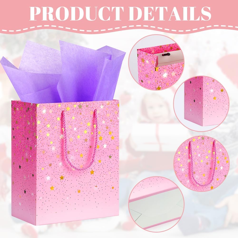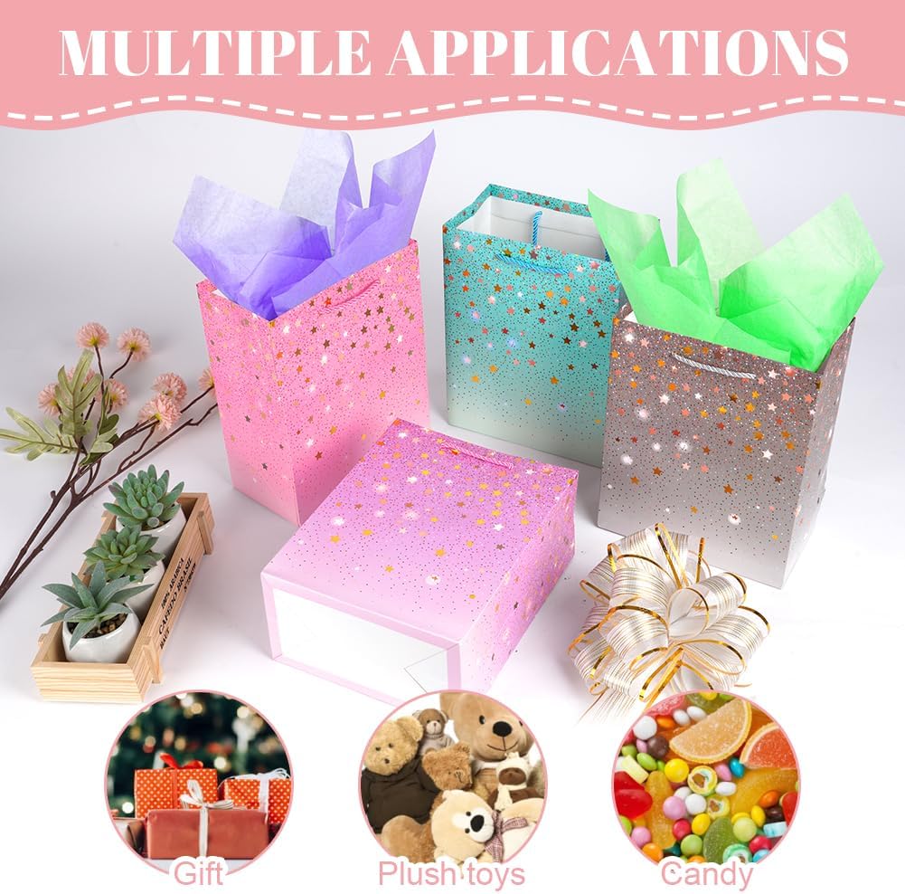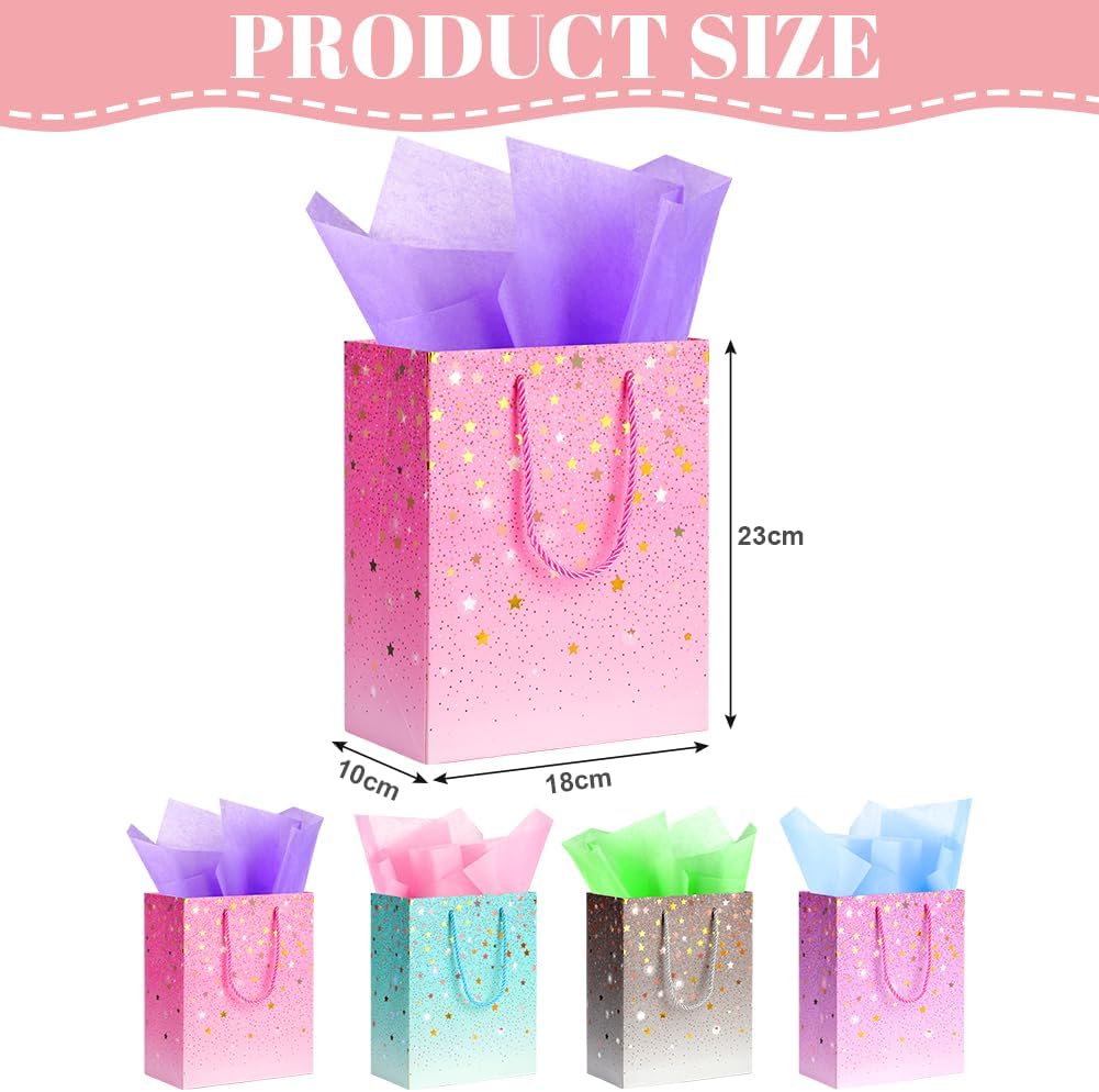 🧡 【Set di sacchetti regalo】 Include 4 eleganti sacchetti regalo (lunghezza 23 cm × larghezza 18 cm × altezza 10 cm) e 4 fogli di carta velina decorativa. Mostra un design pieghevole per riporlo e riutilizzarlo facilmente, perfetto per varie esigenze regalo. 🧡【Alta qualità】Realizzato in carta naturale con una grammatura di 350 g/m², con fondo rinforzato e robuste corde di cotone come manici. Questi sacchetti regalo tengono bene e non si rompono facilmente. Le solide maniglie e la base li rendono facili da trasportare. Questa è la scelta migliore per la confezione regalo. 🧡【Incantevole design del cielo】Mostra uno sfondo sfumato rosa-viola-verde da sogno decorato con motivi a stella in lamina d'oro. La laminazione opaca preserva i colori vivaci, è molto bella e accattivante. Se non sei bravo a confezionare regali ma vuoi comunque fare un bel regalo, questi sacchetti regalo in carta facili da montare sono perfetti per te! 🧡【Riutilizzabile】La struttura ultra robusta del sacchetto regalo ha un fondo imbottito aggiuntivo, è durevole e affidabile, facile da riempire, riporre e trasportare e il set multiplo di sacchetti regalo può essere utilizzato a lungo. Dopo aver confezionato questi sacchetti regalo con il cielo stellato e averli consegnati al destinatario, il destinatario può continuare a usarli come sacchetti della spesa quotidiani. Queste borse sono belle e resistenti. 🧡【Multiuso】Questi graziosi sacchetti regalo si distingueranno sicuramente in ogni celebrazione e possono essere utilizzati come sacchetti regalo per tutti i tipi di feste, come matrimoni, compleanni, anniversari, lauree, baby shower, San Valentino, ecc. I sacchetti regalo di compleanno ideali per donne, bambini e persone di tutte le età.