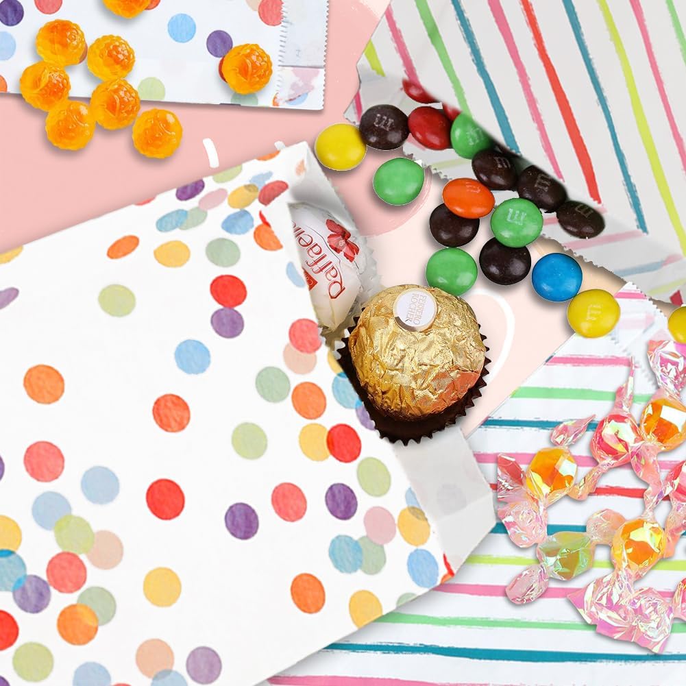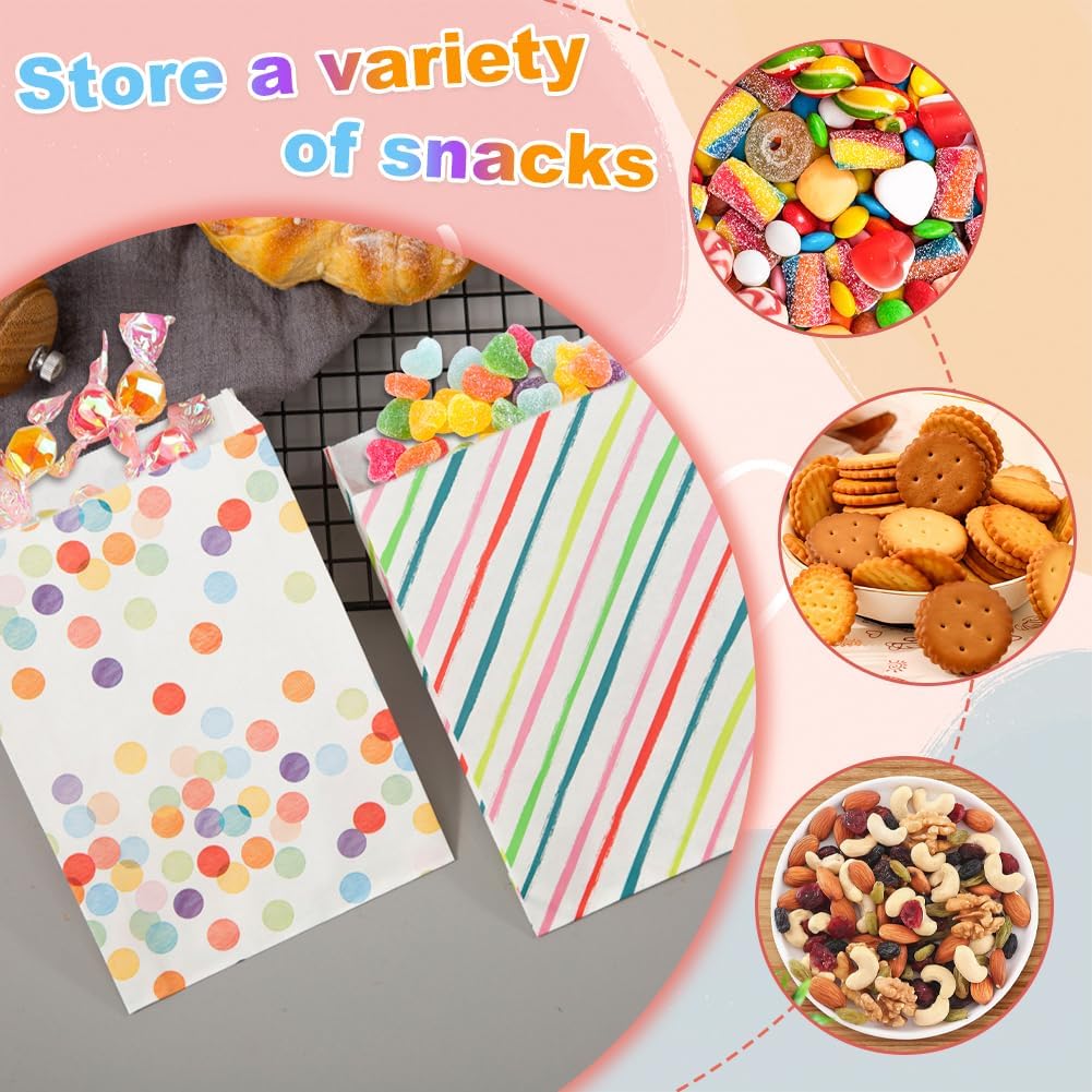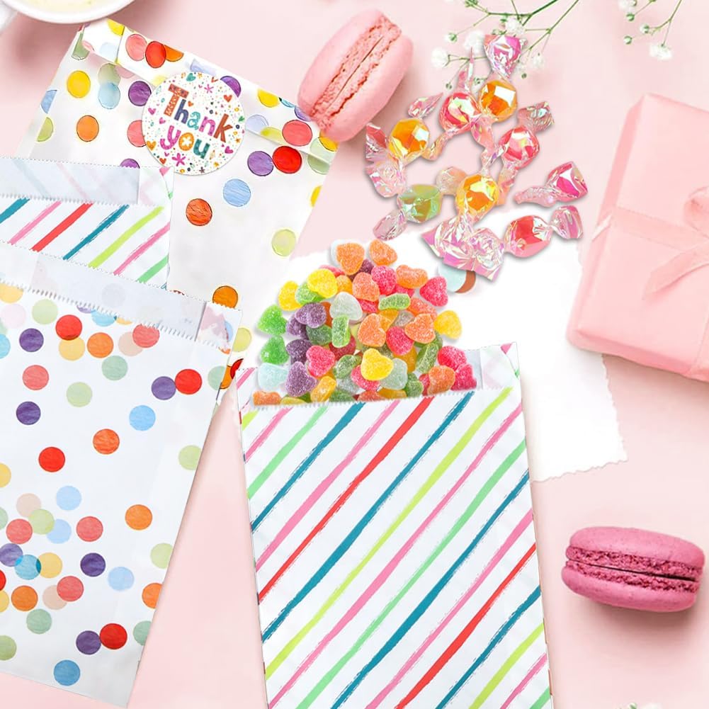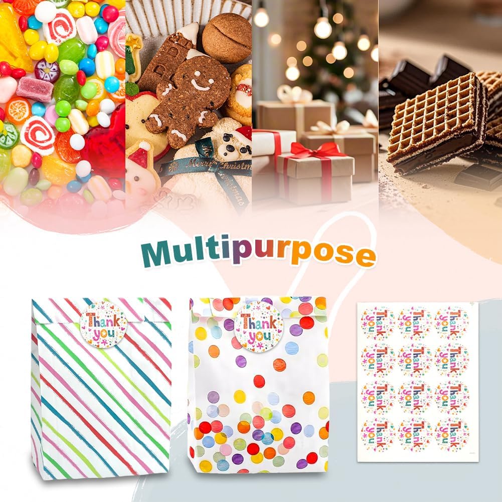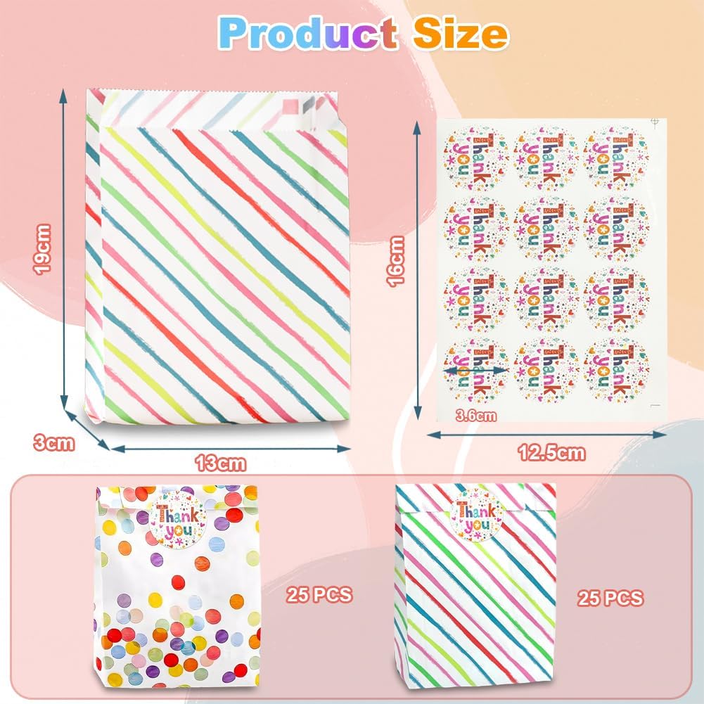 💖【Alta qualità e robusti】I sacchetti di carta sono realizzati in carta di alta qualità, sono leggeri e resistenti, facili da aprire e piegare e comodi da trasportare. 💛【Adesivi di ringraziamento】Gli esclusivi adesivi "Grazie" rendono il pacchetto regalo unico e portano gioia. Fanno sentire le persone come se fossero state preparate con cura e rendono il regalo ancora più prezioso. 🎁【Dimensioni appropriate】Ogni set contiene 50 sacchetti di carta per feste che soddisfano le esigenze di qualsiasi festa. I sacchetti sono piccoli (13×19 cm) e offrono molto spazio per dolci, giocattoli e altri piccoli regali. Sono la scelta perfetta per varie occasioni di festa e soddisfano tutte le esigenze della tua festa. 💜【Design fai da te】Questi sacchetti di carta sono perfetti per la creazione e la progettazione. Possono essere dipinti, stampati e abbelliti a piacere. Progetta le borse in modo completamente individuale. 💙【Multiuso】Adatto per posizionare piccoli oggetti come snack, caramelle, biscotti, cioccolato, menta, ecc. Può essere utilizzato per la laurea, Pasqua, feste di compleanno, festival estivi, cerimonie nuziali, ecc.