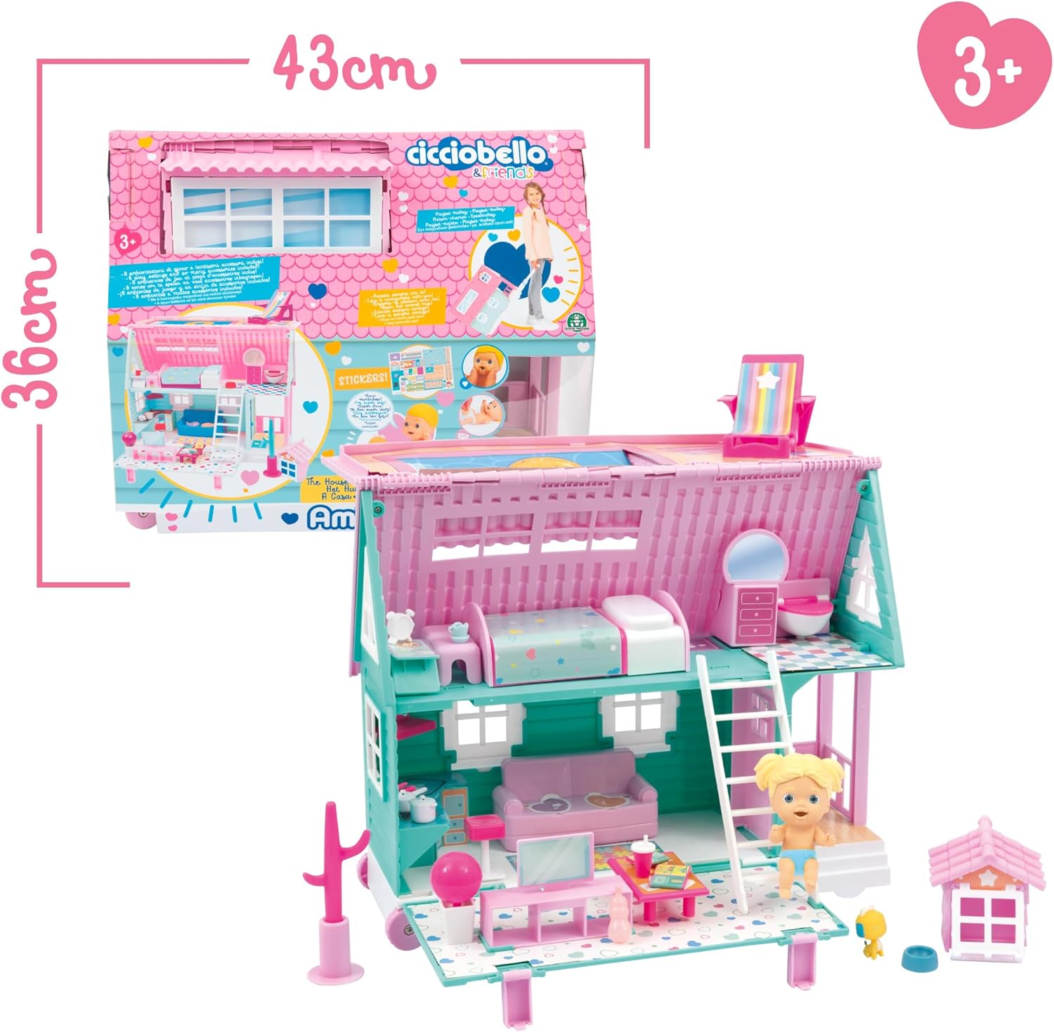 Nuova casetta per bambini Amiciccici con diversi colori molto carini. Tetto rosa e struttura verde pastello e cambiano anche gli accessori La Casa di Amicicci è il gioco più completo della gamma! Ha molte stanze diverse; scopri il soggiorno, la cucina, la camera da letto, il bagno o il giardino; la casa è dotata di scale per mettere in comunicazione i due piani La casetta si chiude e si trasforma in un posto dove riporre tutto e tenerlo in ordine, oltre ad un carretto con manico e ruote per portarlo ovunque Il set comprende una morbida bambolina di Amicicci bionda con i capelli raccolti in due code di cavallo, un cagnolino come animaletto da compagnia, vari accessori da gioco e adesivi per decorare la casa Un giocattolo molto divertente che farà la gioia dei bambini della casa che adorano le bambole a partire dai 3 anni Amicicci sono dei bebè molto flessibili realizzati in morbido e materiale divertente con una grande testa che si muove e traballa. Gli Amicicci sono bambole che sembrano bambini veri, fanno movimenti e hanno tante espressioni facciali divertenti e divertenti quando premi le guance o il mento
