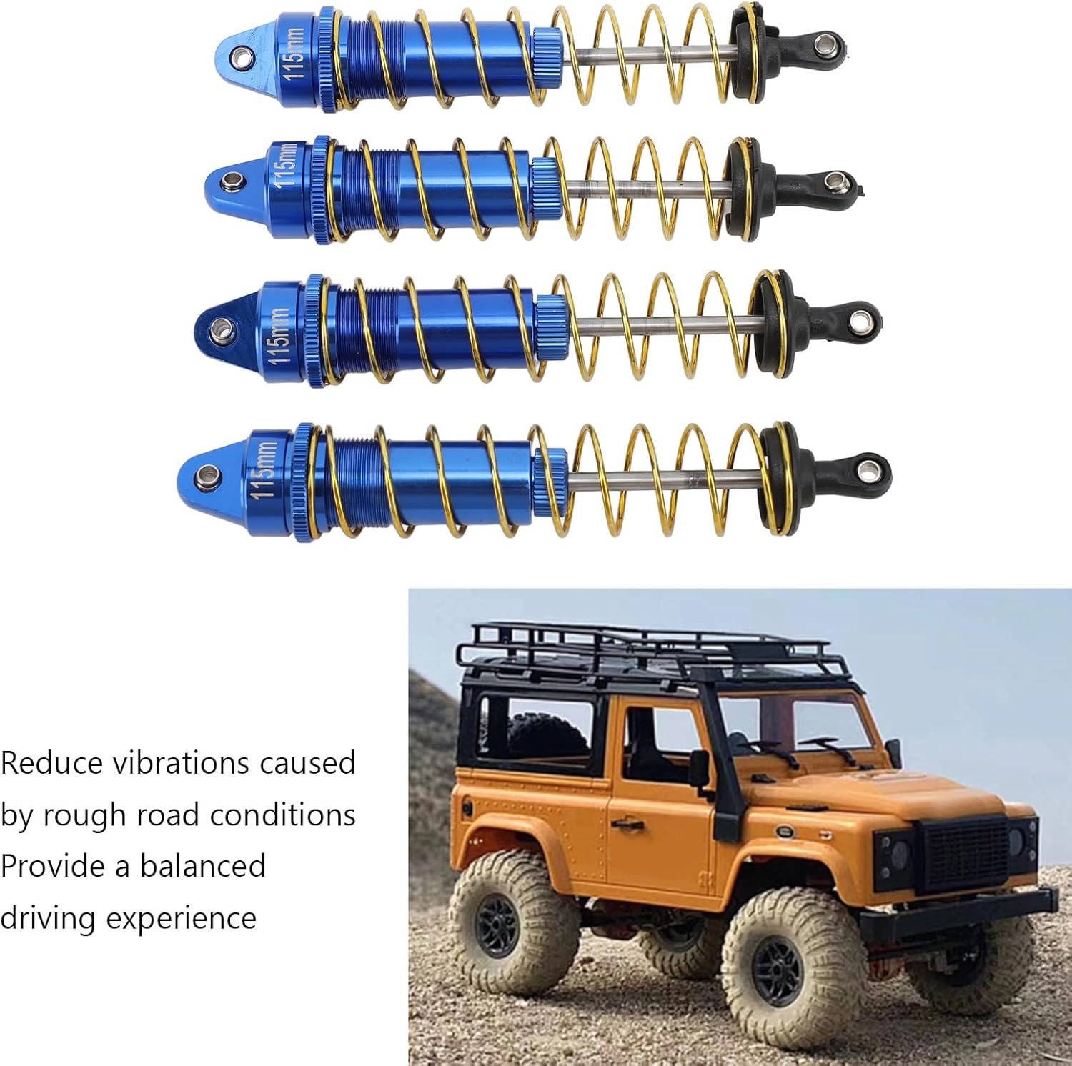 Riduci le vibrazioni: l'ammortizzatore per auto RC può ridurre le vibrazioni causate da condizioni stradali accidentate e fornire un'esperienza di guida equilibrata Modello applicabile: l'ammortizzatore in lega di alluminio da 115 mm è adatto per auto cingolate 1/10 RC. L'ammortizzatore è costruito per resistere ai terreni più difficili. Materiale durevole: l'ammortizzatore per auto cingolata 1/10 RC è realizzato in materiale in lega di alluminio, robusto e durevole, può essere utilizzato a lungo. Installa e sostituisci: l'ammortizzatore RC da 115 mm è facile da installare e smontare e puoi sostituire direttamente l'ammortizzatore vecchio o danneggiato. Molla ad alta elasticità: l'elevata elasticità della molla garantisce un effetto smorzante e migliora la stabilità 'auto telecomandata.