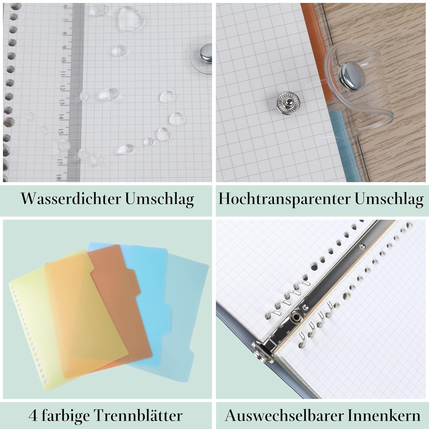 Pro Das Aussehen entspricht den Produktfotos. Die Maße wurden seitens des Herstellers korrekt angegeben. Der Umschlag ist biegsam und dennoch robust. Die Buchseiten sind deshalb ausgezeichnet geschützt, zudem ist der Umschlag einfach zu reinigen. Seine Transparenz ist praktisch. Auf diese Weise sind Informationen ersichtlich, ohne das Buch öffnen zu müssen. Der Druckknopf an der Schließe lässt sich mühelos bedienen und hält zuverlässig. Letzteres gilt ebenso für die Spirale. Sie lässt sich öffnen und wieder schließen, auch hier steht einer komfortablen Bedienung nichts im Wege. Das Notizbuch ist dementsprechend wieder auffüllbar. Ein durchsichtiges Lineal gehört zum Lieferumfang. Es kann ohne Probleme an der Metallspirale verwahrt werden. Das im Buch befindliche Papier ist von guter Qualität. Es ist in einem etwas dunkleren Weißton gehalten und deshalb angenehm zu bearbeiten und anzusehen. Tinte wird von den Buchseiten bestens aufgenommen und drückt nicht zur Rückseite durch. Die Karos haben die ideale Größe. Sie sind hervorragend sichtbar, ohne störend zu wirken. Die Trennseiten sind in vier verschiedenen Farben gehalten. Diese sind dezent. Das Material ist leicht transparent. Das ist ein Vorteil für die Nutzung und die Optik, denn der Text bleibt dank der Transparenz trotz der Trennblätter sichtbar und das Notizbuch wirkt so nicht klobig. Kontra Bislang konnte ich nichts Nachteiliges feststellen. Fazit Das hier zu bewertende Produkt wirkt auf den ersten Blick unscheinbar und schlicht. Bei genauerer Betrachtung merkt man jedoch, dass man es mit einem praktischen und durchdacht gestalteten Notizbuch von guter Qualität zu tun hat. Ich möchte es keinesfalls mehr missen und empfehle es uneingeschränkt weiter.