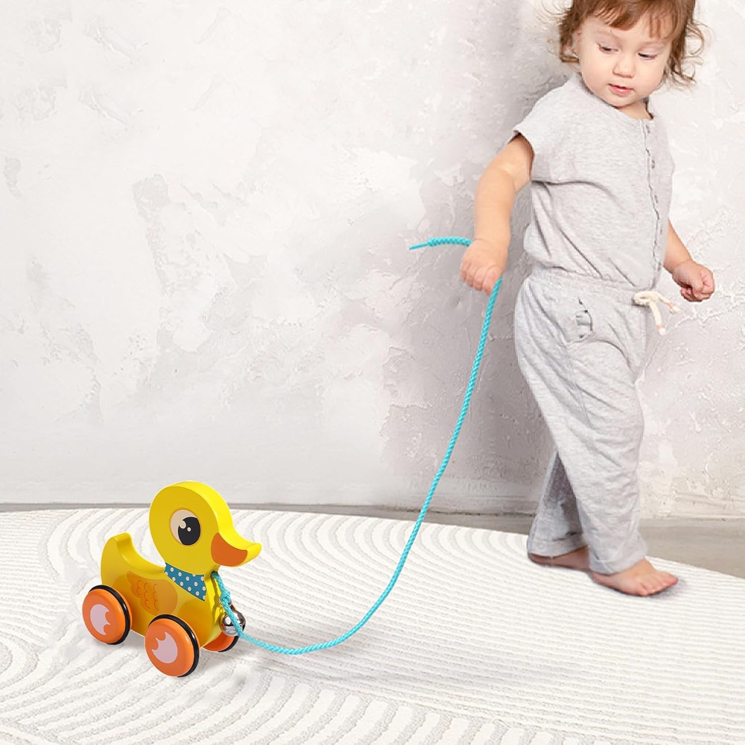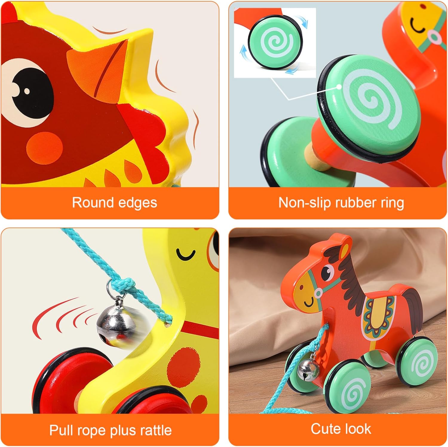 Perfetto per i più piccoli: ideale per i bambini di età compresa tra 1 e 3 anni, questo giocattolo a forma di anatra in legno è un pensiero per compleanni, vacanze o occasioni speciali..È un giocattolo senza tempo che non solo intrattiene ma supporta anche importanti traguardi dello sviluppo. Gioco interattivo coinvolgente: il nostro giocattolo da tirare per bambini in legno presenta un design delizioso che affascina i più piccoli con il suo aspetto affascinante..La campana allegata aggiunge una funzione uditiva, rendendo il gioco più coinvolgente e divertente per il tuo piccolo! Promuove le abilità di sviluppo: questo giocattolo interattivo da tirare per bambini è progettato per aiutare a sviluppare abilità essenziali come mobilità, equilibrio e coordinazione occhio-mano..Incoraggiare i bambini a trascinare il giocattolo favorisce il movimento e sostiene lo sviluppo fisico nei bambini piccoli. Ruote lisce e antiscivolo: le ruote antiscivolo forniscono un'eccellente trazione su varie superfici, consentendo ai bambini di tirare la loro papera senza scivolare o versare liquidi..Questa caratteristica migliora la stabilità e incoraggia il movimento sicuro mentre esplora l'ambiente circostante. Materiali sicuri e affidabili: realizzato in legno atossico, questo giocattolo a forma di anatra garantisce un'esperienza di gioco sicura per il tuo bambino..La sua struttura robusta garantisce che possa resistere ai rigori del gioco quotidiano, rendendolo un favorito di lunga durata.