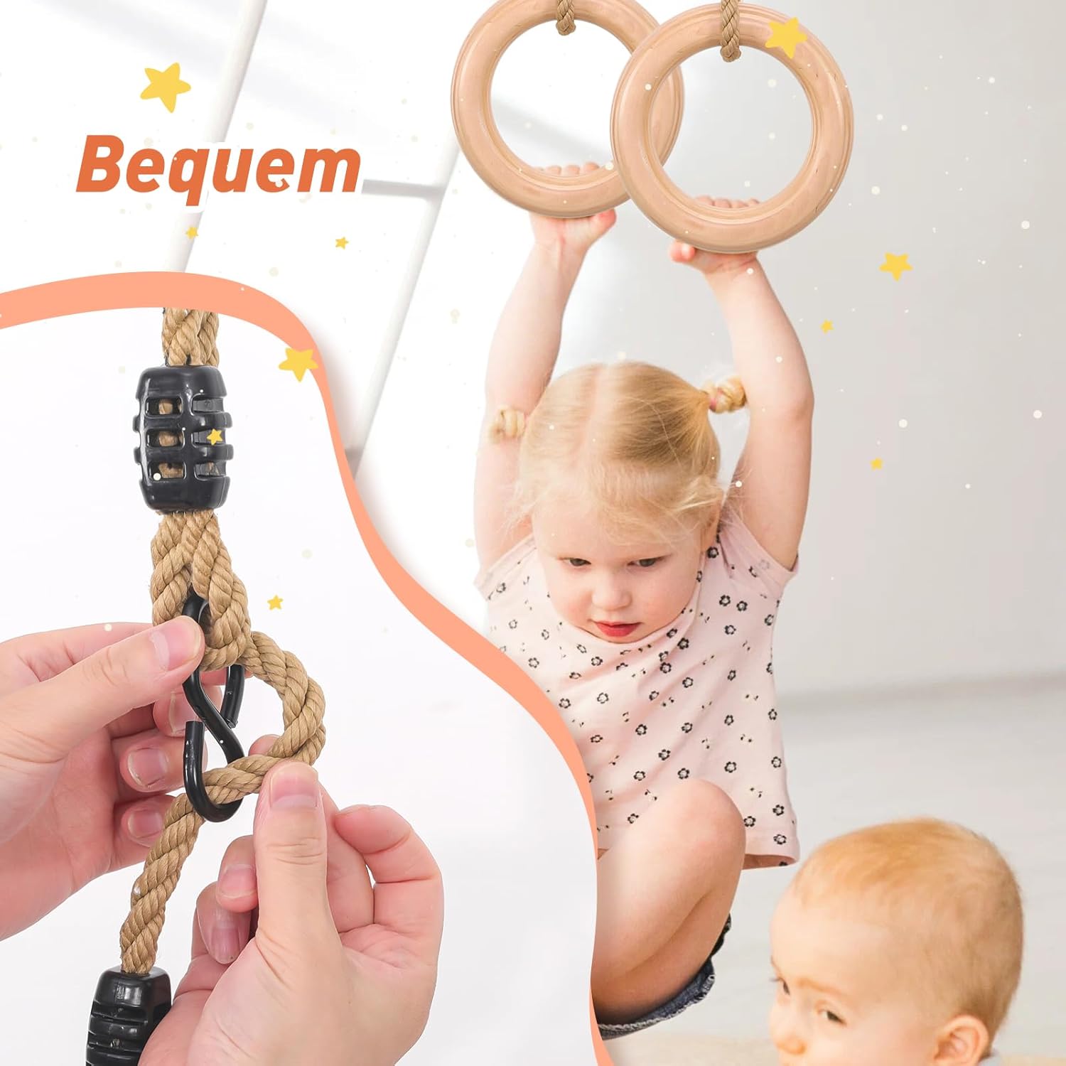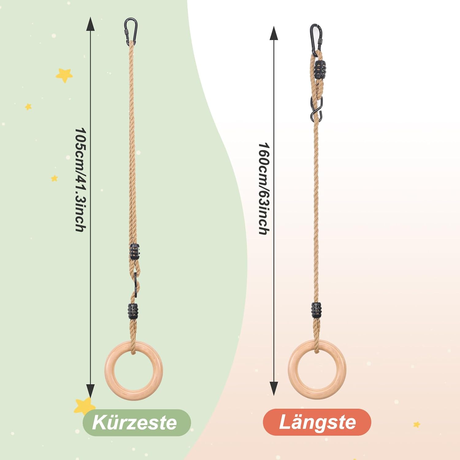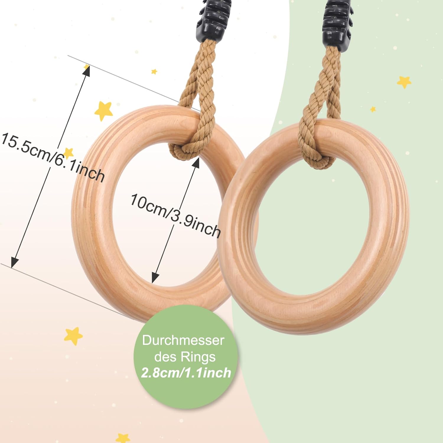 Legno di alta qualità - I nostri anelli da ginnastica realizzati in legno robusto offrono stabilità e una presa sicura. Ideale per bambini e adulti fino a 100 kg. (Nota: oggetti in legno, mantenerli asciutti! Evitare la pioggia o il bagnato quando si utilizza all'aperto. Ricordarsi di portarli in casa immediatamente dopo l'uso per farli durare più a lungo). Corde in sisal durevoli - I nostri anelli da ginnastica sono dotati di corde in sisal durevoli per maggiore sicurezza e longevità. Le corde sono regolabili e offrono una regolazione flessibile dell'altezza. Versatile: adatto per interni ed esterni, nella cameretta dei bambini, in giardino o sugli alberi. Facile da montare. Promuove la forma fisica e la coordinazione - I nostri anelli da ginnastica in legno rafforzano i muscoli, migliorano l'equilibrio e la coordinazione e promuovono lo sviluppo fisico. Facile da montare e di lunga durata - Veloce da montare grazie ai robusti anelli in metallo. Dopo l'uso, conservare in un luogo asciutto per prolungarne la durata ed evitare l'esposizione a lungo termine agli agenti atmosferici.