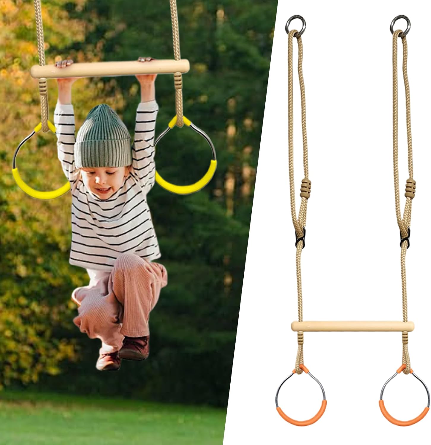 Uso durevole: robusto telaio in metallo per uso esterno frequente. Resiste all'uso dei bambini e mantiene la stabilità ai telai delle porte del tronco d'albero. I componenti resistenti all'usura prolungano la durata senza compromettere la sicurezza. Orientamento dello spazio: partecipazione a un divertente gioco sensoriale con anelli oscillanti per aumentare la consapevolezza spaziale. Attiva le risposte vestibolari e supporta lo sviluppo delle capacità motorie alternando il gioco attivo e passivo per la scoperta Design di allenamento giocoso: il sistema a doppia impugnatura supporta lo sviluppo del controllo del corpo e la stabilità del tronco. Promuove il movimento giocoso e la forza superiore del corpo attraverso un uso regolare. Montaggio rapido: consente il fissaggio senza fori grazie alla struttura modulare, facile regolazione e montaggio rapido in pochi passaggi per un utilizzo immediato Alta compatibilità: progettato per l'uso con alberi a più colonne, questo versatile set da gioco supporta la progettazione di un giardino adatto al fuoco. Ha una struttura universale progettata per adattarsi a diversi scenari e offre maggiori opportunità per un'esperienza di gioco speciale.