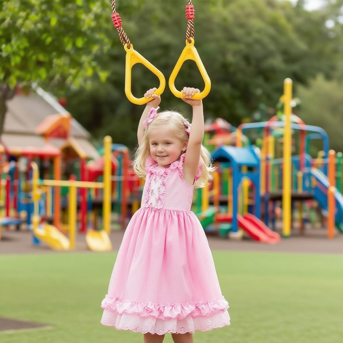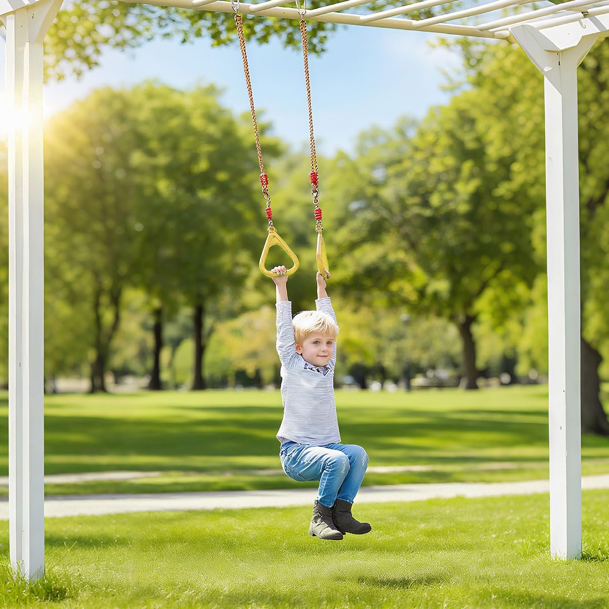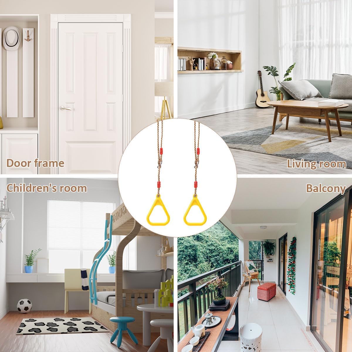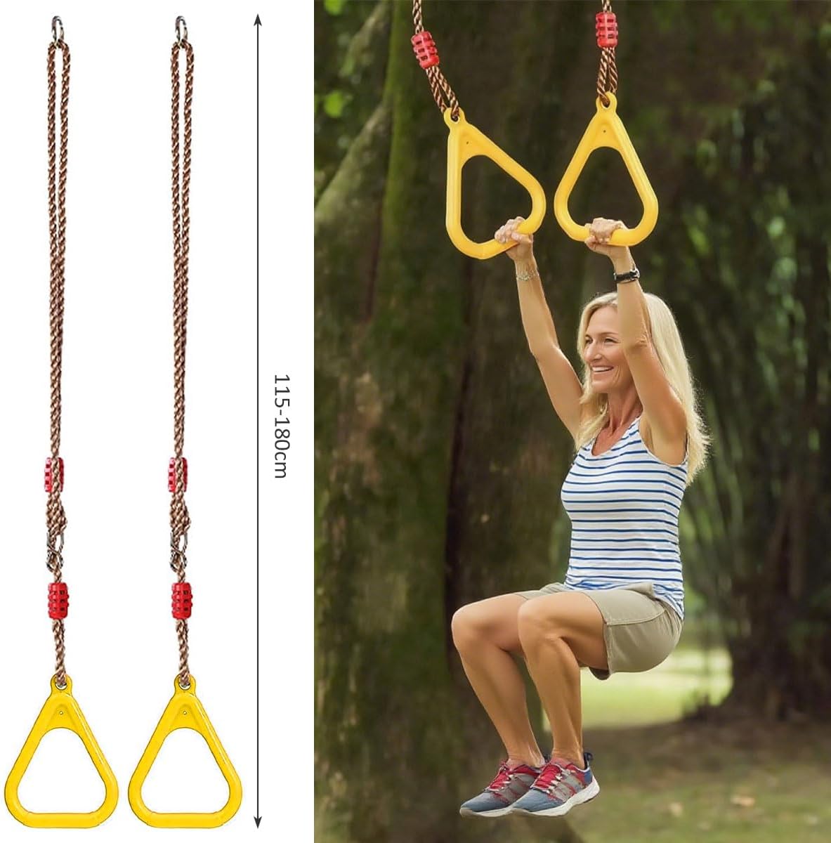 【Multifunzione】: Anelli trazioni può essere utilizzato come anelli sospesi e anelli da ginnastica. Anelli palestra è anche l'accessorio ideale per strutture da arrampicata esterne o interne. Anelli allenamento calisthenics è anche molto adatto come regalo di Natale e compleanno. 【Lunghezza Regolabile】: Altalena ginnastica ad anelli è dotato di corde e anelli metallici a lunghezza regolabile per un appendaggio e una rimozione rapidi e facili. Anelli da ginnastica per bambini è facilmente adattabile a diverse altezze e esigenze, il che è particolarmente vantaggioso per soddisfare le esigenze di bambini e adulti. 【Facile da Trasportare e Installare】: Anelli calisthenics per bambini viene fornito con un paio di anelli, due moschettoni e due cinghie di collegamento, che possono essere facilmente fissati a qualsiasi supporto. Calisthenics rings per bambini è facile da trasportare e installare, voi e la vostra famiglia potete montarlo facilmente e divertirvi. 【Sicurezza e Robustezza】: Le maniglie triangolari di anelli trazioni per bambini sono antiscivolo e senza bave, non feriranno le mani dell'utente. La corda di anelli palestra per bambini è robusta e resistente all'usura, con una capacità di carico estremamente elevata, può sopportare fino a 100 kg. I moschettoni di anelli allenamento calisthenics per bambini sono anche resistenti all'usura e alla corrosione, fornendo stabilità aggiuntiva e lunga durata. 【Salute Fisica e Mentale】: L'uso di altalena ginnastica ad anelli per bambini può migliorare la forma fisica e la resistenza dell'utente. L'utente può, attraverso l'allenamento con altalena con anelli da ginnastica, aumentare la forza e la flessibilità, e migliorare il controllo del corpo e il senso dell'equilibrio. Anelli ginnastica aiuta simultaneamente a rilassare corpo e mente e ad alleviare lo stress.