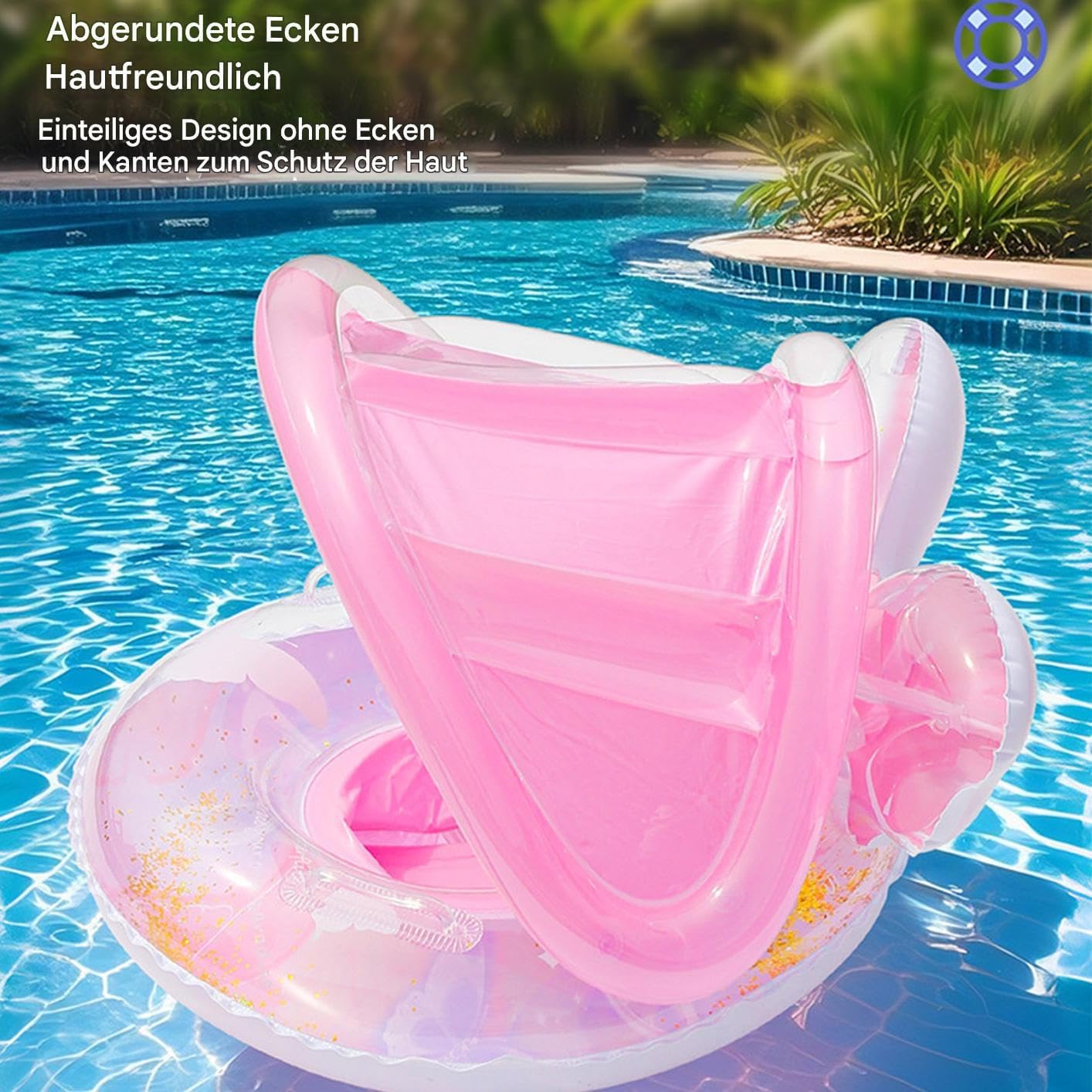 Sicurezza e adattamento: sedile a forma di croce con valvola di sicurezza salvaspazio che offre una presa regolabile per bambini da 6 mesi a 4 anni, si adatta perfettamente a qualsiasi fase di sviluppo in acqua. Veloce da usare: l'ausilio per bambini è compatto e viene fornito con una pratica borsa per il trasporto per riporlo facilmente. Le doppie camere d'aria garantiscono un gonfiaggio senza sforzo, permettendo al bambino di sguazzare rapidamente. Copertura resistente alle intemperie: il tetto di protezione UV rimovibile offre una protezione solare affidabile in tutte le condizioni di luce, facile da maneggiare grazie alla regolazione semplicissima Materiali delicati sulla pelle: i tessuti lavorati di alta qualità garantiscono la massima tollerabilità sulla pelle, mentre il design a farfalla con paillettes integrate attira l'attenzione e contribuisce alla positiva associazione dell'acqua Confortevole esperienza di nuoto: distribuzione uniforme della pressione di galleggiamento grazie alla stabilizzazione del sedile e alla valvola durevole per uno sbuffamento rilassato