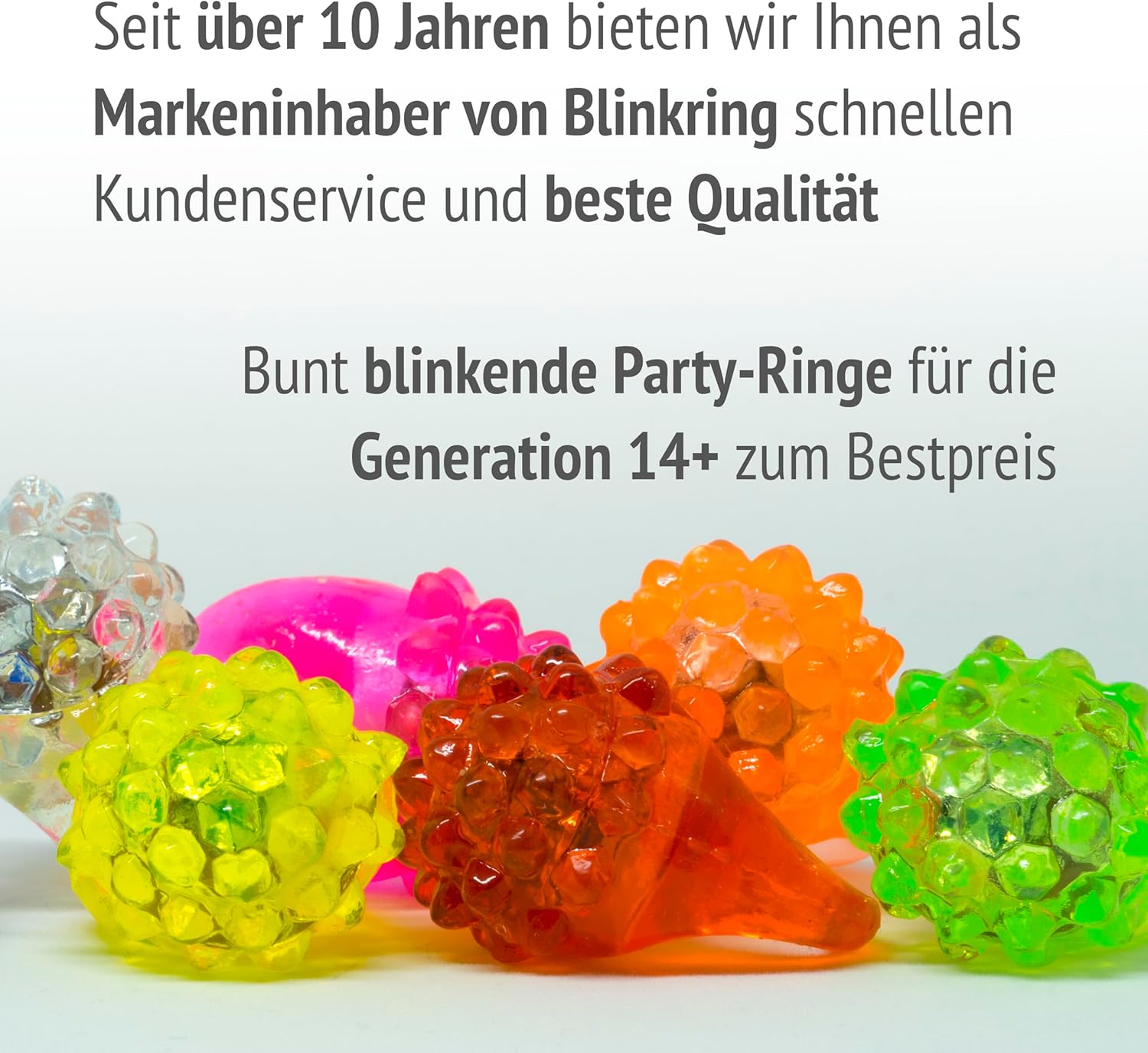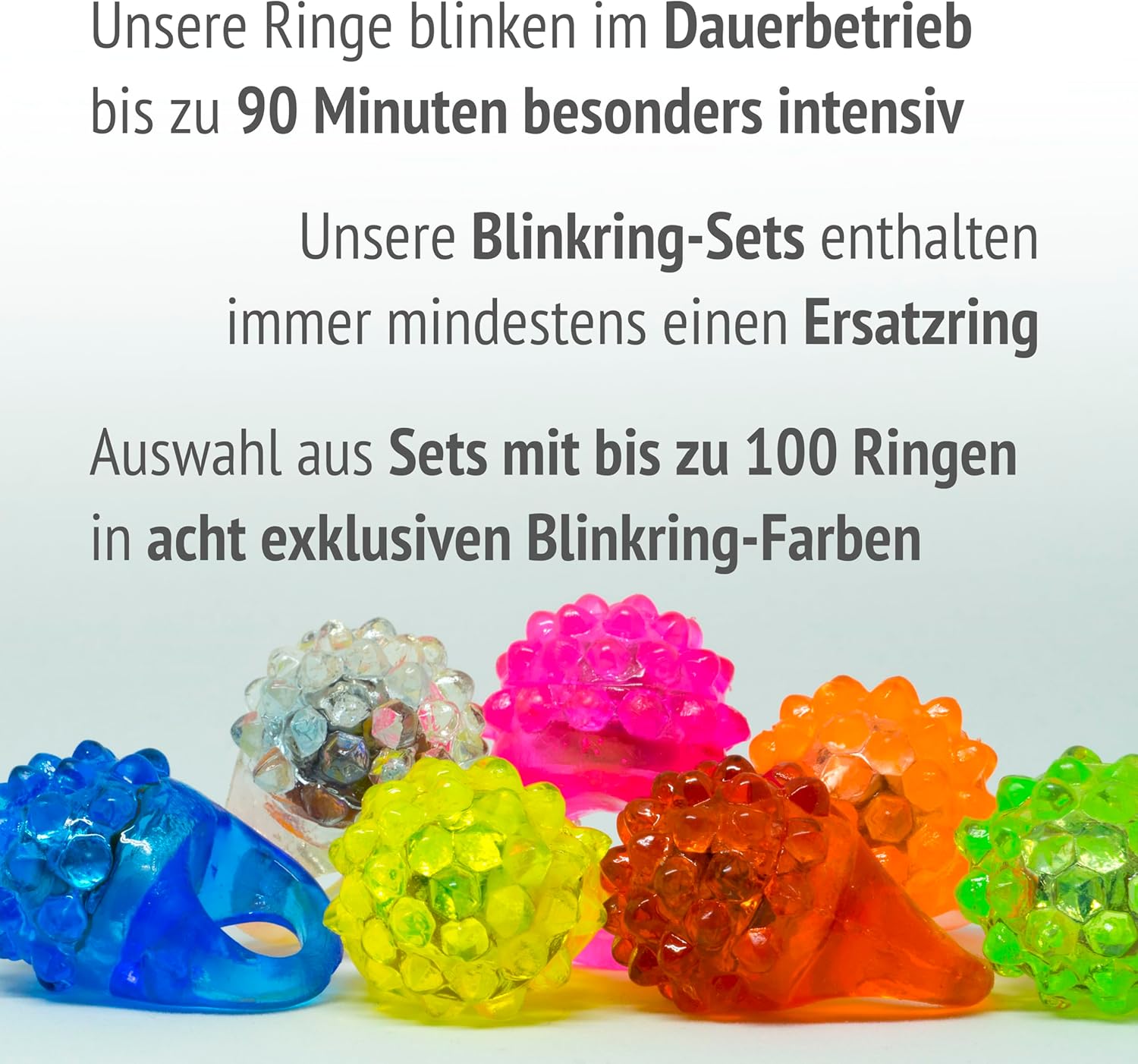 Haben hier jetzt alle Blinkringe von den verschiedenen Anbietern getestet, aber diese sind am besten. Haptik und Lebensdauer sind topp. Lassen sich gut tragen. Ich bin DJ und verteile sie auf Hochzeiten und Geburtstage. Die weiblichen Gäste sind immer begeistert. Ganz klare Kaufempfehlung.