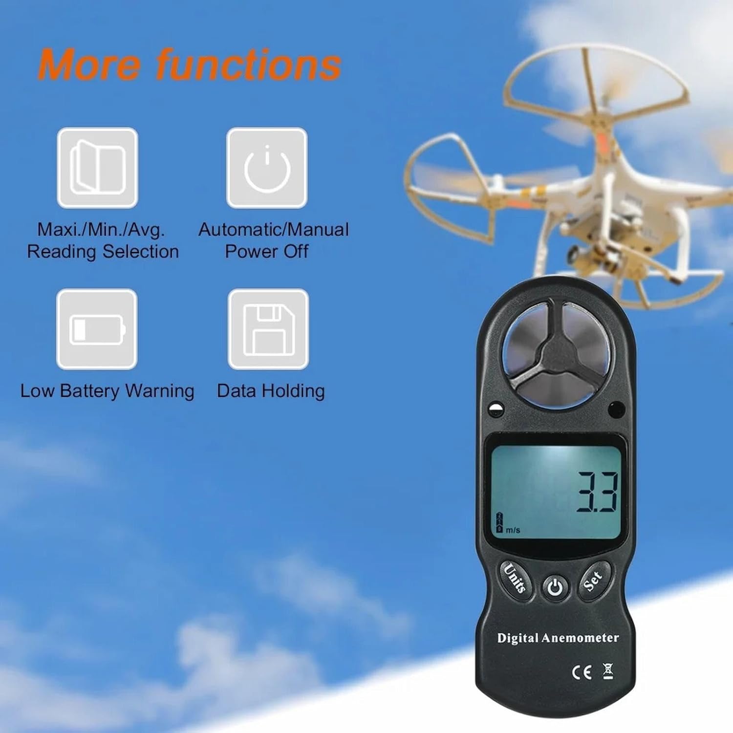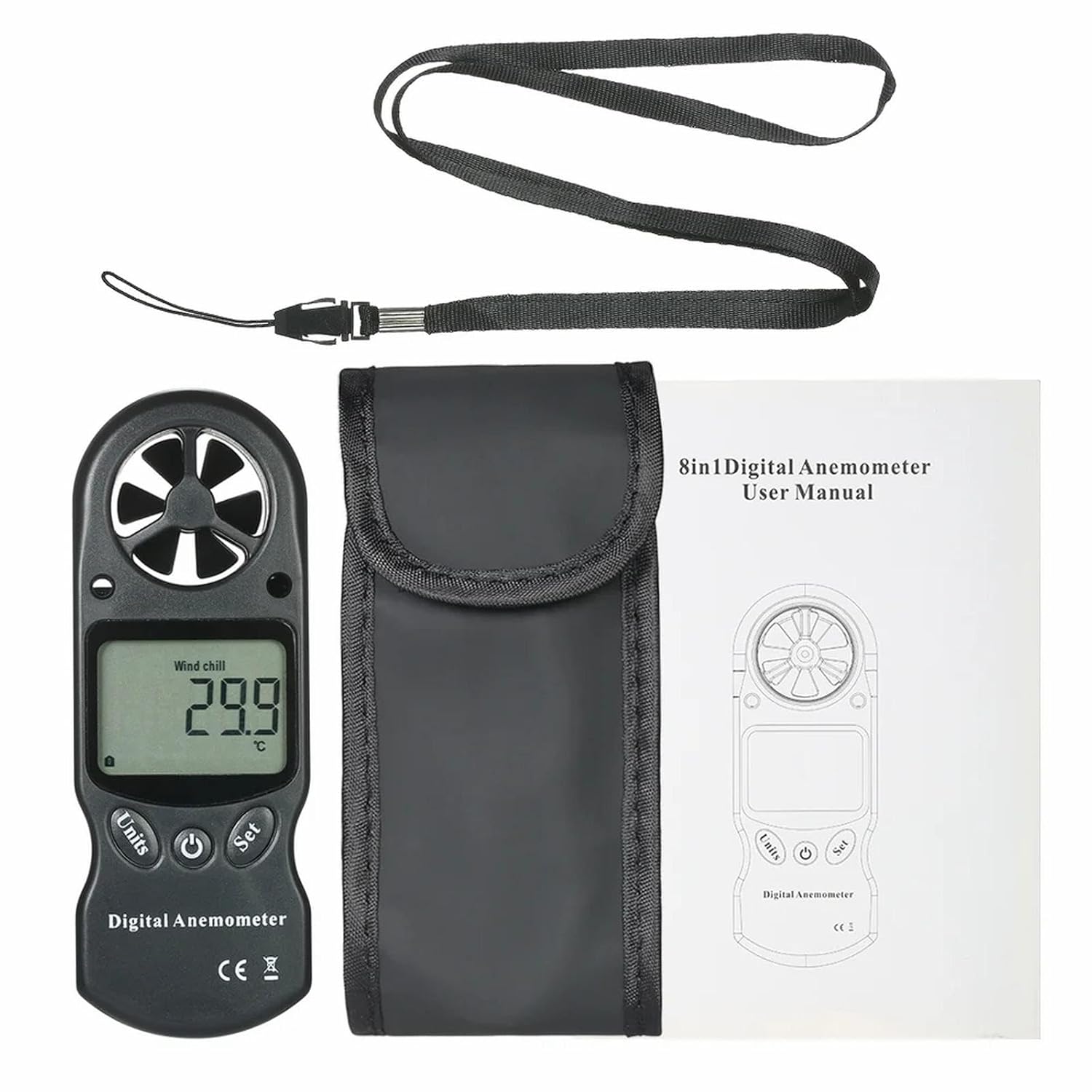 Funzione di misurazione del valore massimo, minimo e medio (per tutte le modalità di misurazione). Anemometro digitale 8 in 1 per misurare aria, temperatura, umidità, freddo, indice di calore, punto di rugiada, pressione barometrica e altitudine. Selezione °C/°F, selezione unità velocità del vento: M/s, ft/min, nodi, km/h, mph. Display LCD con retroilluminazione bianca per una lettura chiara.