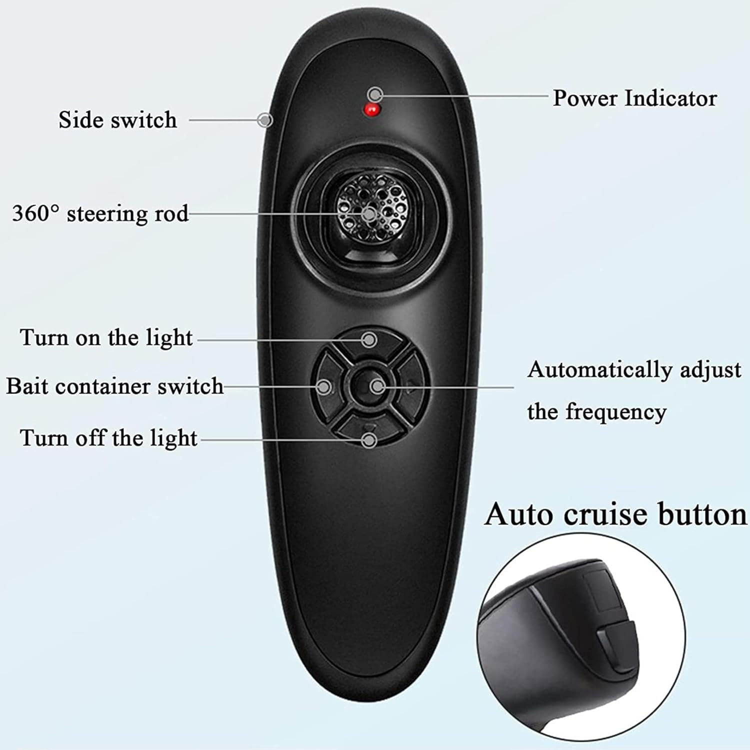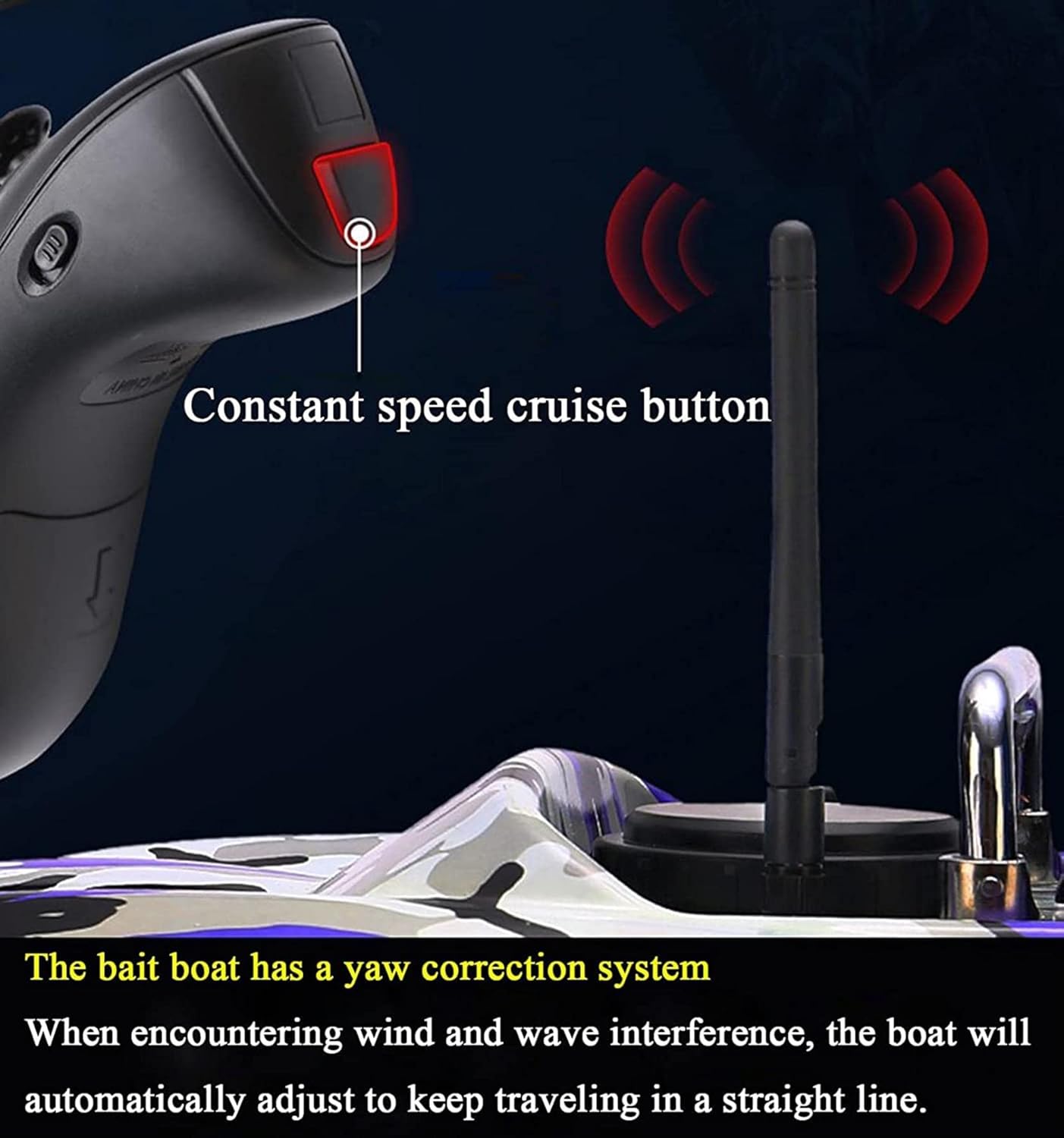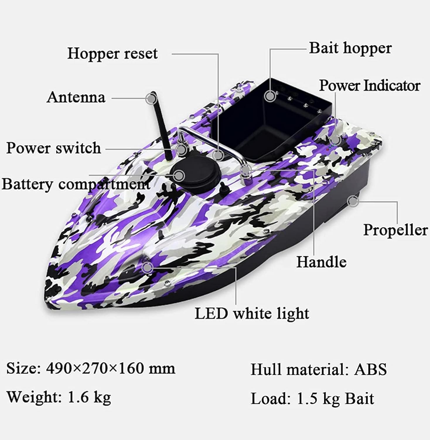 (Barca intelligente per mangimi): la barca per mangimi per pesci è dotata di potenti doppi motori e doppie eliche. È possibile controllare efficacemente la direzione della barca tramite il telecomando wireless e lanciare l'esca esattamente nel punto focale entro 500 m. Crociera automatica con un pulsante, giroscopio incorporato, la rotta si calibra automaticamente per evitare eccessivi movimenti dovuti al vento e alle onde durante la navigazione. (Contenitore per esche indipendente): la barca di alimentazione telecomandata è dotata di un contenitore per esche di grande volume, in grado di assorbire 2,0 kg di esche diverse, come esche di mais, esche in pellet ed esche miste, ecc. Il contenitore per esche può contenere ami e retini, il che migliora notevolmente l'efficienza della pesca. (Fusoliera completamente chiusa): la barca esca impermeabile è realizzata in materiale ABS, che ha una forte resistenza agli urti e all'abrasione. La fusoliera aerodinamica può ridurre la resistenza al vento e ha una messa a fuoco stabile. È adatta per attività di pesca in una varietà di acque come stagni, fiumi e laghi. (Illuminazione a LED): lo stivale Fischkader è dotato di 2 luci LED bianche e 2 luci di visualizzazione blu, che possono determinare chiaramente la posizione della barca e posizionare l'esca con precisione, il che è molto adatto per gli amanti della pesca alla carpa notturna. (Batteria al litio ad alte prestazioni): la barca da pesca è alimentata da una batteria al litio da 5200 mAh 9600 mAh. Può essere caricata separatamente ed è facile da installare. Dopo ogni carica completa, la batteria da 5200 mAh può essere utilizzata per circa 2-3 ore e la batteria da 9600 mAh per circa 4-5 ore. È possibile selezionare batterie diverse in base alle esigenze. La barca da pesca è molto adatta per la pesca alla carpa.