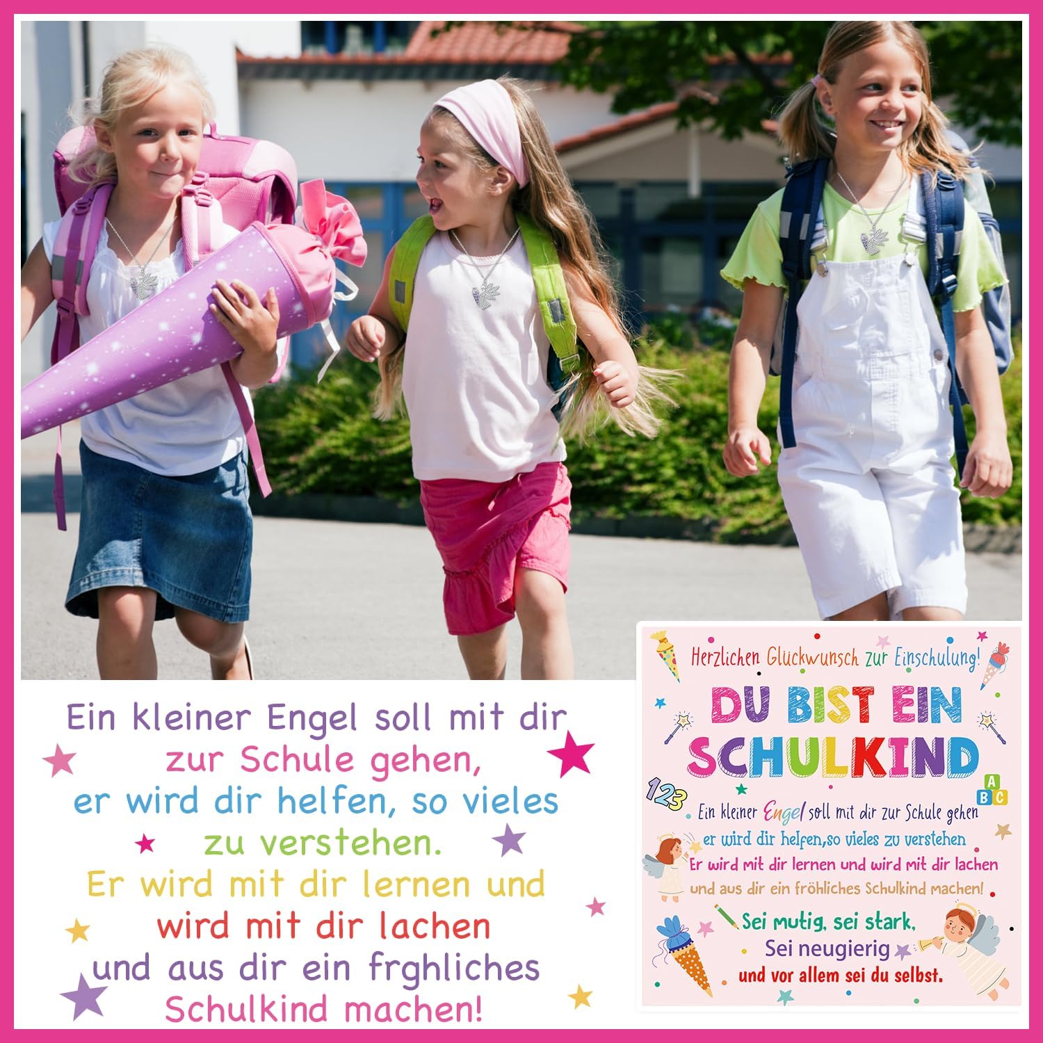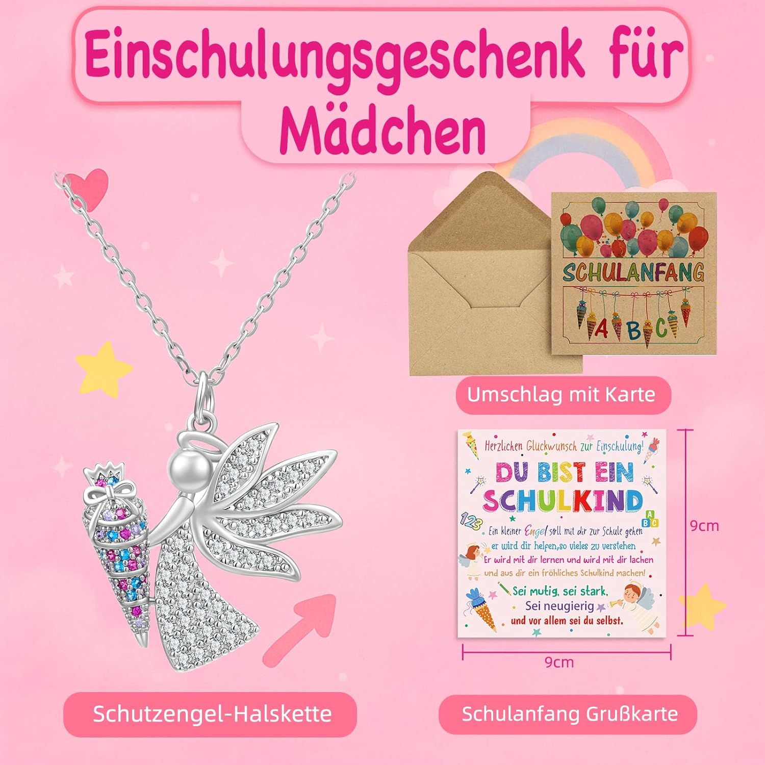 Regalo per le ragazze che iniziano la scuola nel 2025: festeggia il traguardo dell'inizio della scuola con questa incantevole collana con angelo custode e set di biglietti - uno speciale regalo per l'inizio della scuola per ragazze appositamente progettato per dare alle ragazze una sensazione di sicurezza e anticipazione per la loro nuova fase della vita da scolari nel 2025. Una scelta ideale per genitori o nonni per creare un ricordo duraturo. Design incantevole: la collana con angelo custode presenta un ciondolo a forma di angelo realizzato con cura con scintillanti pietre di zirconia cubica che simboleggiano cura e protezione. L'angioletto tiene in mano un cono scolastico colorato: un'ispirazione per il contenuto del cono scolastico per ragazze e un simbolo per l'inizio della scuola. Lavorazione di alta qualità: questa collana con angelo custode è stata realizzata con cura pensando alle ragazze delle scolaresche del 2025. La catena è realizzata in acciaio inossidabile resistente ai colori e alla ruggine: comoda da indossare e ideale per l'uso quotidiano. Il pendente in rame è decorato con cristalli di zirconia colorati e ha un aspetto amorevole e di alta qualità. I materiali utilizzati sono senza piombo, senza nichel e delicati sulla pelle dei bambini: un accompagnamento bello e duraturo all'inizio della scuola. Combinazione sensata: la combinazione armoniosa di angelo custode e cono scolastico conferisce all'inizio della scuola una profondità emotiva speciale. Questo regalo è un'eccellente aggiunta al contenuto dello zaino scolastico per ragazze e avvicina i bambini in modo giocoso a questa bella tradizione - ideale per tutti coloro che dicono: "Finalmente uno scolaro nel 2025!" REGALO PERFETTO PER IL RIENTRO A SCUOLA: dotata di un biglietto con un messaggio sincero, questa collana con angelo custode è un regalo dolce e significativo per tua figlia, nipote o nipote. Sia come regalo di compleanno o per l'inizio della scuola, porta felicità e amore sul nuovo percorso da scolaretta 2025.