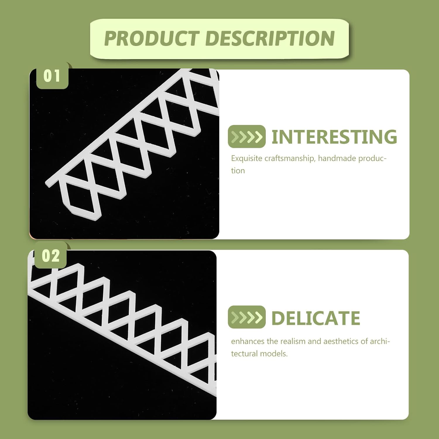 Realismo migliorato: questi materiali per modelli di tavolo in sabbia sono realizzati con cura per aggiungere autenticità e bellezza ai tuoi modelli architettonici Uso multiscena: ideale per vari ambienti come layout di giardini domestici e scene stradali in miniatura, aumentando l'attrattiva visiva e il coinvolgimento Facile installazione: il modello di corrimano per scale è progettato per una facile installazione e si adatta perfettamente a vari stili architettonici Qualità durevole: questi materiali paesaggistici in miniatura sono realizzati con materiali durevoli e resistono bene anche con un uso o posizionamento frequente Proporzioni corrispondenti all'aspetto: questi accessori per modelli di edifici misurati e proporzionati con precisione garantiscono un corretto adattarsi al modello principale ed evidenziare i dettagli più fini