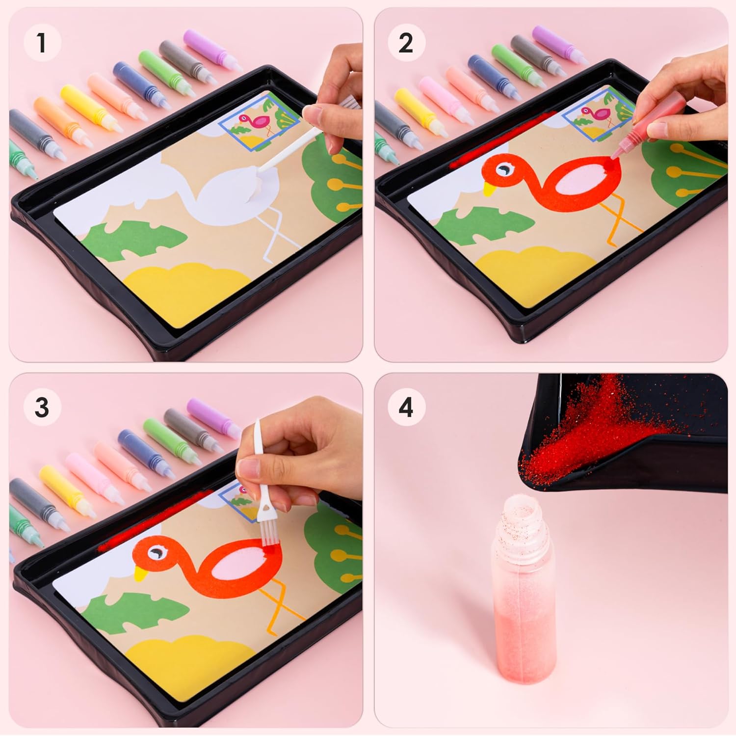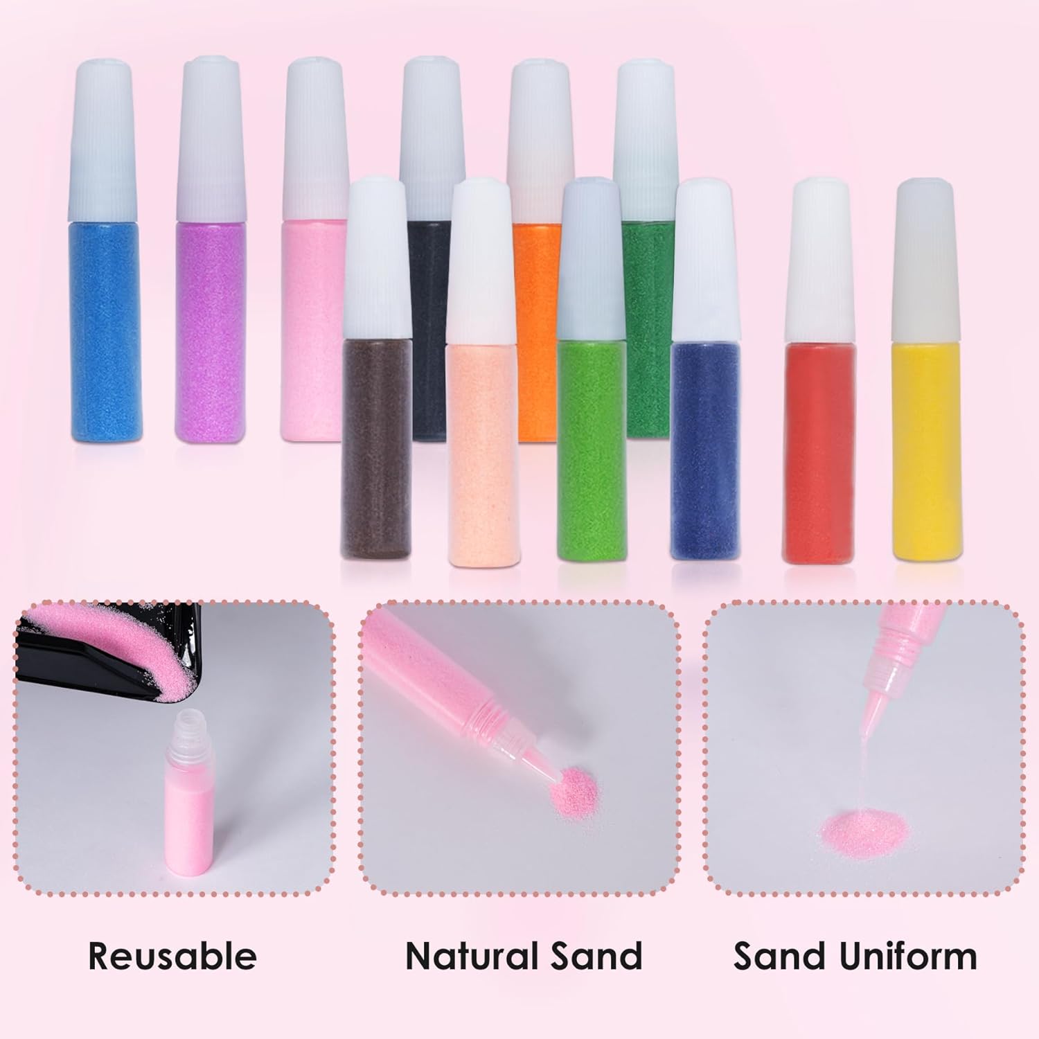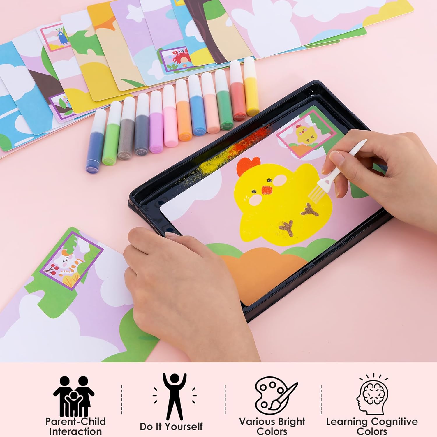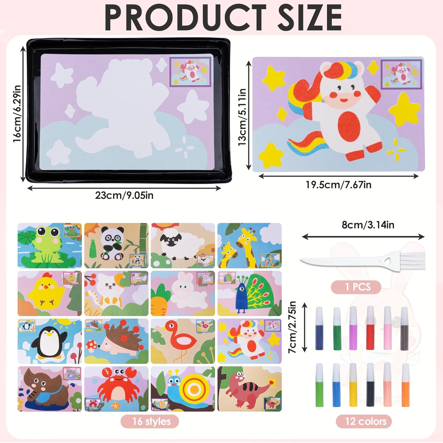Imballaggio e dimensioni: i kit di arte della sabbia per bambini includono 16 carte dei cartoni animati, 12 bottiglie di sabbia colorata, più 1 tavolo da disegno e 1 pennello da pittura. Ogni biglietto misura 19 x 13 cm, perfetto per lavori artigianali in classe o feste per bambini Materiali di alta qualità: le immagini di sabbia presentano un design autoadesivo pretagliato con taglio preciso e offrono una forte adesione. La sabbia colorata è realizzata in sabbia dolomitica, sicura, a grana fine, con colori naturali resistenti allo sbiadimento Facile e divertente da giocare: la sabbia per bambini basta staccare la pellicola protettiva, cospargere la sabbia, spazzolare via l'eccesso: tre semplici passaggi per creare splendide immagini di arte della sabbia! La sabbia in eccesso è facile da riutilizzare e i bambini possono godere di un gioco indipendente e senza disordine con risultati soddisfacenti Giocattolo educativo ideale: la nostra sabbia colorata include 16 simpatici motivi di animali come gatti, giraffe ed elefanti. Suscitano l'interesse dei bambini per la natura e l'arte, migliorando la coordinazione occhio-mano, la percezione del colore e la creatività artistica Regalo artigianale di alta qualità: set di animali di sabbia con confezione adorabile, questo kit riutilizzabile per arte della sabbia offre un divertimento creativo infinito, mescolando intrattenimento e praticità. Perfetto come regalo di compleanno o sorpresa festiva per bambini dai 3 ai 12 anni
