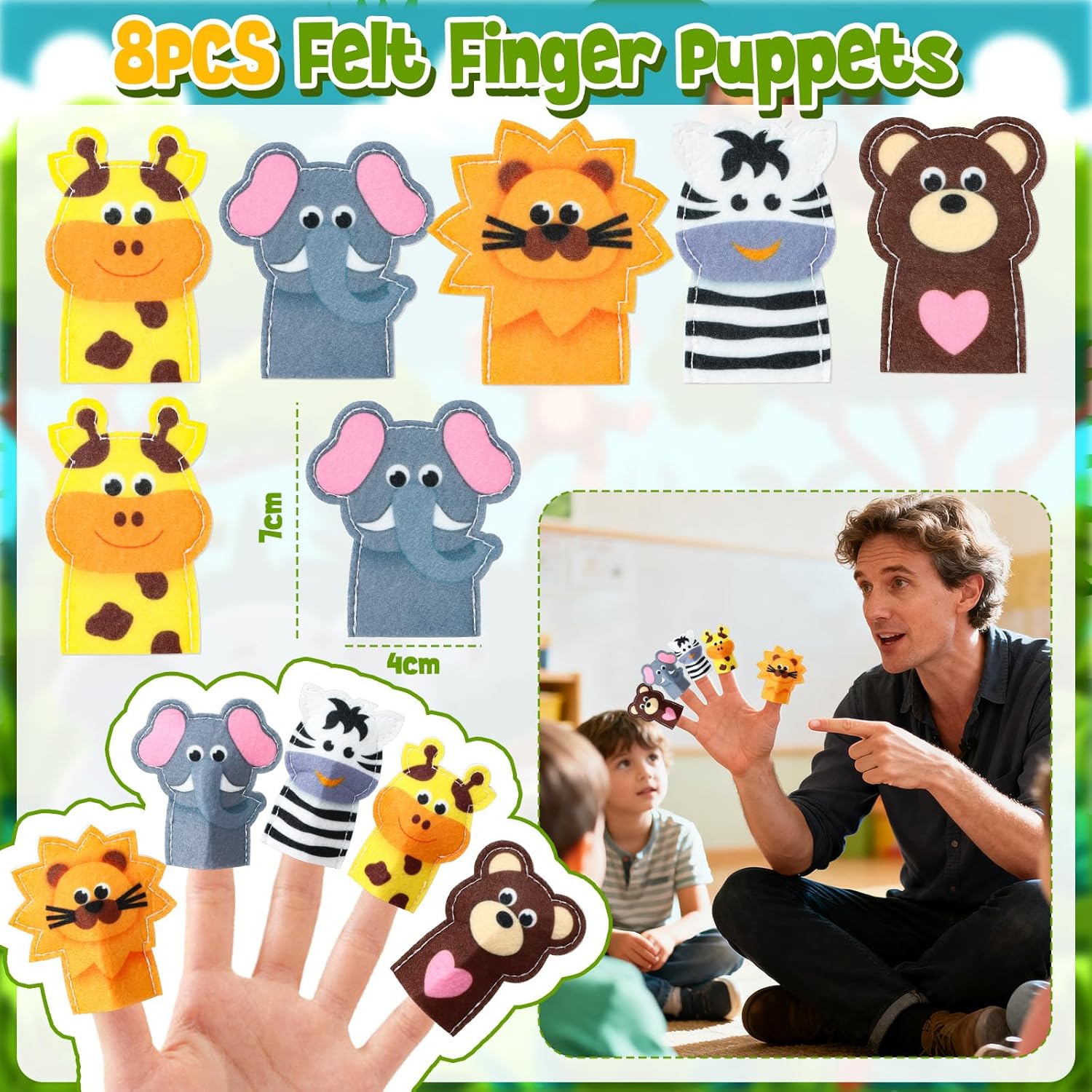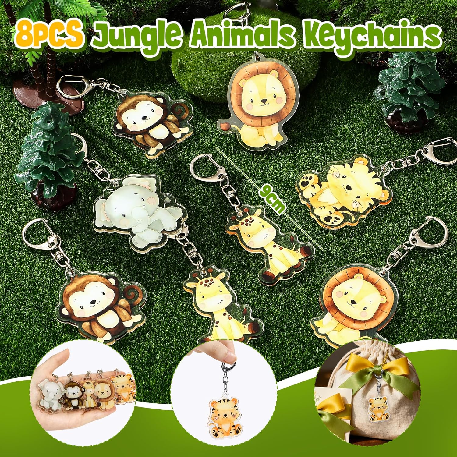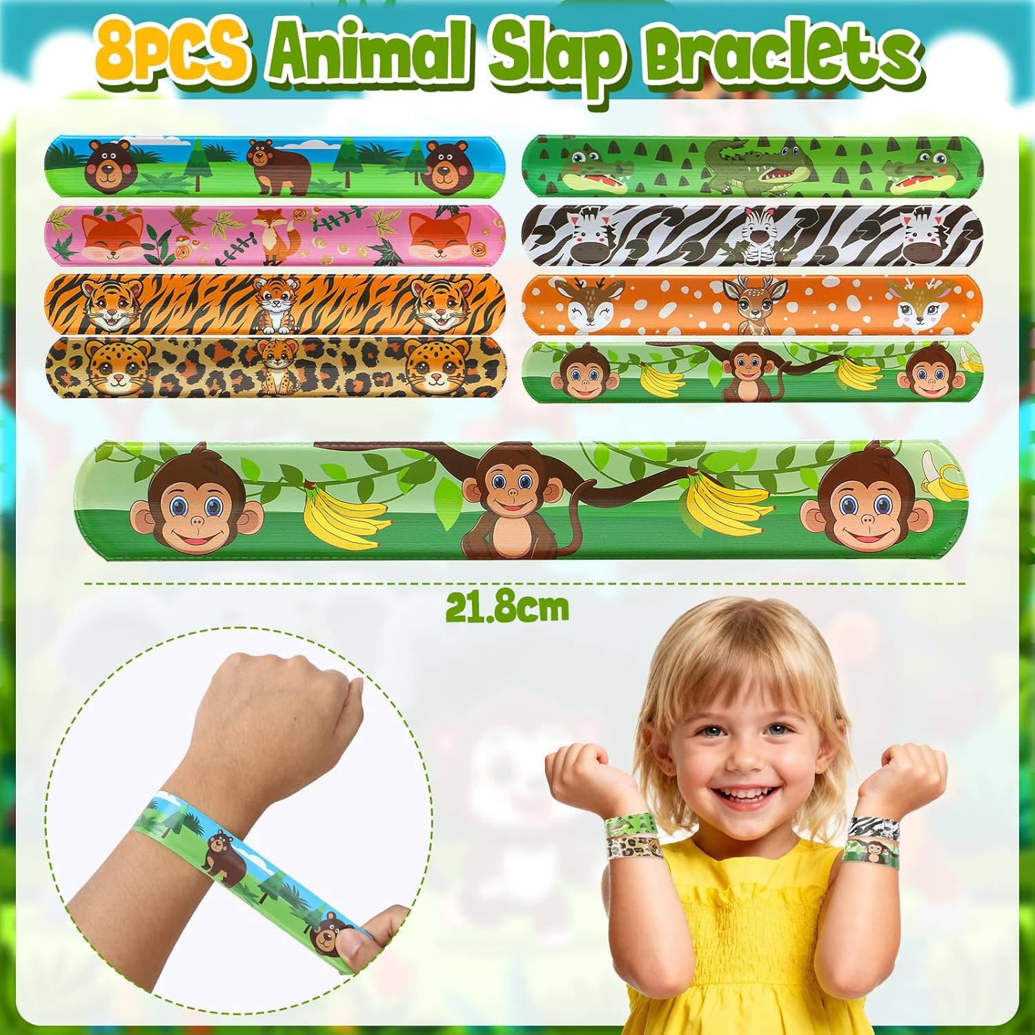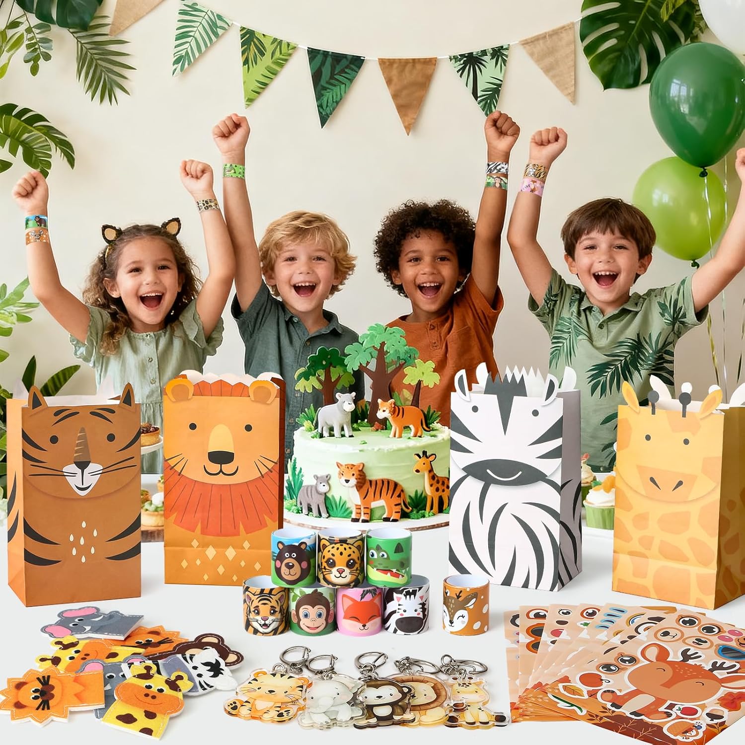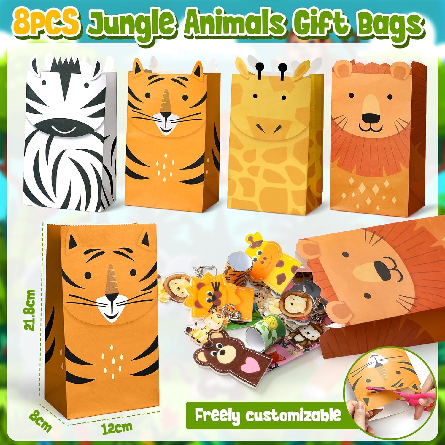 Regalini Festa Compleanno a Animali della Giungla: Un set per soddisfare le esigenze della festa di compleanno del tuo bambino. Include 8 marionette da dito animali, 8 braccialetti slap di animali della giungla, 8 adesivi fai da te, 8 portachiavi di animali e 8 sacchetti regalo (21,8 x 12 x 8 cm). Lascia che i bambini si divertano con una divertente festa di compleanno a tema safari con la famiglia e gli amici! Sacchetti Regalo per Festa per Bambini: I nostri sacchetti regalo in carta, accuratamente progettati, presentano stampe di animali, che permettono ai bambini di ritagliarli seguendo il motivo per renderli ancora più vivaci e adorabili. Puoi anche pre-riempire i sacchetti con una varietà di piccoli gadget, come giocattoli, caramelle, biscotti, snack e premi, ecc. Questo renderà la tua festa a tema animali più divertente e piena di sorprese. Vieni a distribuire i regali ai tuoi piccoli ospiti! Goditi una Festa Divertente: Questo esclusivo set di articoli per feste di compleanno presenta vari motivi ed elementi di animali selvatici, come scimmie, leoni, elefanti, tigri, zebre, volpi, giraffe, ecc. Indossa i graziosi braccialetti slap di animale e le marionette da dito per un gioco di fantasia divertente e creativo, e usa gli adesivi per creare i tuoi animali. Questo regalerà ore di divertimento e attività ai bambini. Lascia che ogni bambino si immerga in un'esperienza di festa indimenticabile! Piccoli Regali per Bambini: I nostri regalini giungla creeranno un'atmosfera a tema forte, adatti per feste allo zoo, feste con animali selvatici, feste safari, feste di compleanno per bambini e altre celebrazioni. Ottimi come gadget compleanno bambino, gadget compleanno bambina, premi in classe, premi di giochi, premi di carnevale, omaggi, souvenir per feste, regali di ritorno per feste, ecc. Materiali di Alta Qualità: Tutti i gadget giungla sono realizzati con materiali leggeri ed ecologici per garantire un gioco sicuro per i bambini. Le marionette da dito in feltro sono perfette per il gioco di ruolo e la narrazione, e i portachiavi morbidi sono classici e perfetti per decorare borse regalo o zaini. Diamo valore all'esperienza di ogni cliente: per qualsiasi domanda, non esitate a contattarci e vi risponderemo entro 24 ore. Grazie per la vostra fiducia e il vostro supporto!