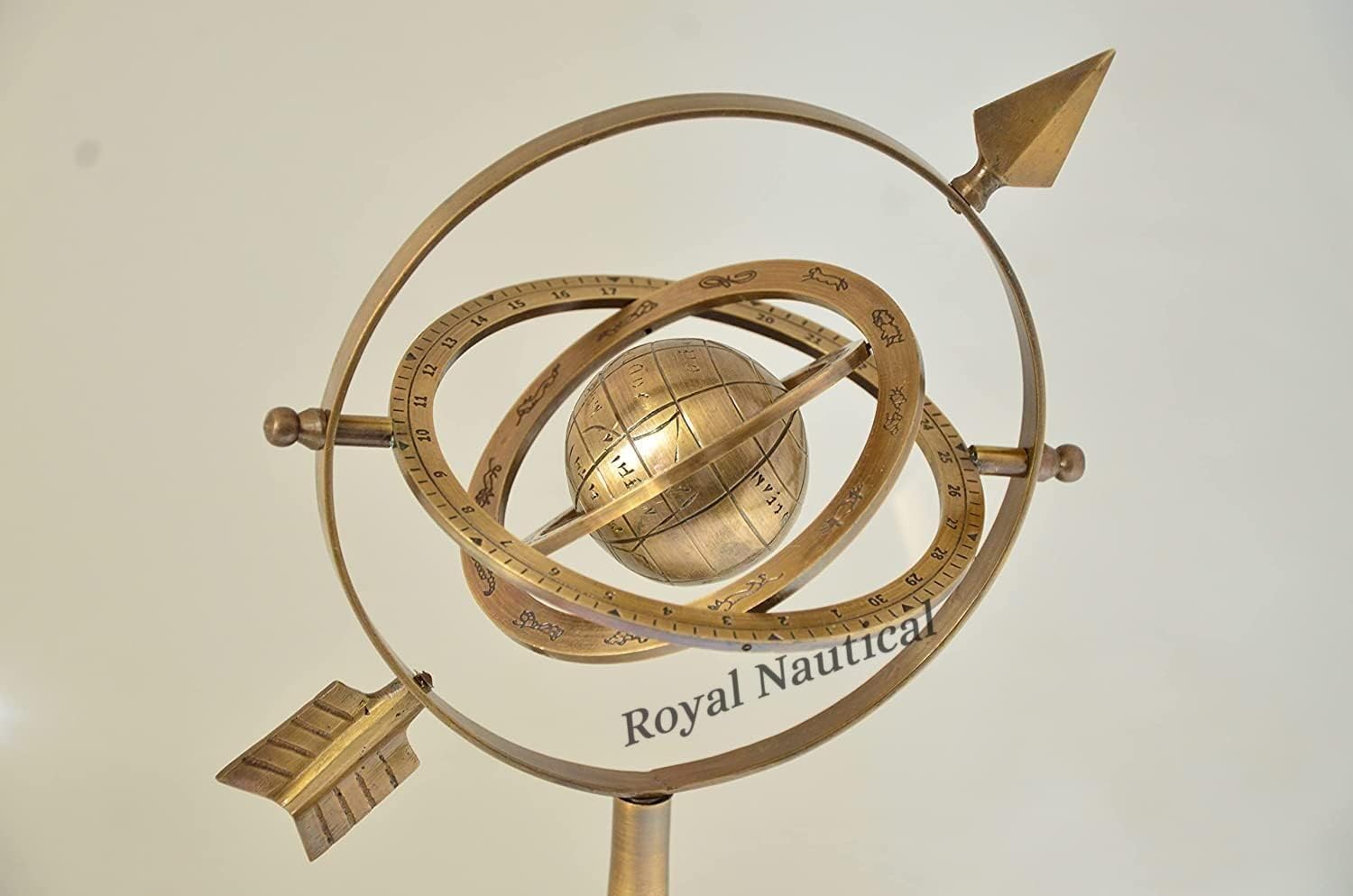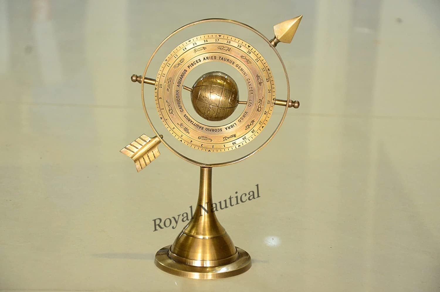 Dimensioni: lunghezza 25,4 cm, larghezza base 10,2 cm e diametro dell'anello. 17,8 cm, altezza 25,4 cm Elegante pezzo angolare per la decorazione della casa e dell'ufficio | Meravigliosa idea regalo ideale per scopi regalo Sfera armillare decorativa nautica con finitura in ottone anticato, realizzata in ottone totalmente con base rotonda. Ottimo pezzo da collezione, ideale come regalo e dona un aspetto fantastico dove una volta posizionato. Il globo in ottone è una versione in miniatura di una sfera armillare. Questo è un antico dispositivo astronomico che è stato utilizzato come rappresentazione modello dei cieli e del sistema solare. La struttura sferica degli anelli (solitamente centrata attorno alla Terra o al Sole), rappresenta linee di latitudini e longitudini celesti e altre caratteristiche astronomiche. Questo è un accessorio da scrivania indispensabile per qualsiasi appassionato di cosmologia e astronomia. Antico Astrolabio Ottone Sfera Ottone Tavolo Armillare Sfera Nautica Globo-Brown Sfera World Globe Base Metallo Unico Armillare Sfera Armillare Astrolabio Marine Armatura Casa E Ufficio Decor Da Collezione Si tratta di un bellissimo artigianato in ottone. È un eccellente elemento di decorazione per la casa. Sfera nautica armillare decorativa da tavolo, in ottone, rotante.
